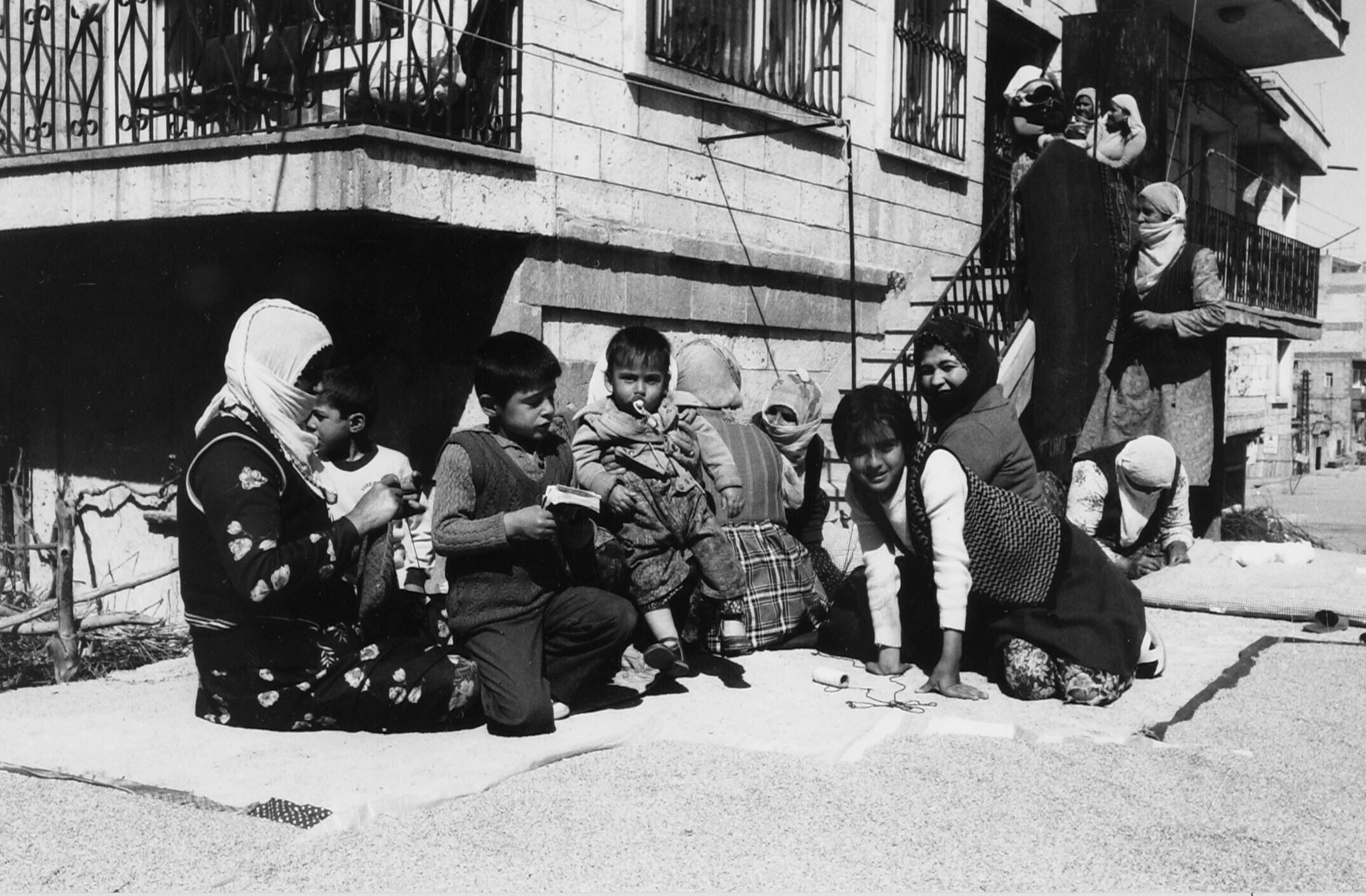Vrouwen en kinderen op plat dak, graan ligt te droge...
