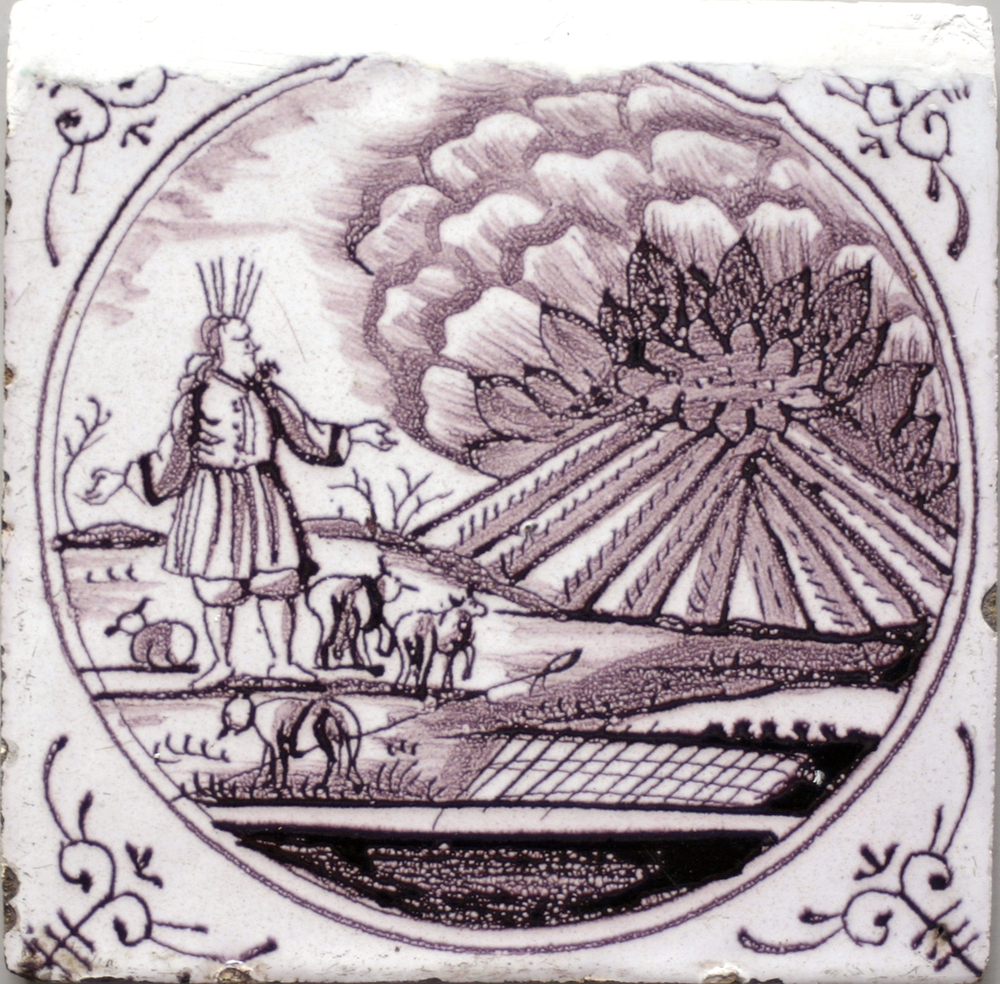 tegel van aardewerk met tinglazuur, voorstellende: m...