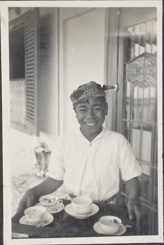 Portret van de Sundanese huisjongen Moelia met een d...