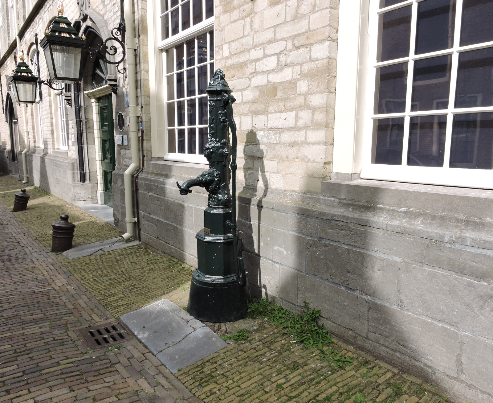 Bewerkte gietijzeren waterpomp tegen de gevel van he...