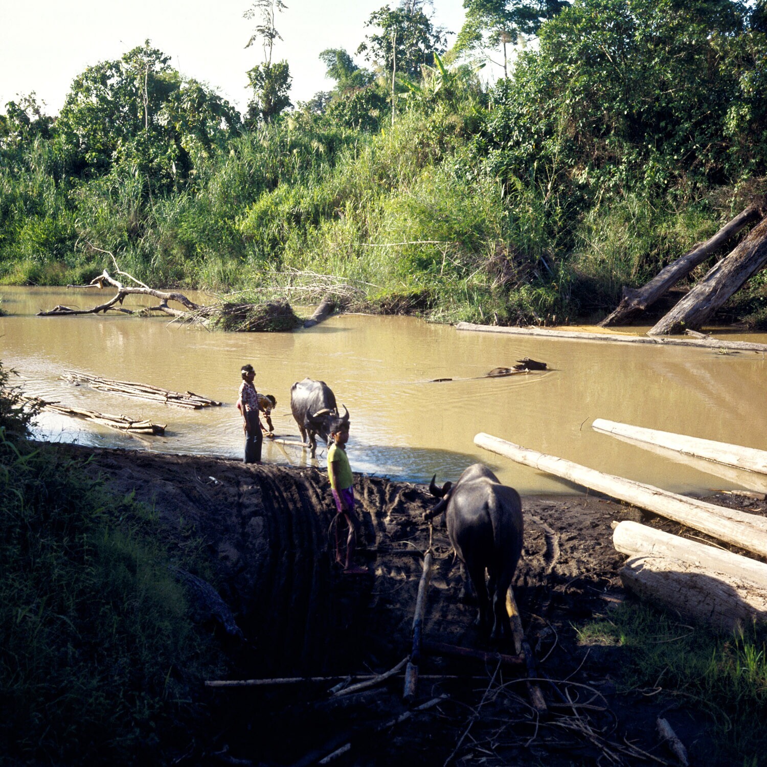 Karbouwen trekken hout bij Basa, Simuloa rivier proj...