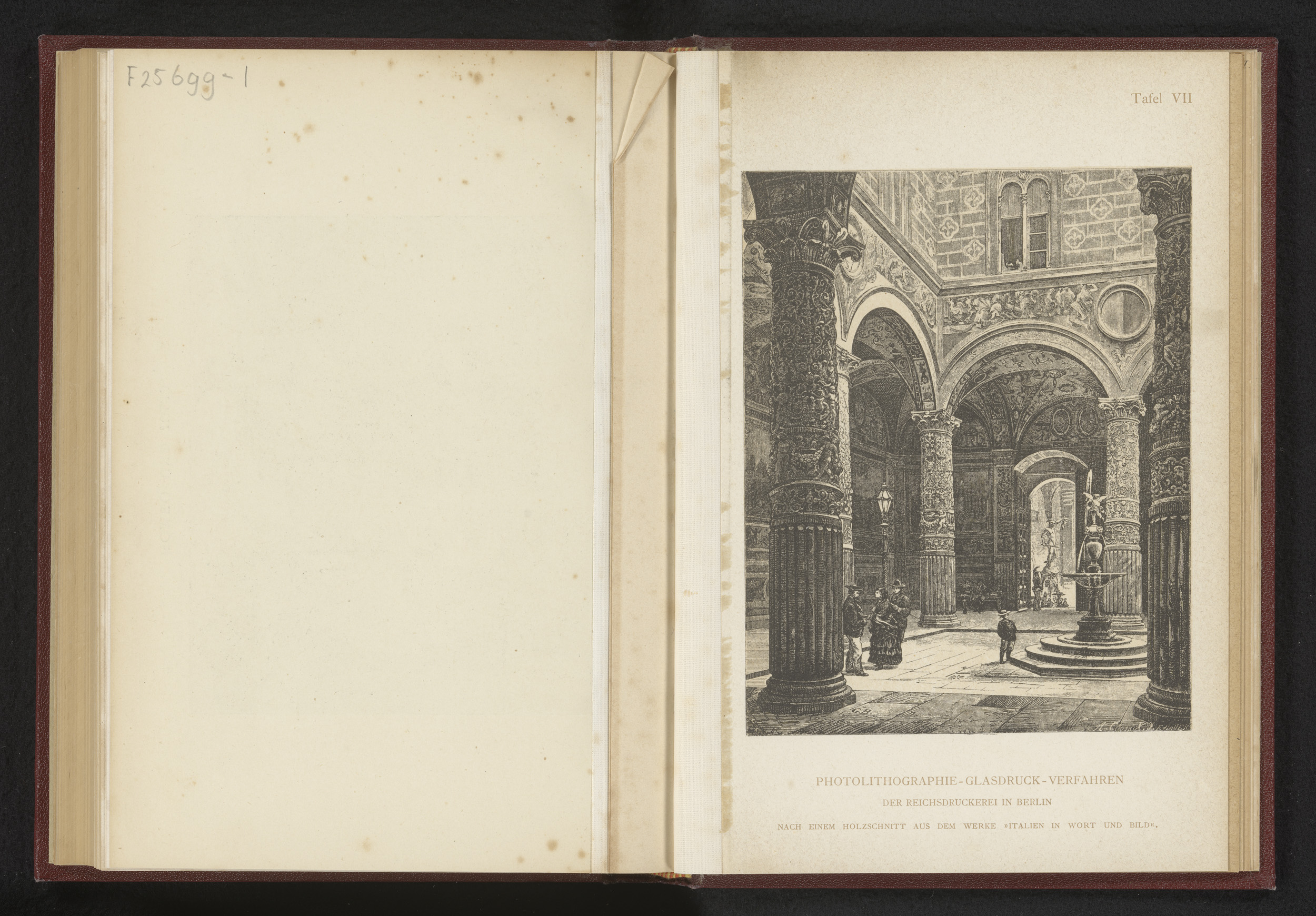 Reproductie van een houtsnede van een binnenplaats m...