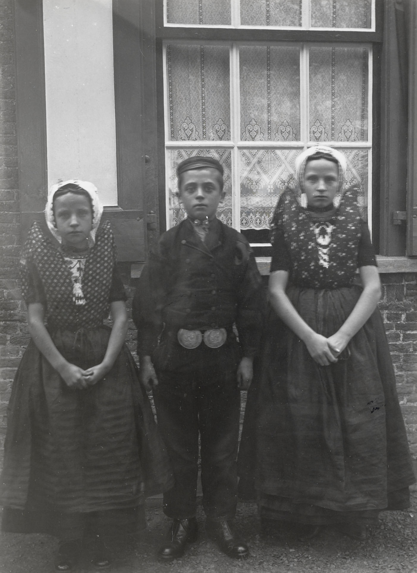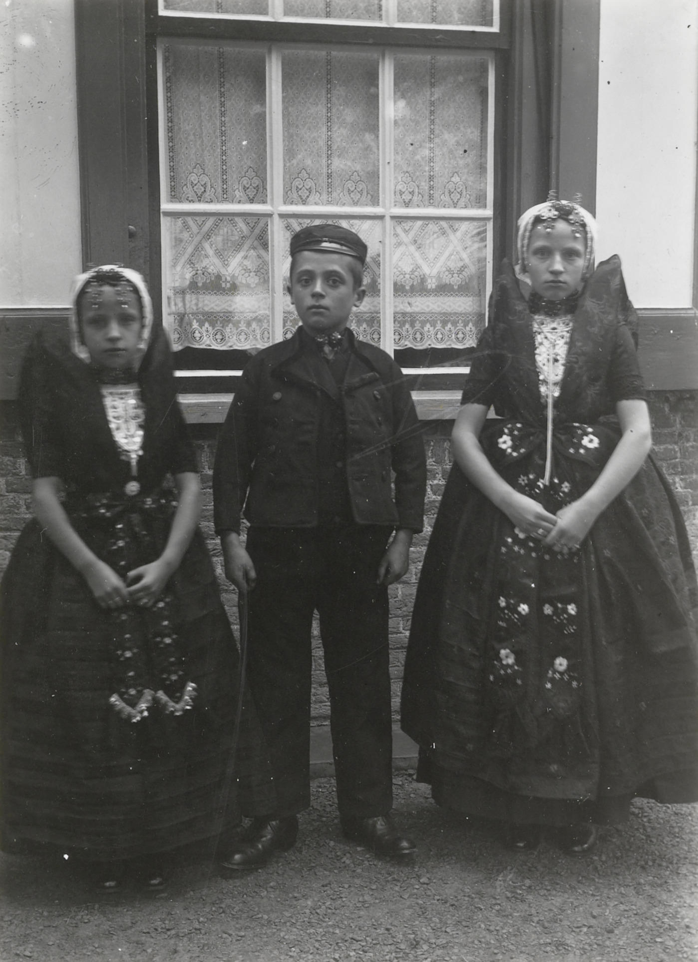Twee meisjes en een jongen in Axelse streekdracht, 1...