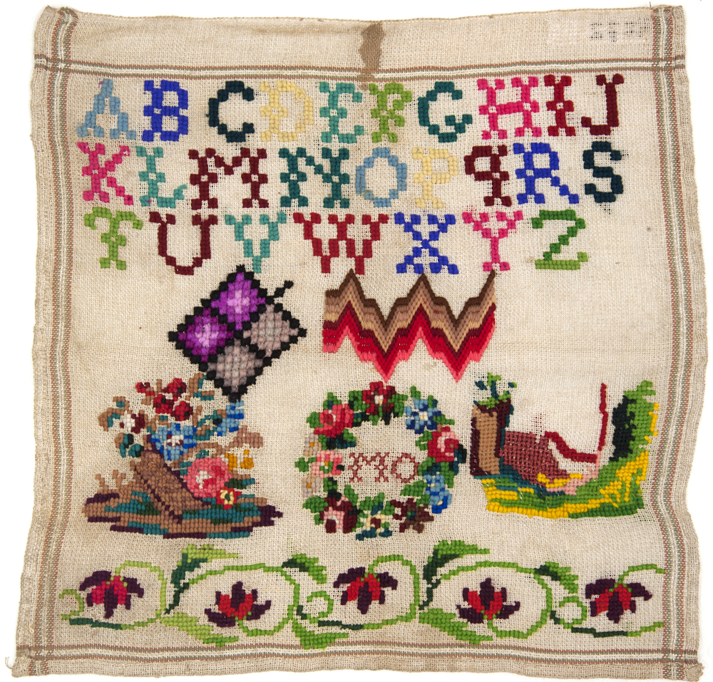 Merklap met initialen, bloemen, motieven en het alfabet