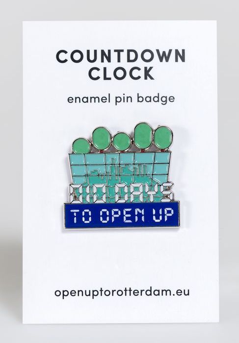 Draagspeld of pin met aftelklok op karton, merchandi...