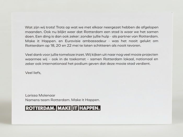 Bedankkaart van Rotterdam Make it Happen voor de med...