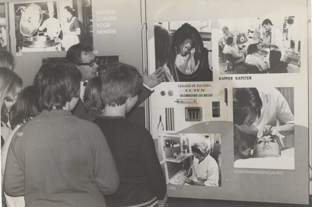 Jongeren bij een beroepenvoorlichting, man vertelt o...