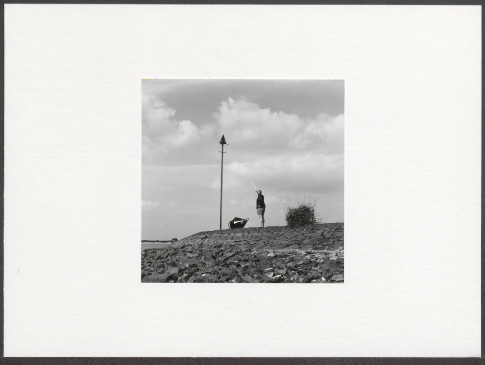Man bij bakens op een strekdam in de rivier, Waal we...