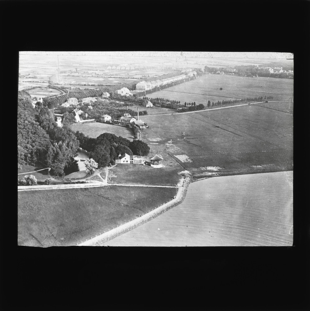 Luchtfoto met de Harmonie, stadsweiden, Stationslaan...