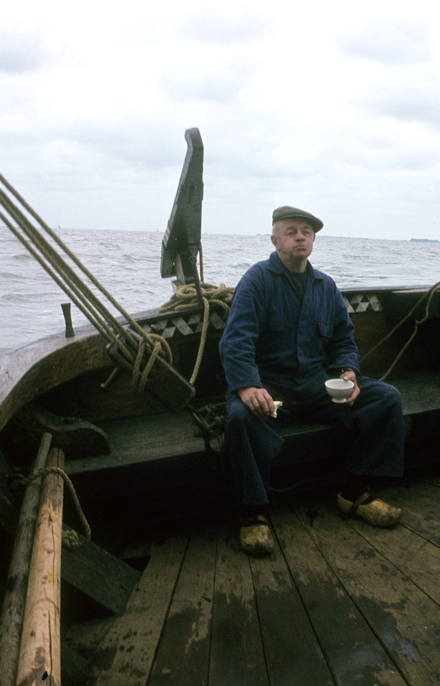 Een visserman drinkt koffie aan boord van een botter...