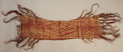 : Silk (ground and lining) with several types of metal thread; metal thread lace and plaited band and sequins; linen (interlining) (1)