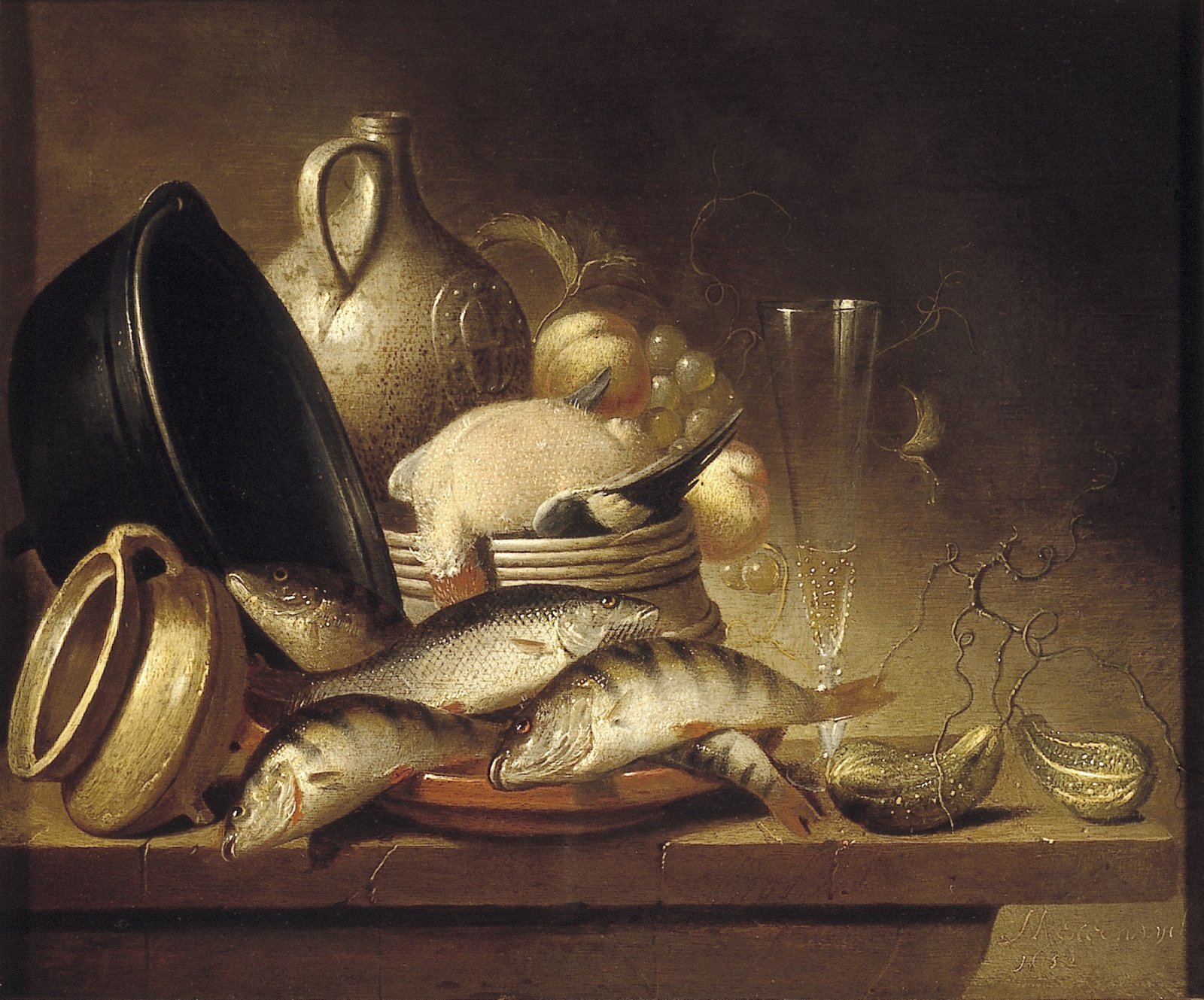Stilleven met vis, kookpot en andere objecten