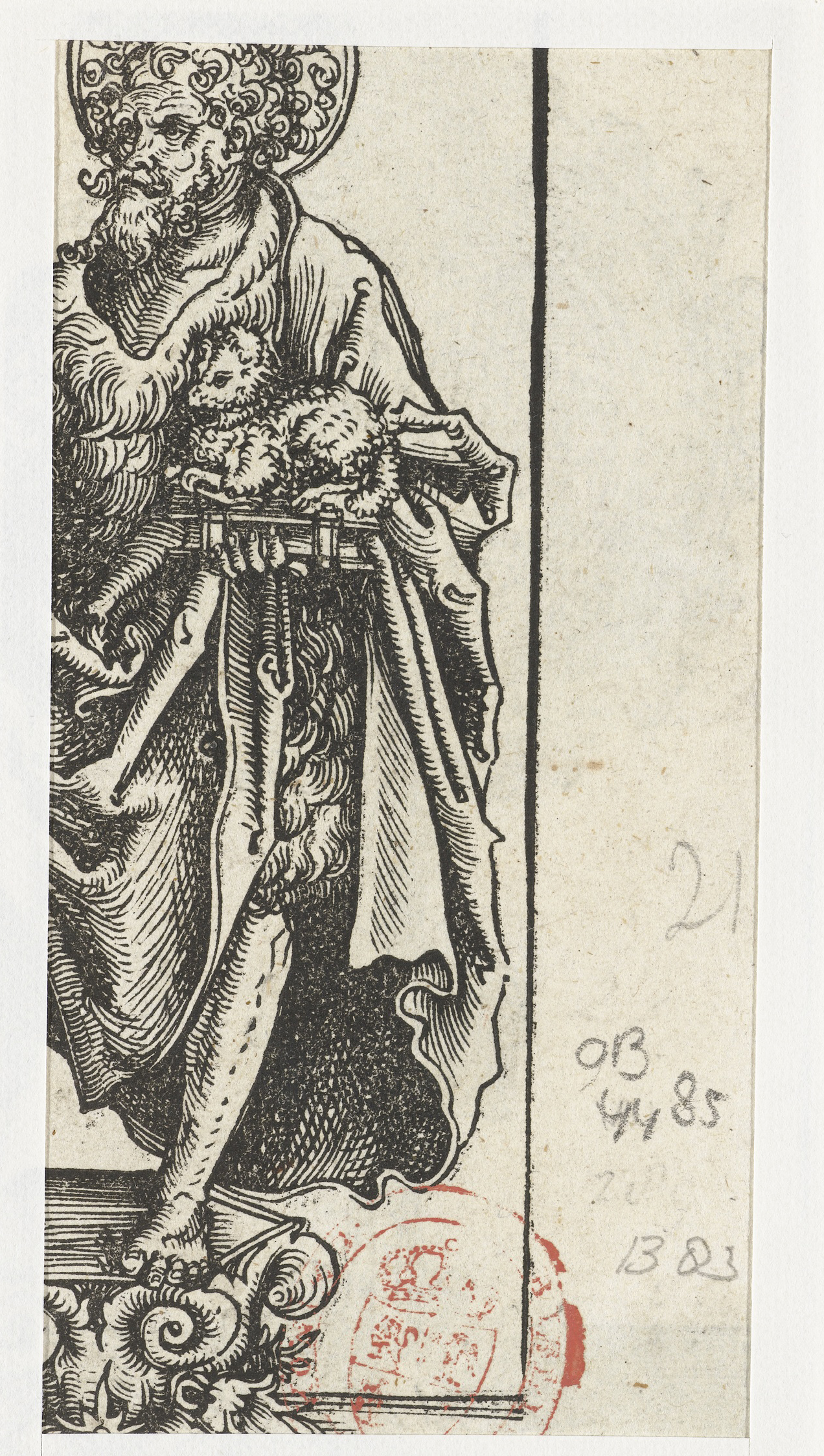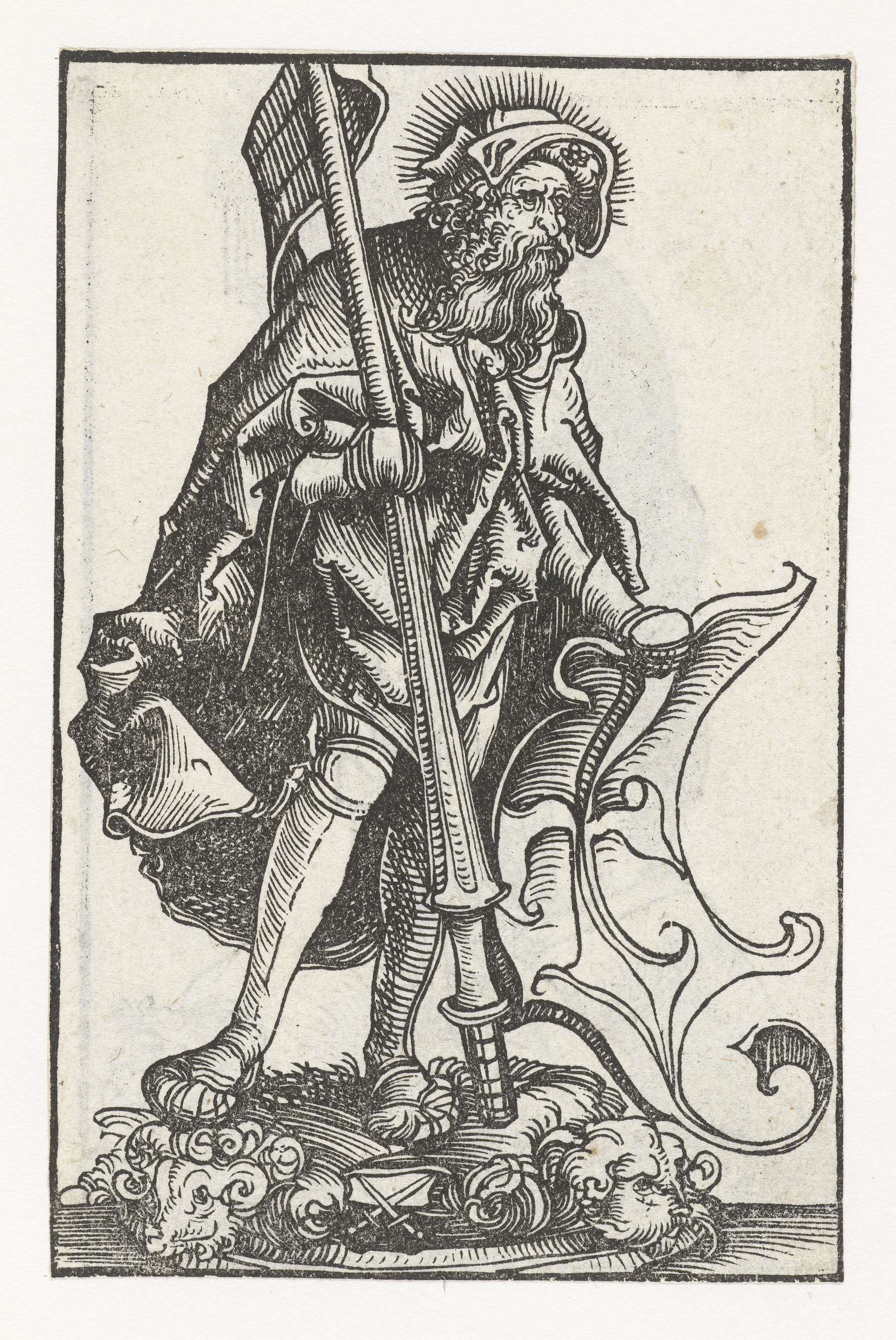 Beeld met Jakobus de Mindere met hoedenmakersboog
