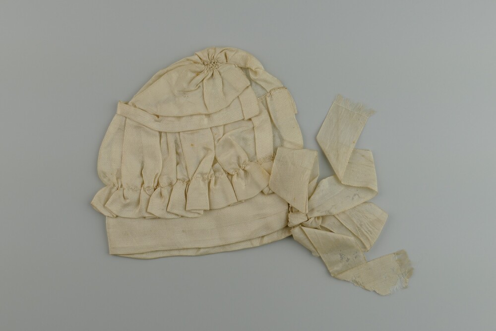 proeflap van kunstzijde voorstellende een babymuts, ...