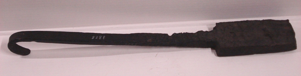 Langwerpige ruwe ijzeren pin, bovenaan gekruld en on...