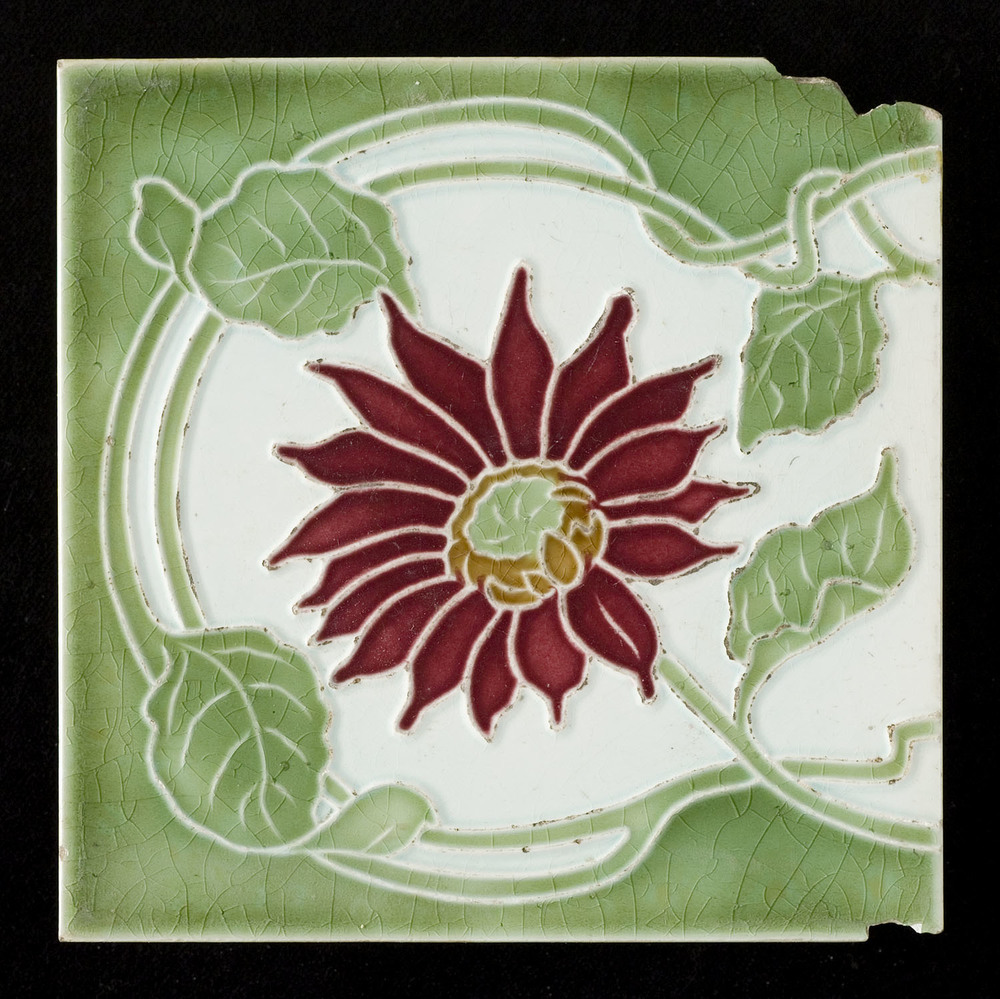 Tegel in reliëf, met voorstelling: paarsrode bloem, ...