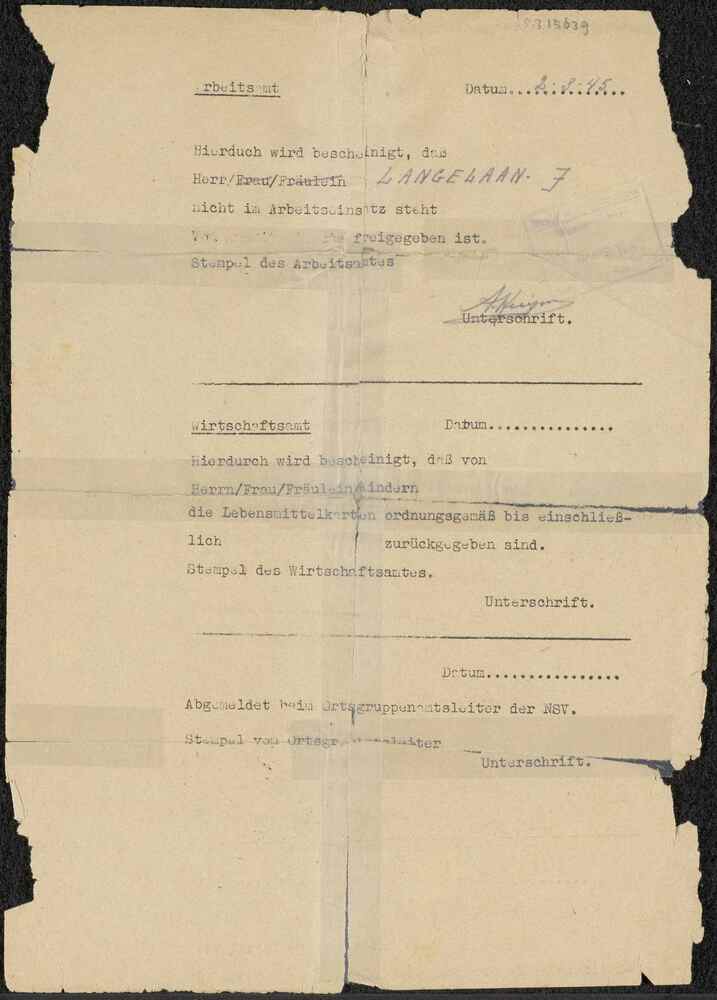 Verklaring dat J. Langelaan niet "im Arbeitseinsatz ...
