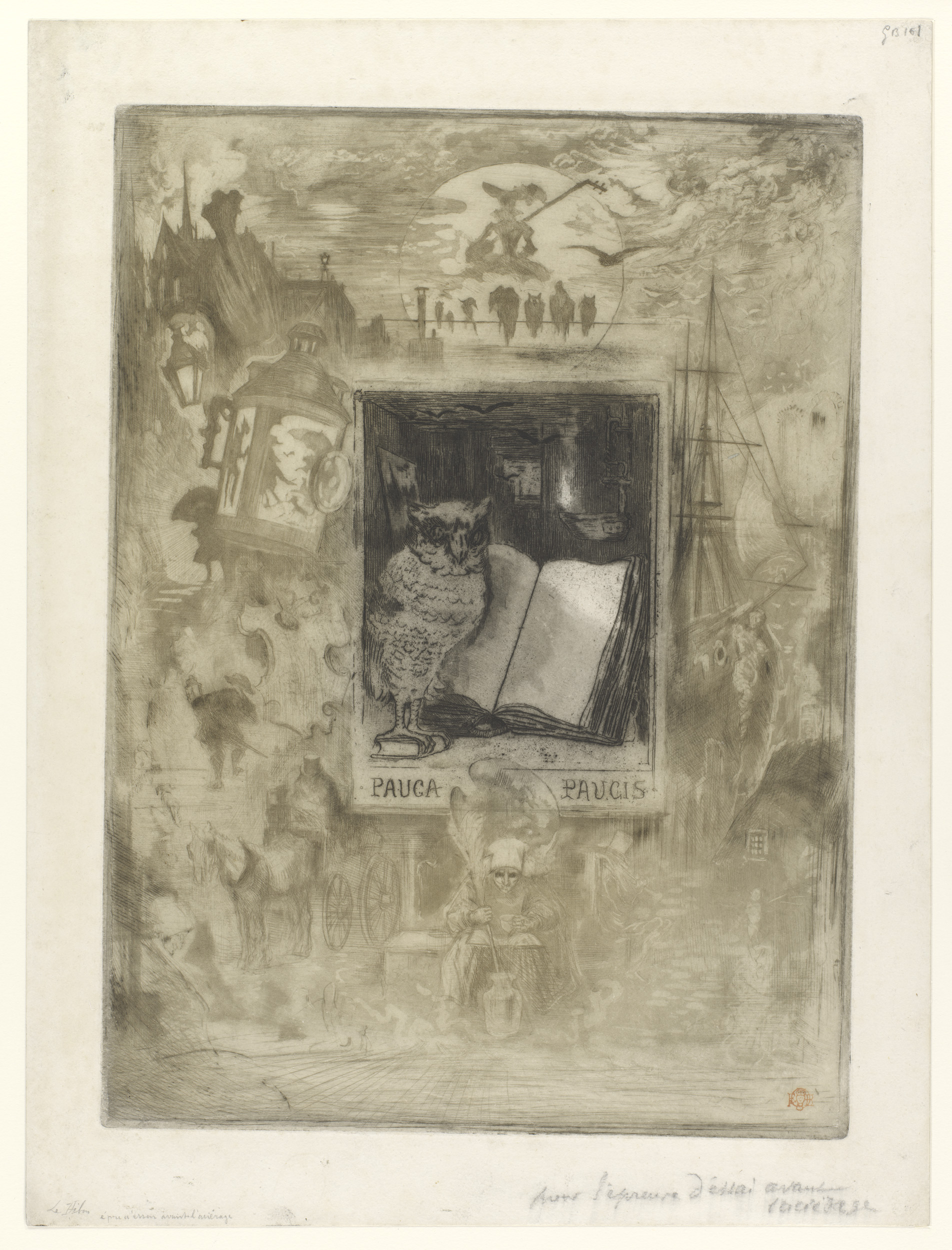 Uil bij een opengeslagen boek, omringd door illustra...