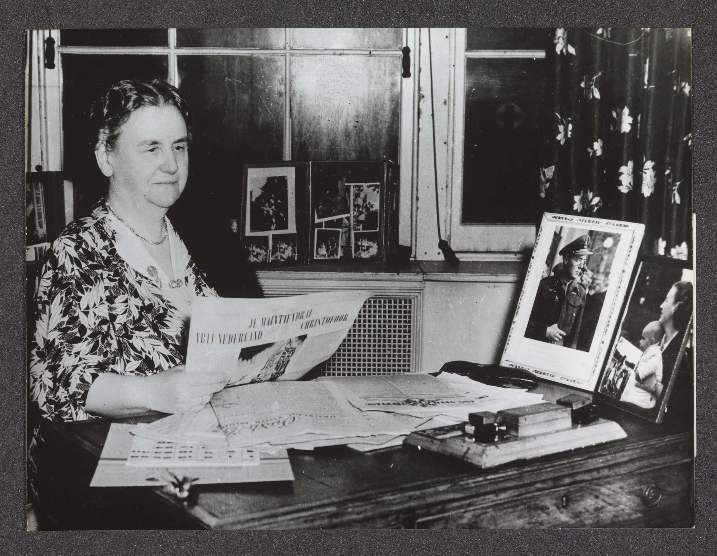 Koningin Wilhelmina leest een Nederlands verzetsblad...