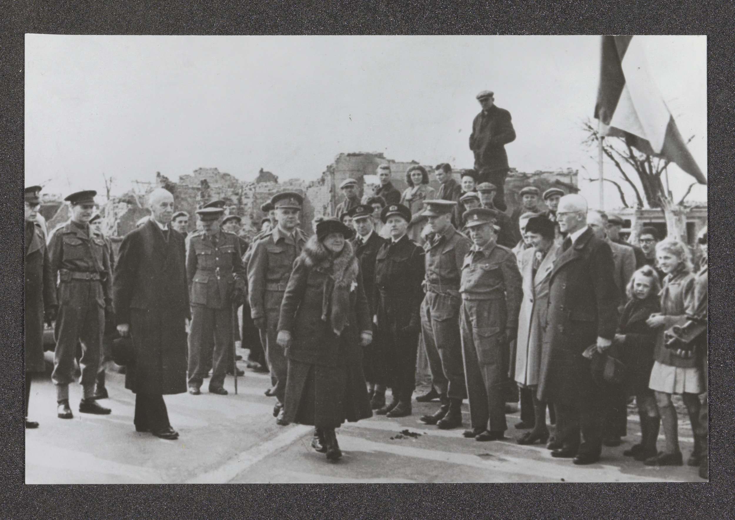 Koningin Wilhelmina loopt langs een haag militairen ...