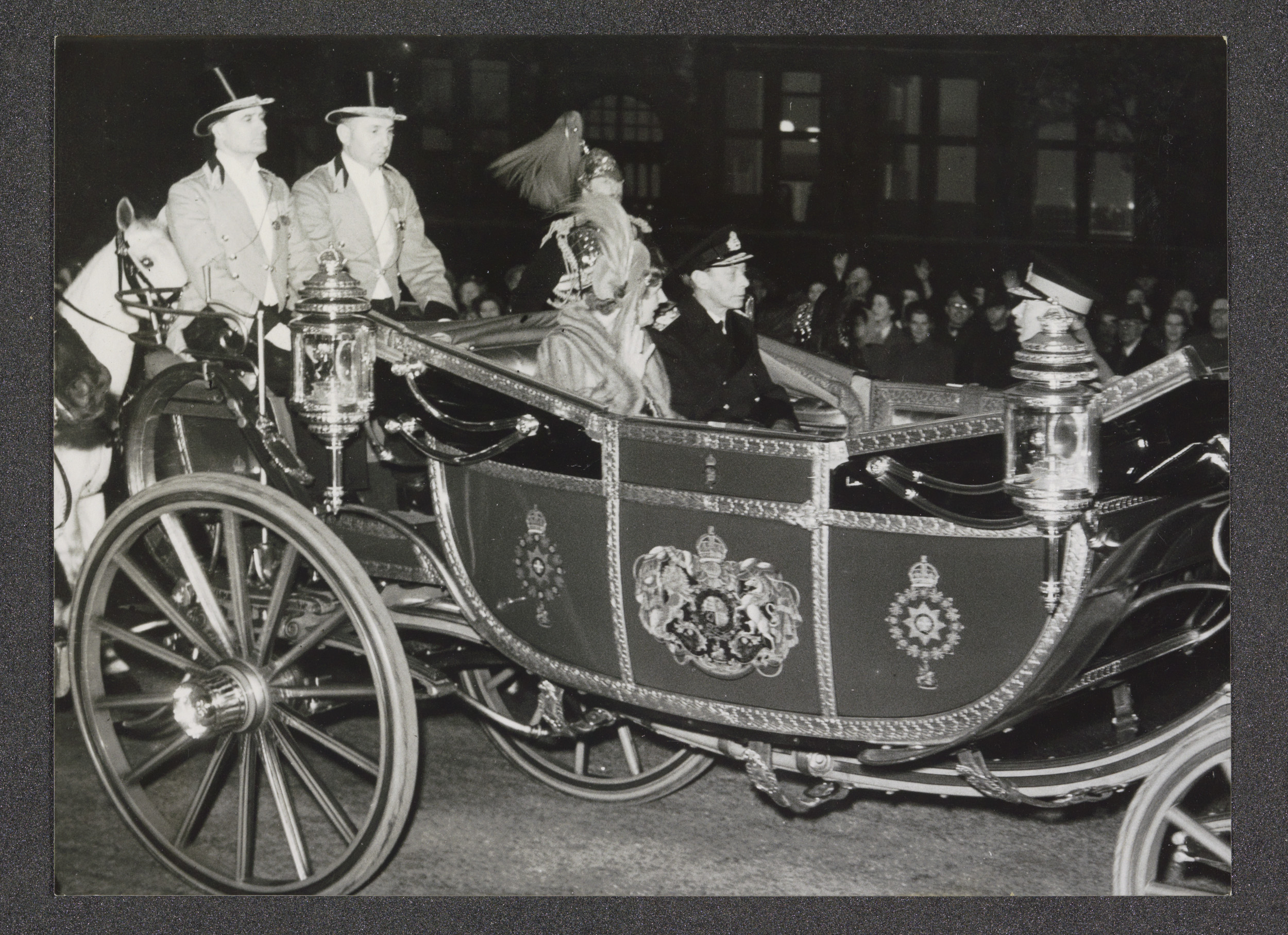 Lijkkoets met de kist met koningin Wilhelmina met ge...