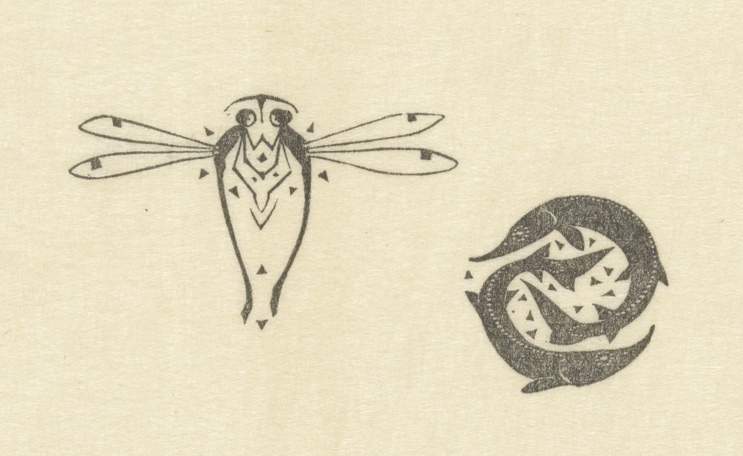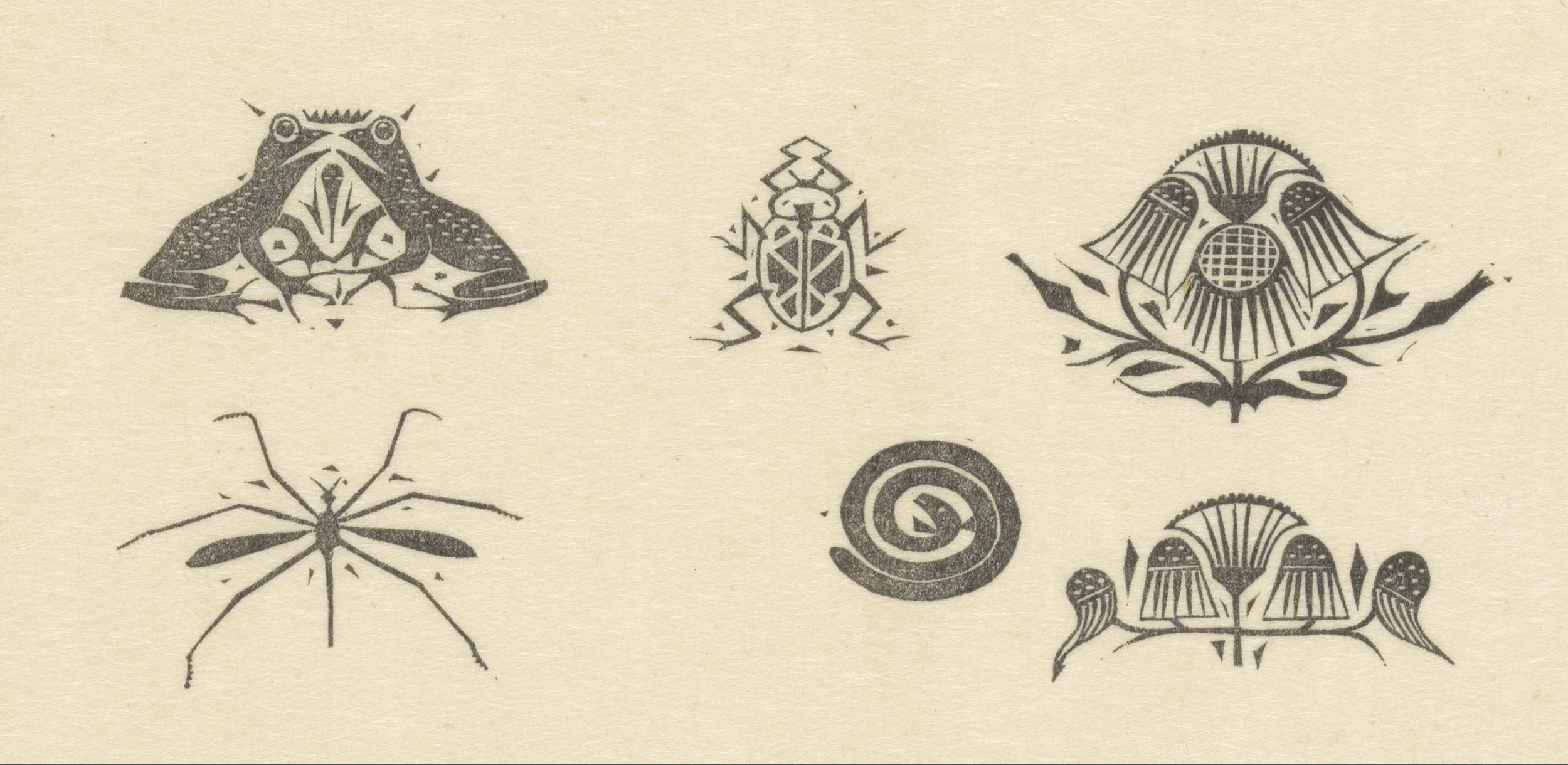 Vignetten met kikkers, kever, bloemen, langpootmug e...