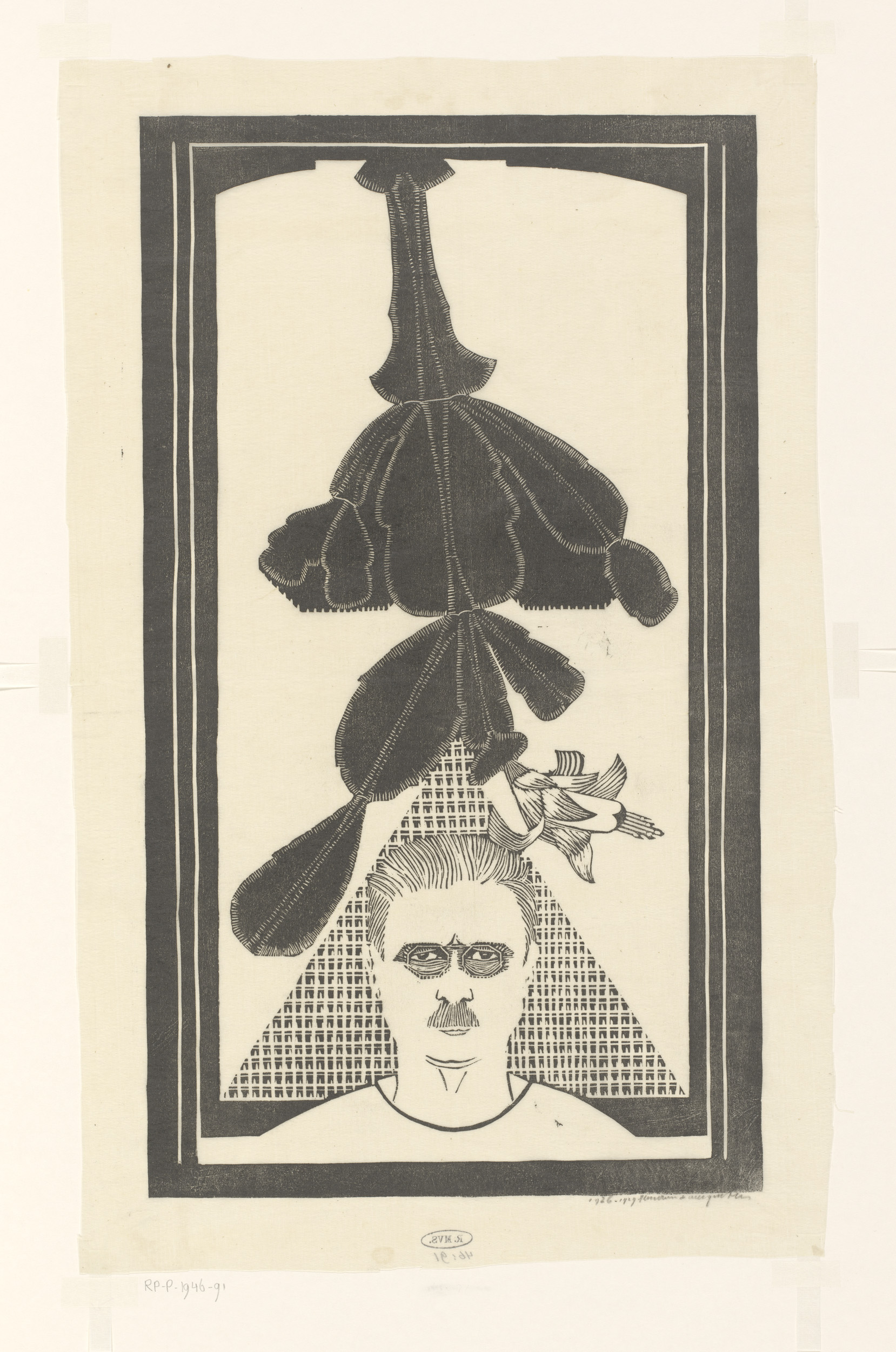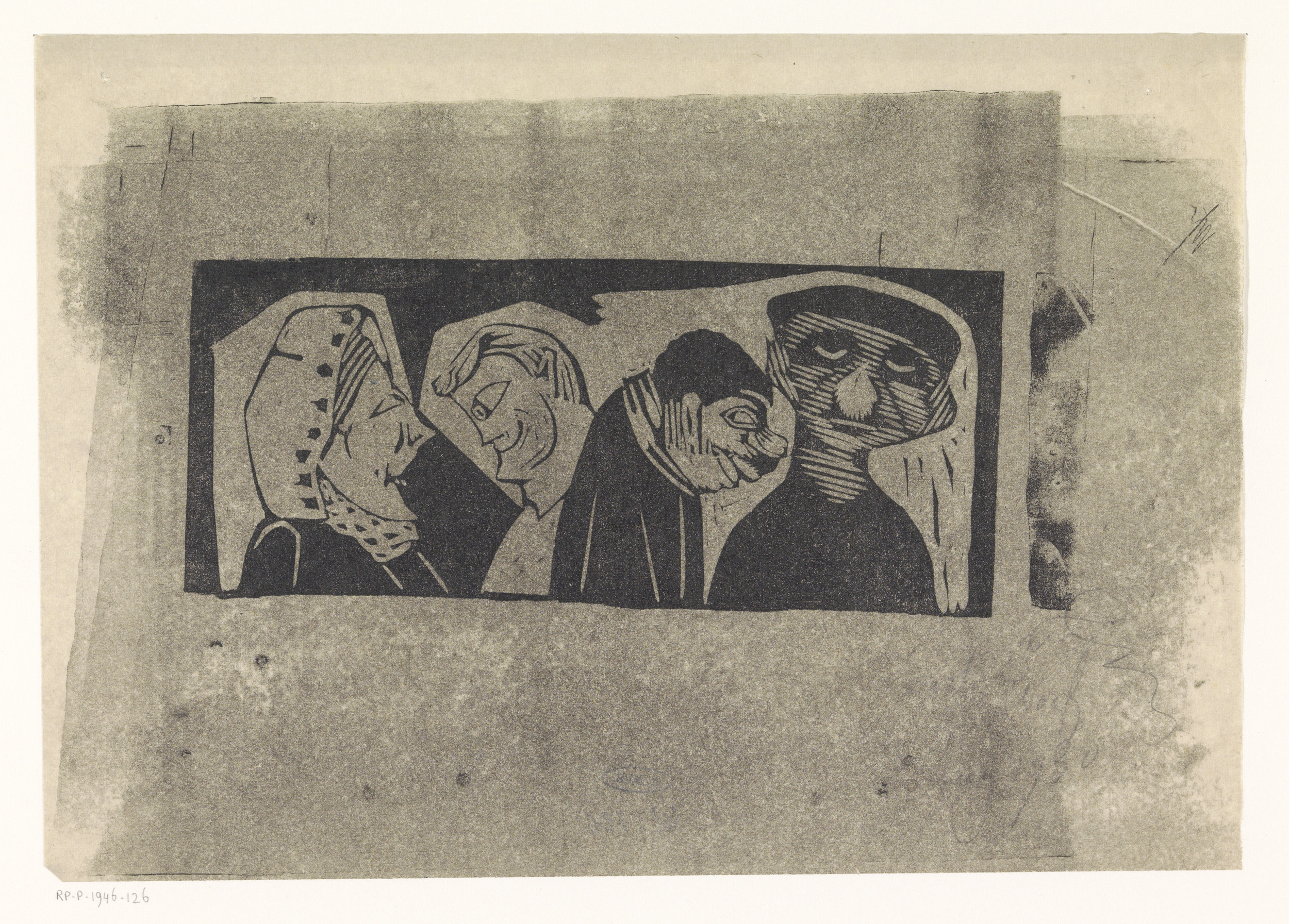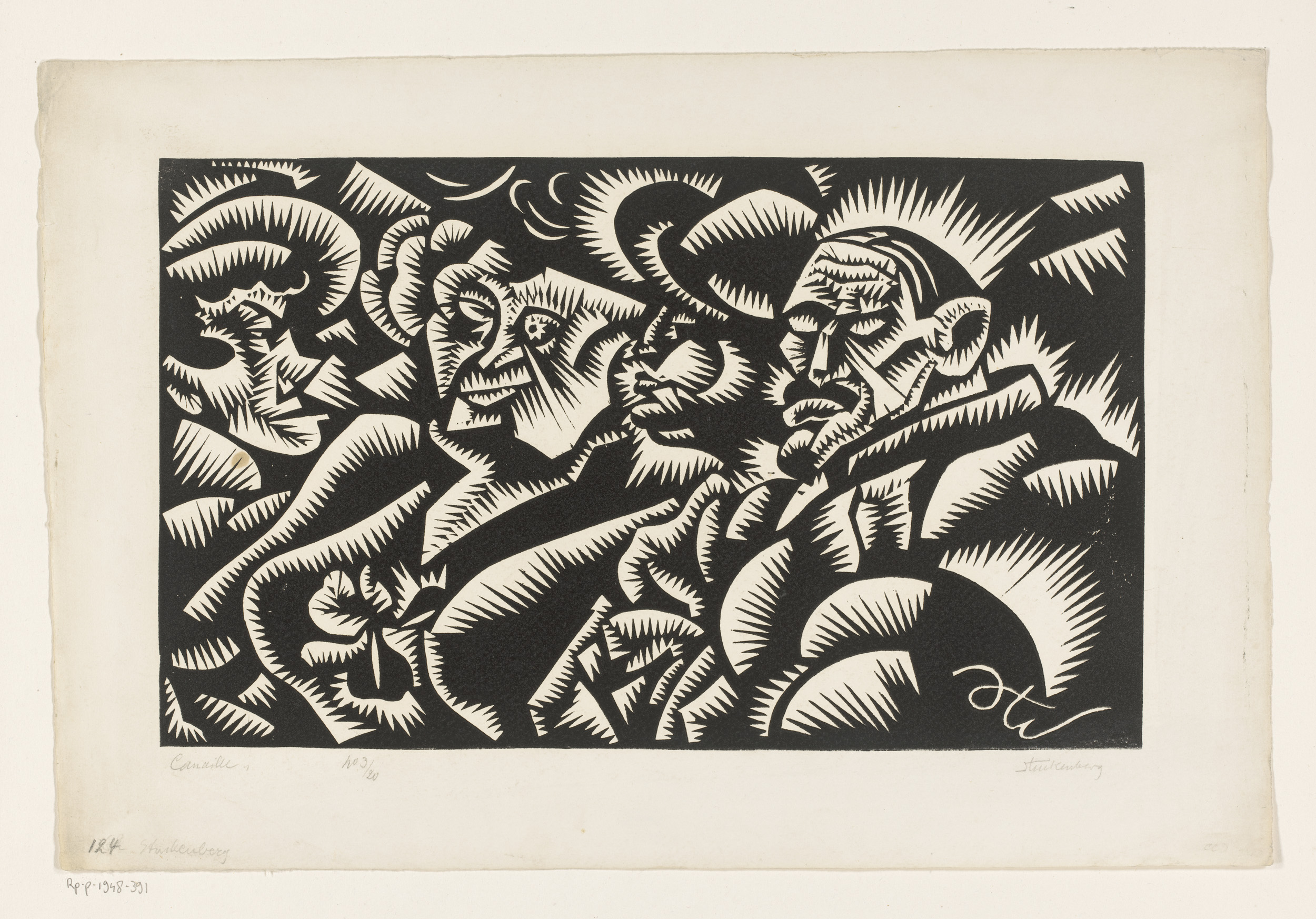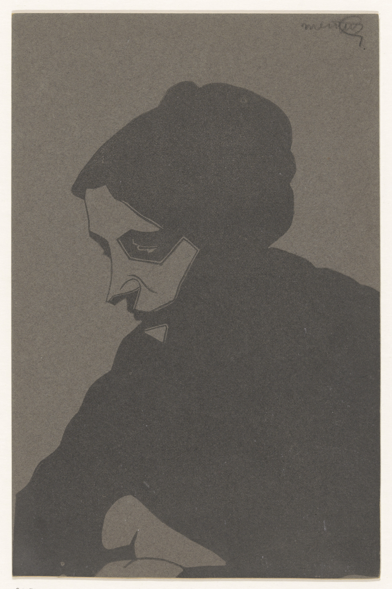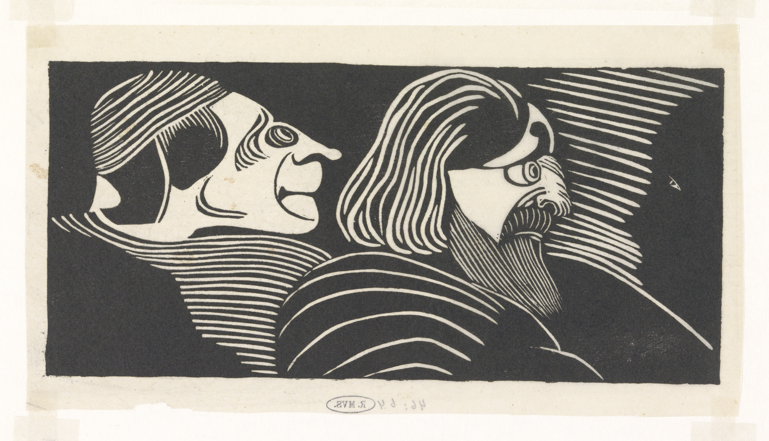 Fantasie: twee mannenkoppen in profiel naar links, l...