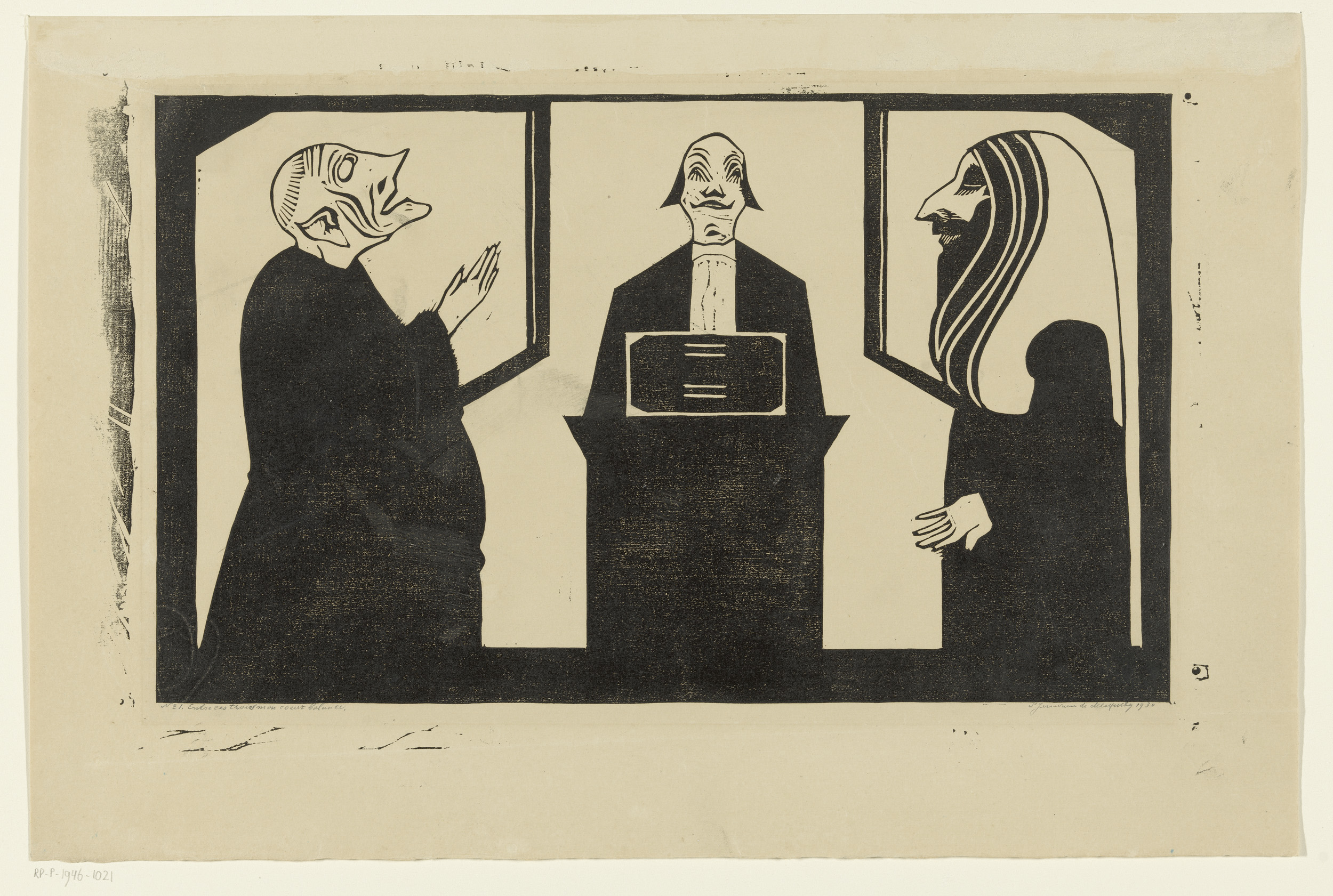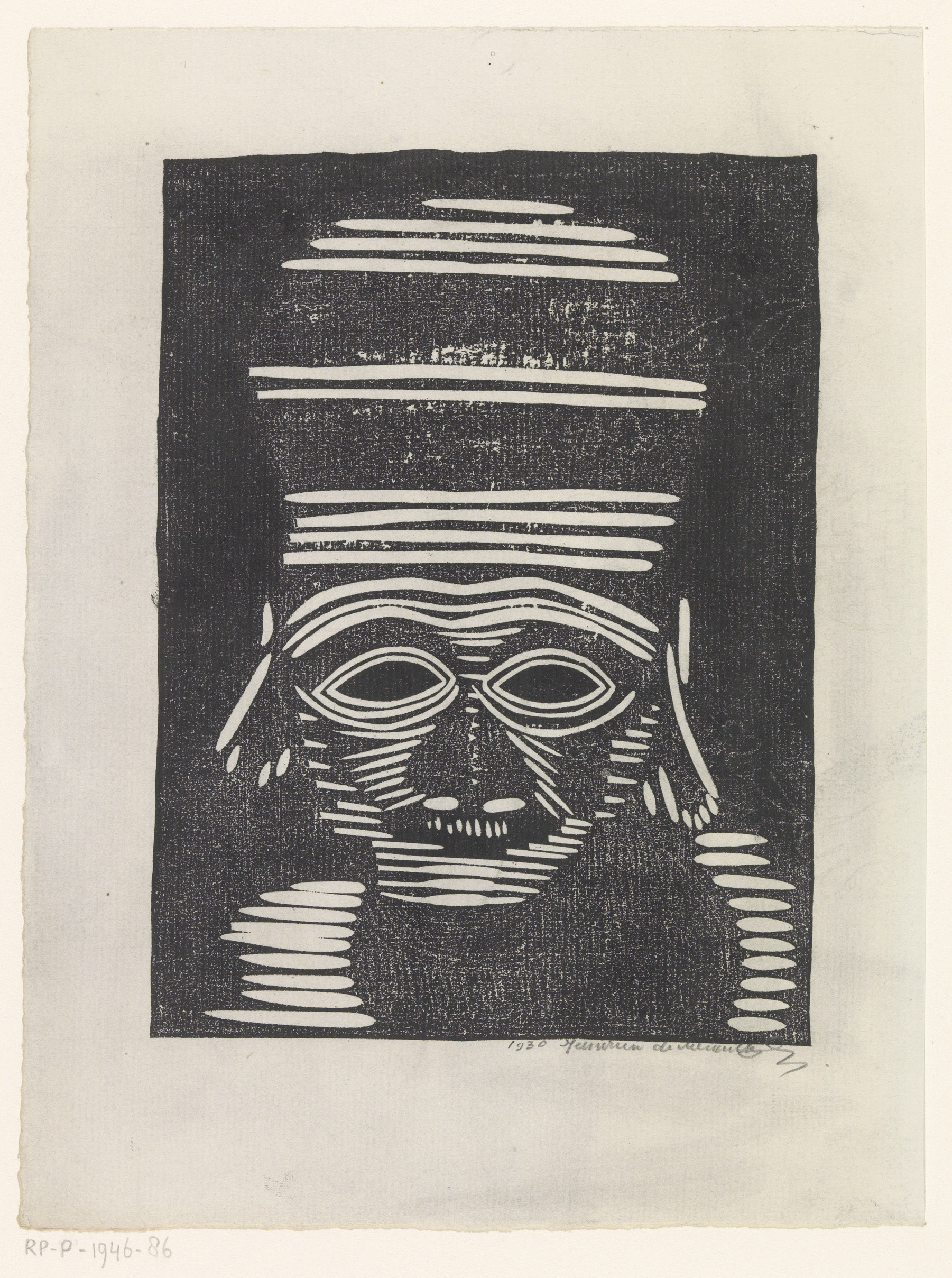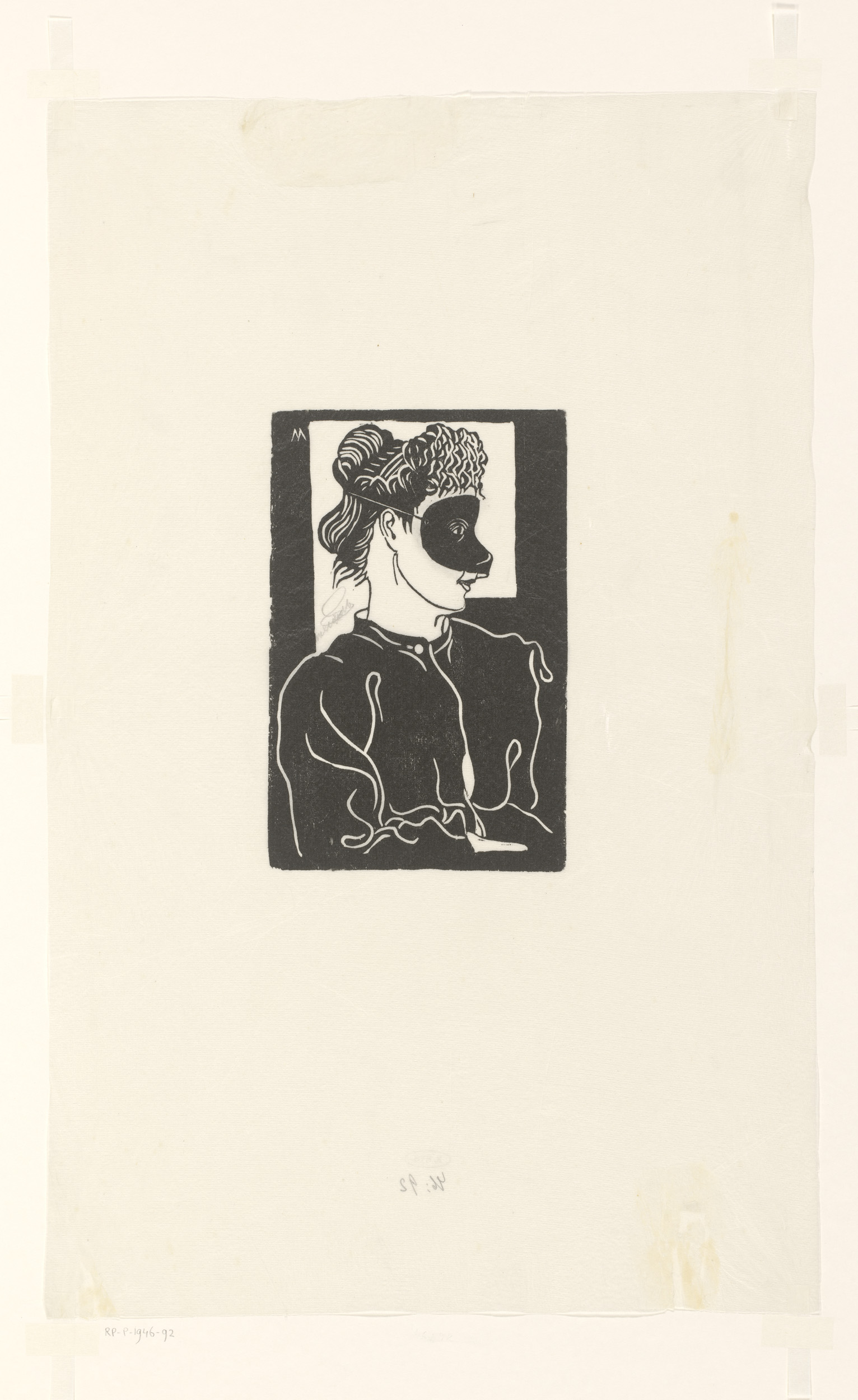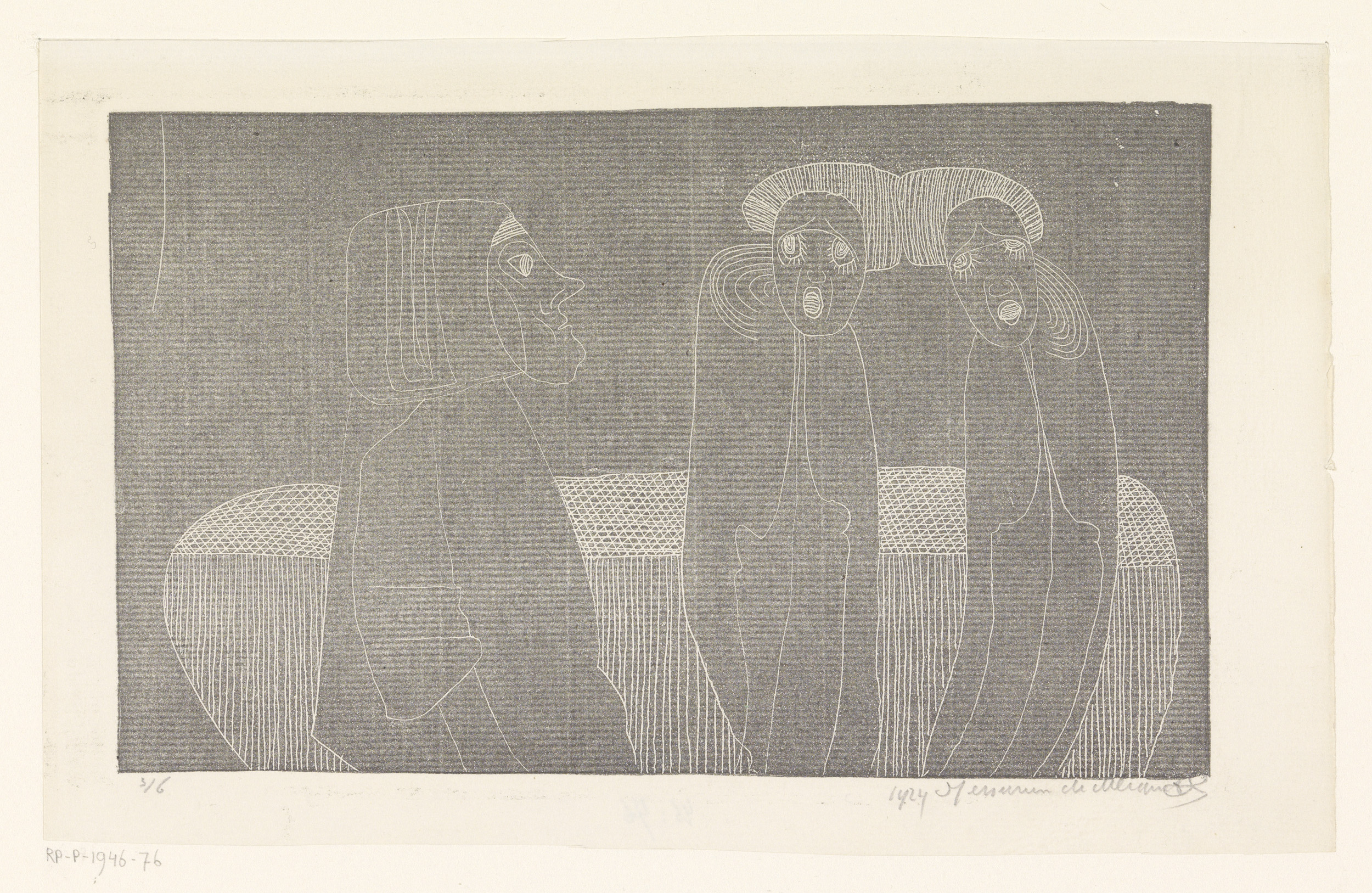 Fantasie: twee mannenkoppen in profiel naar links, l...