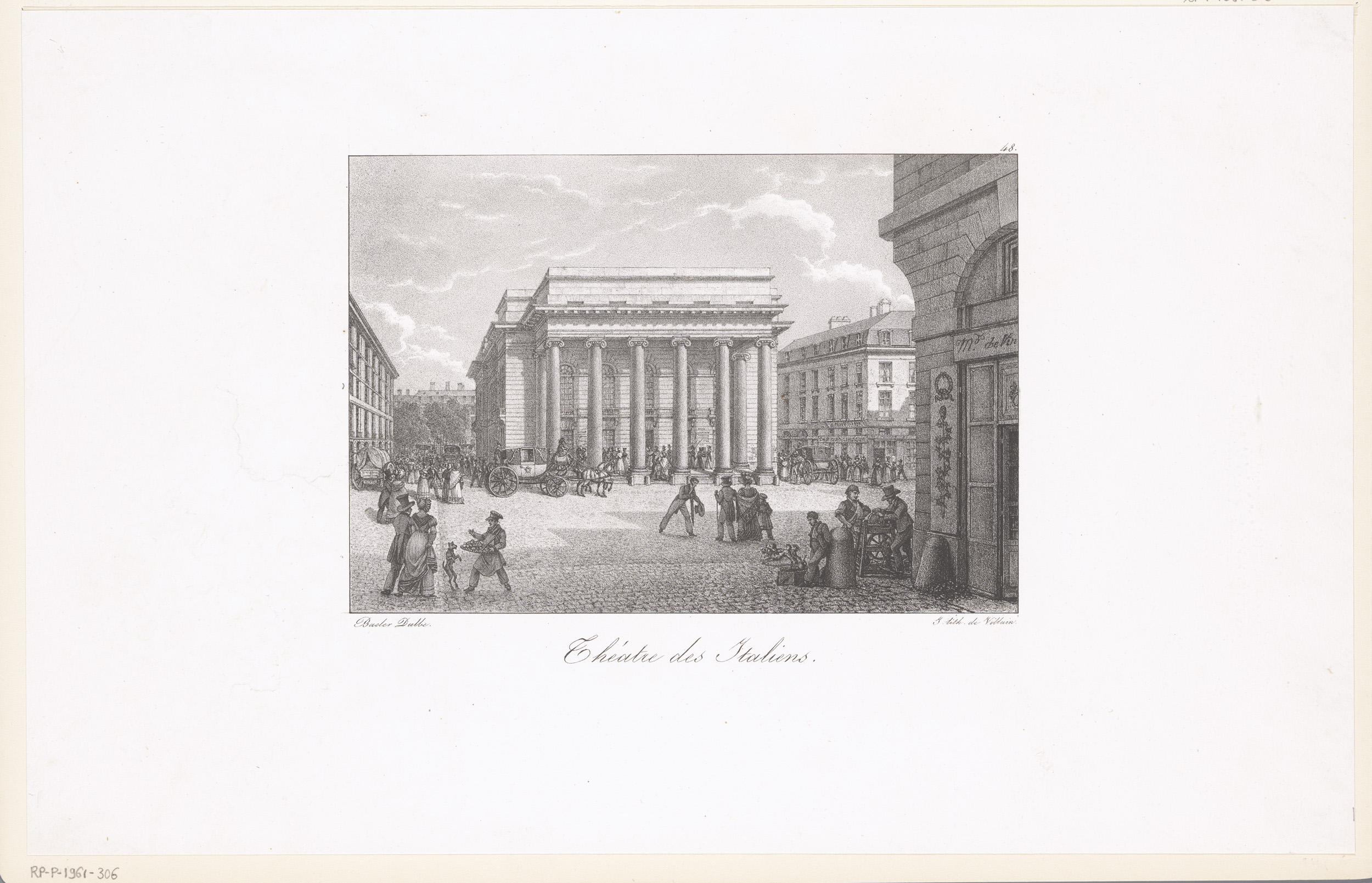 Zicht op het Théâtre des Italiens aan de Rue Favart ...