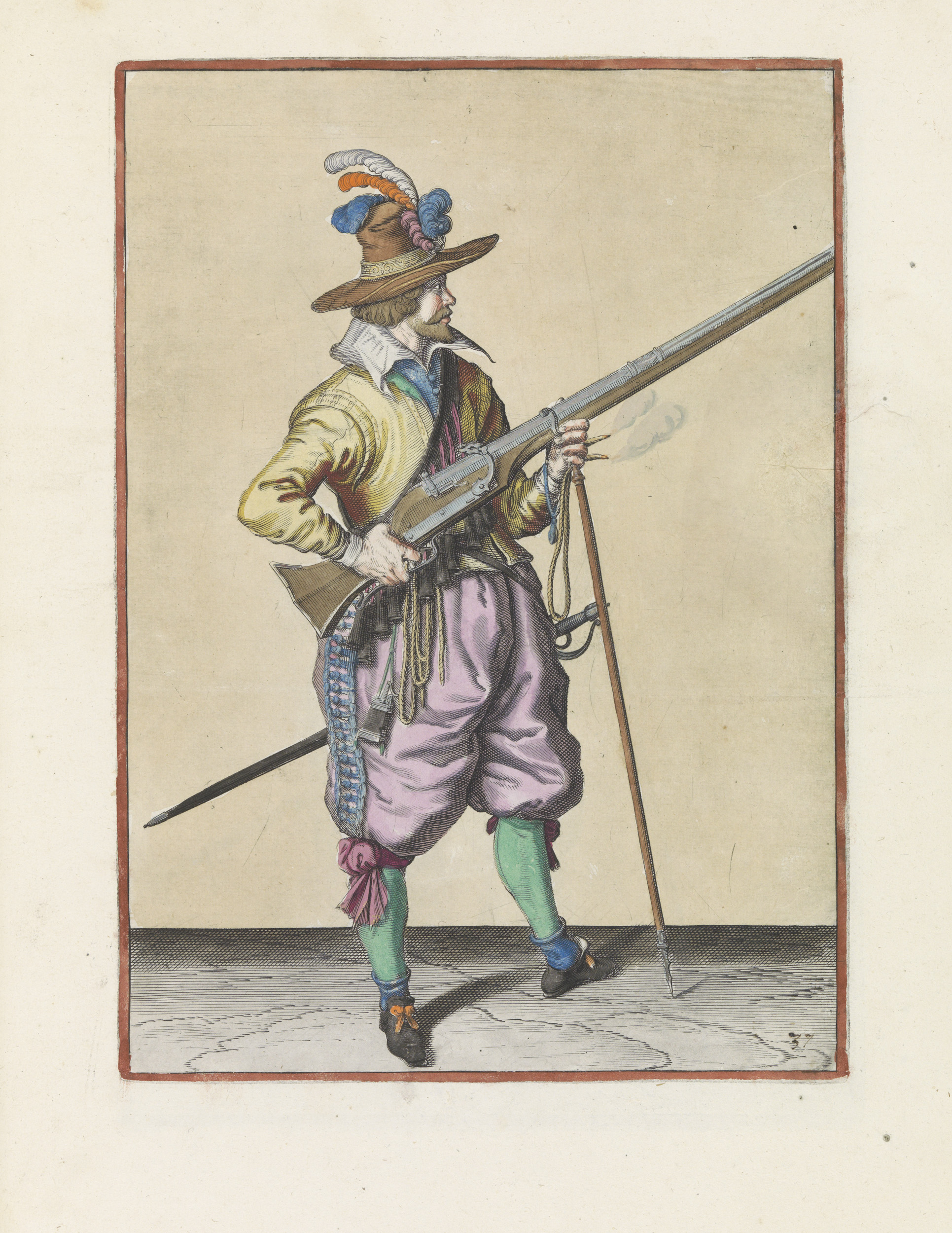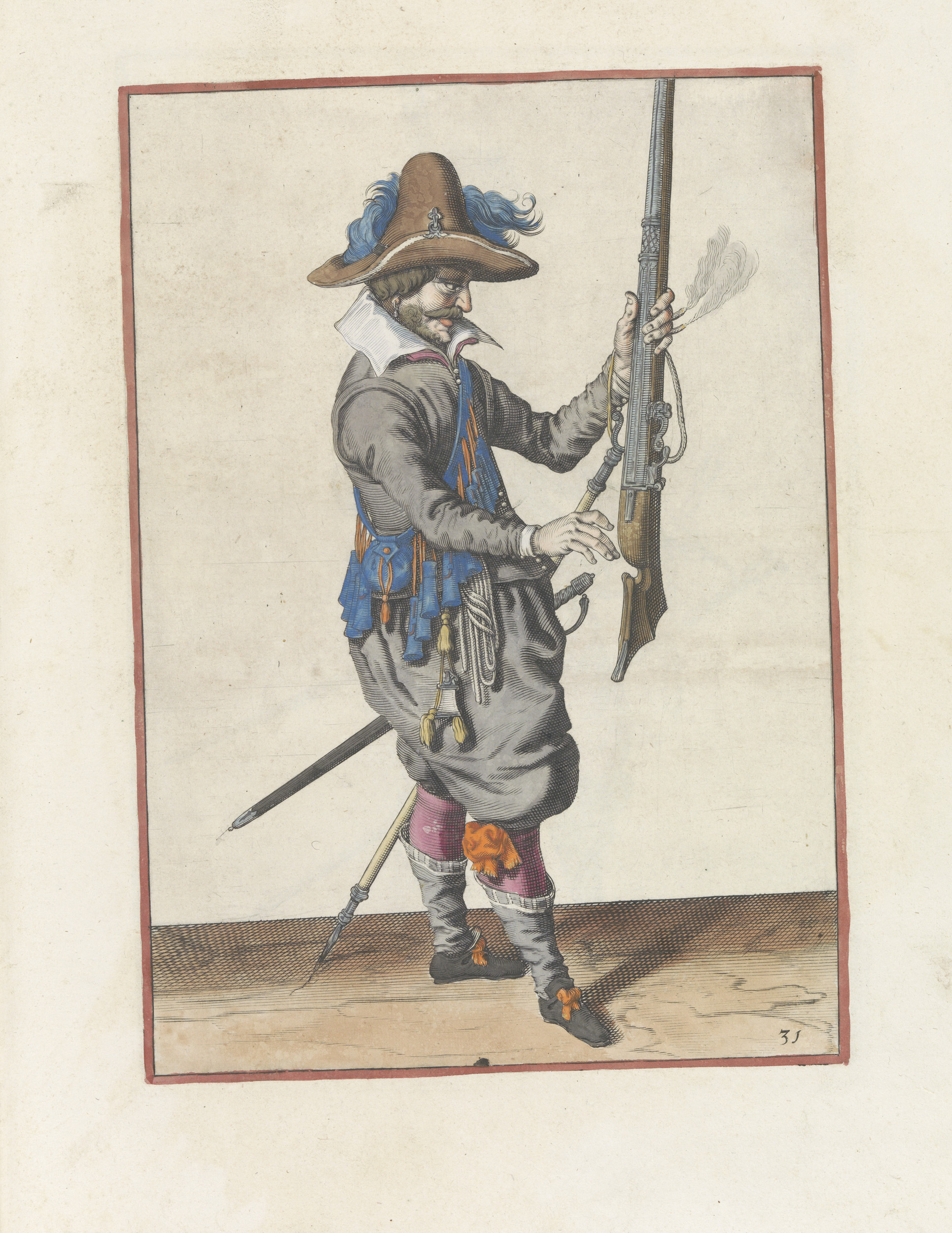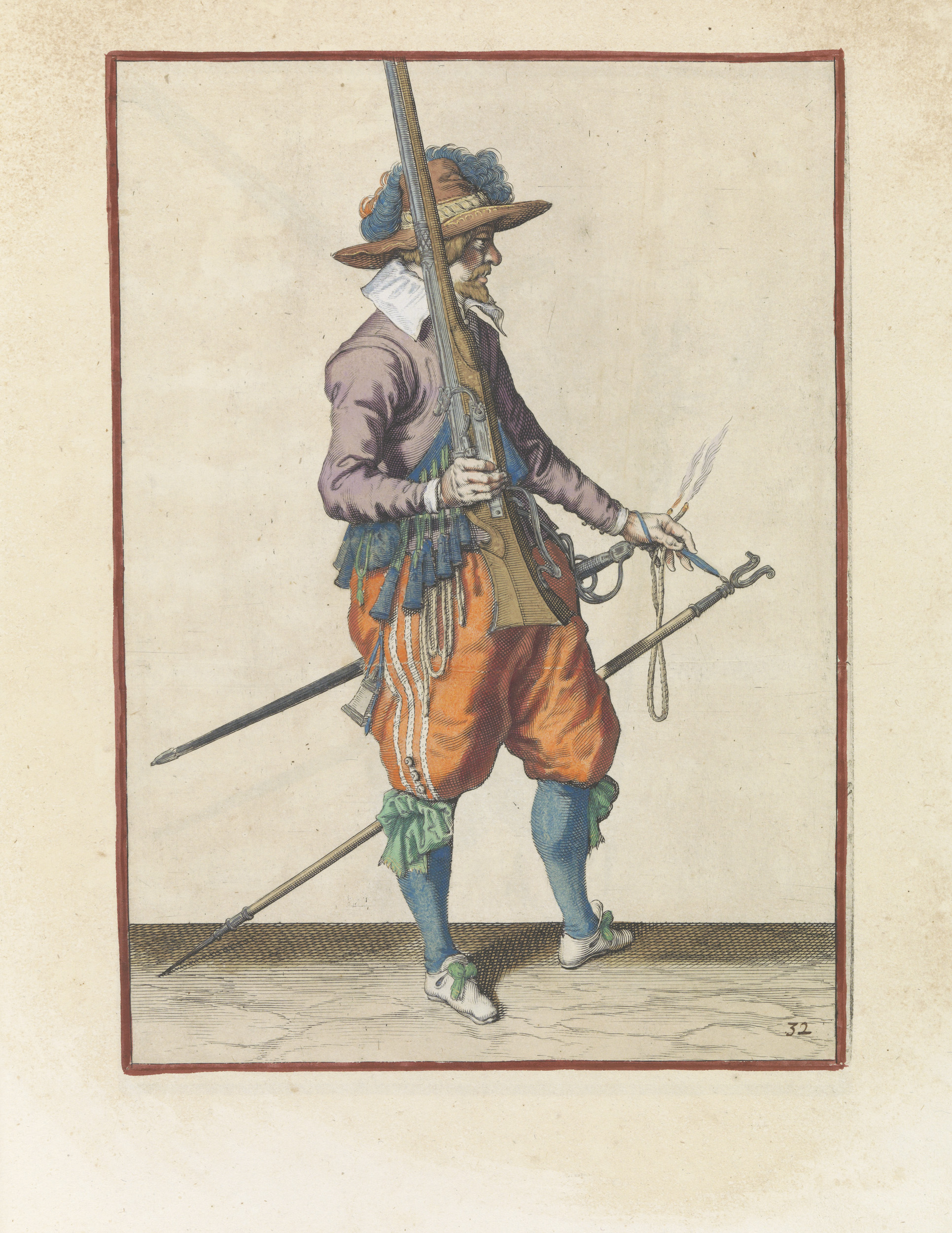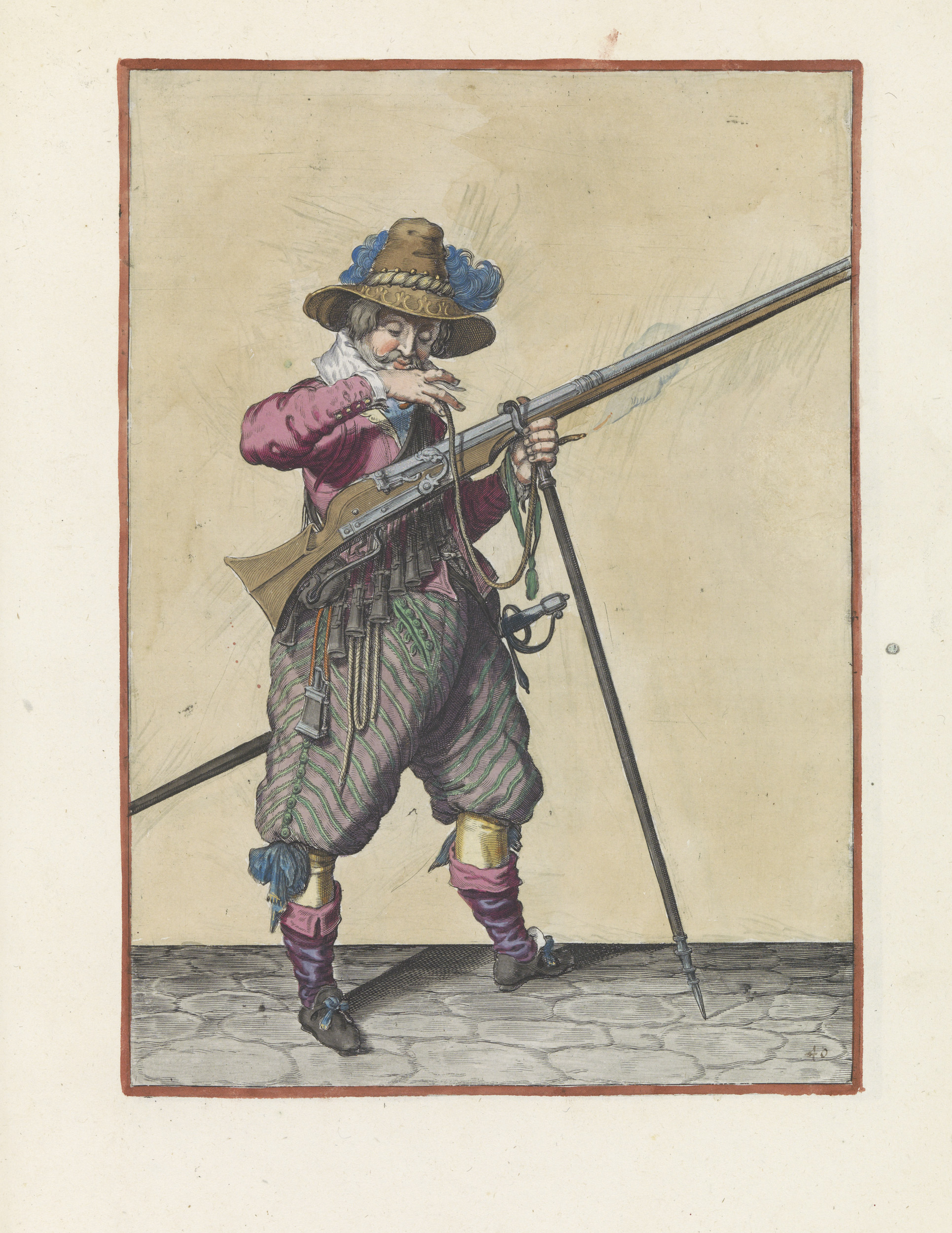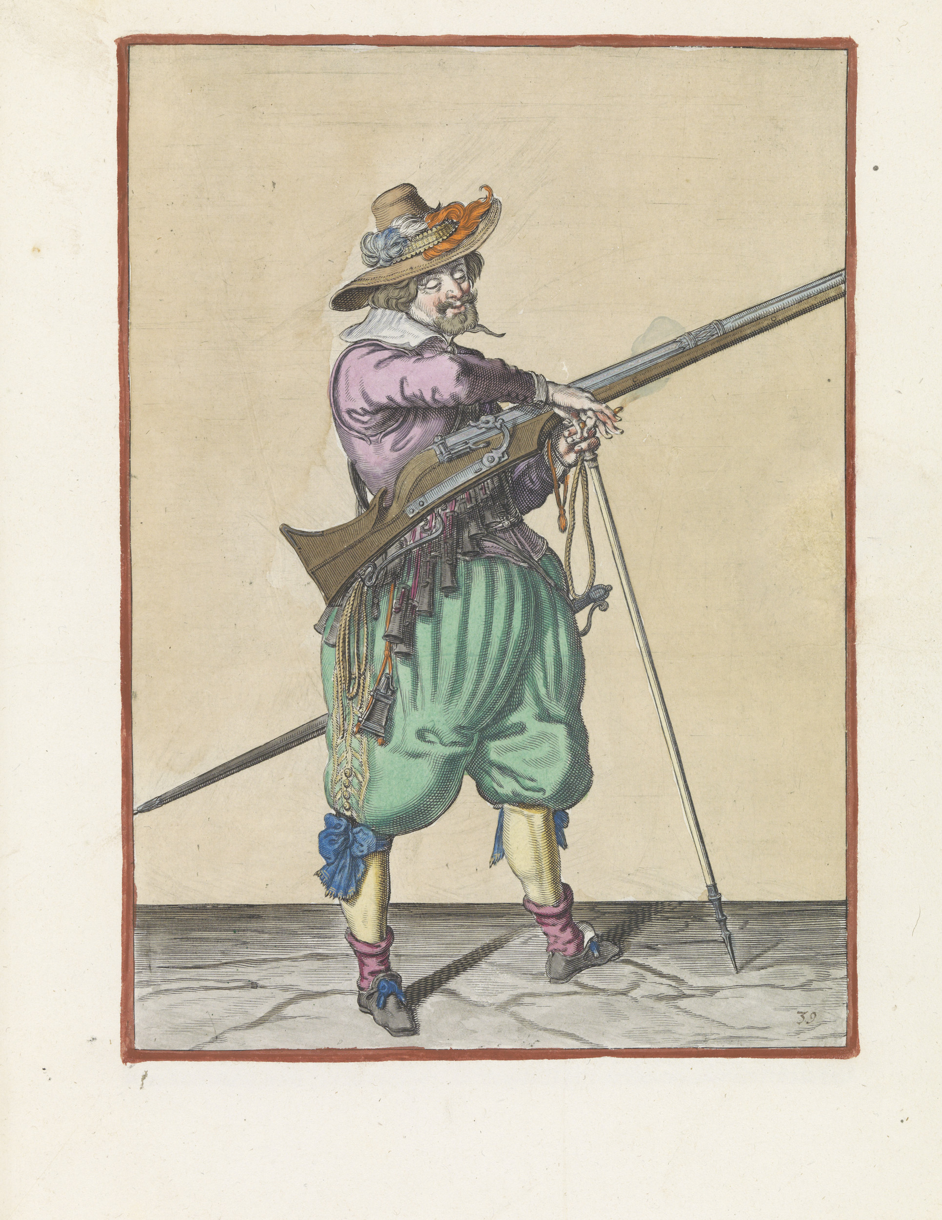 Soldaat die zijn musket, steunend op zijn furket, af...