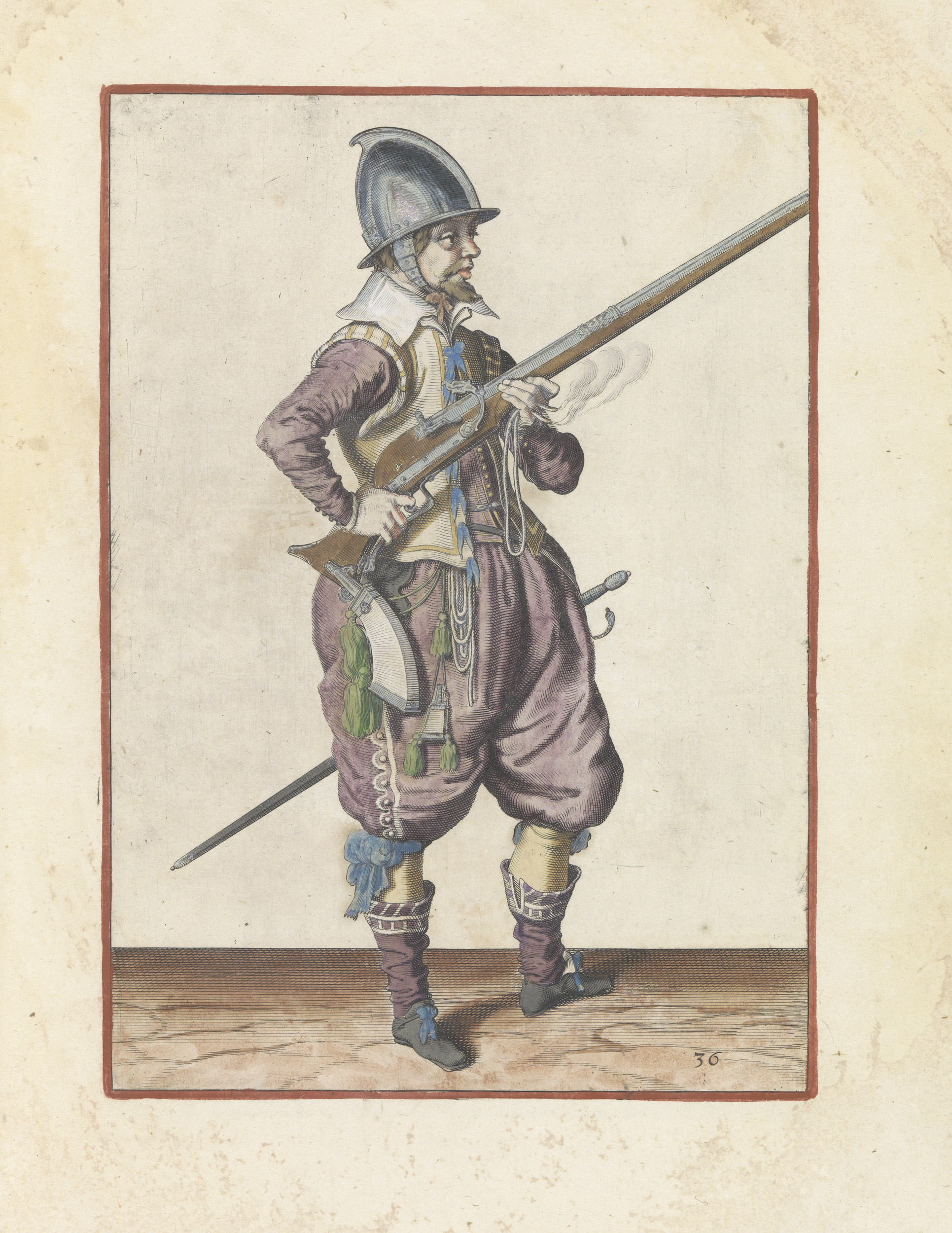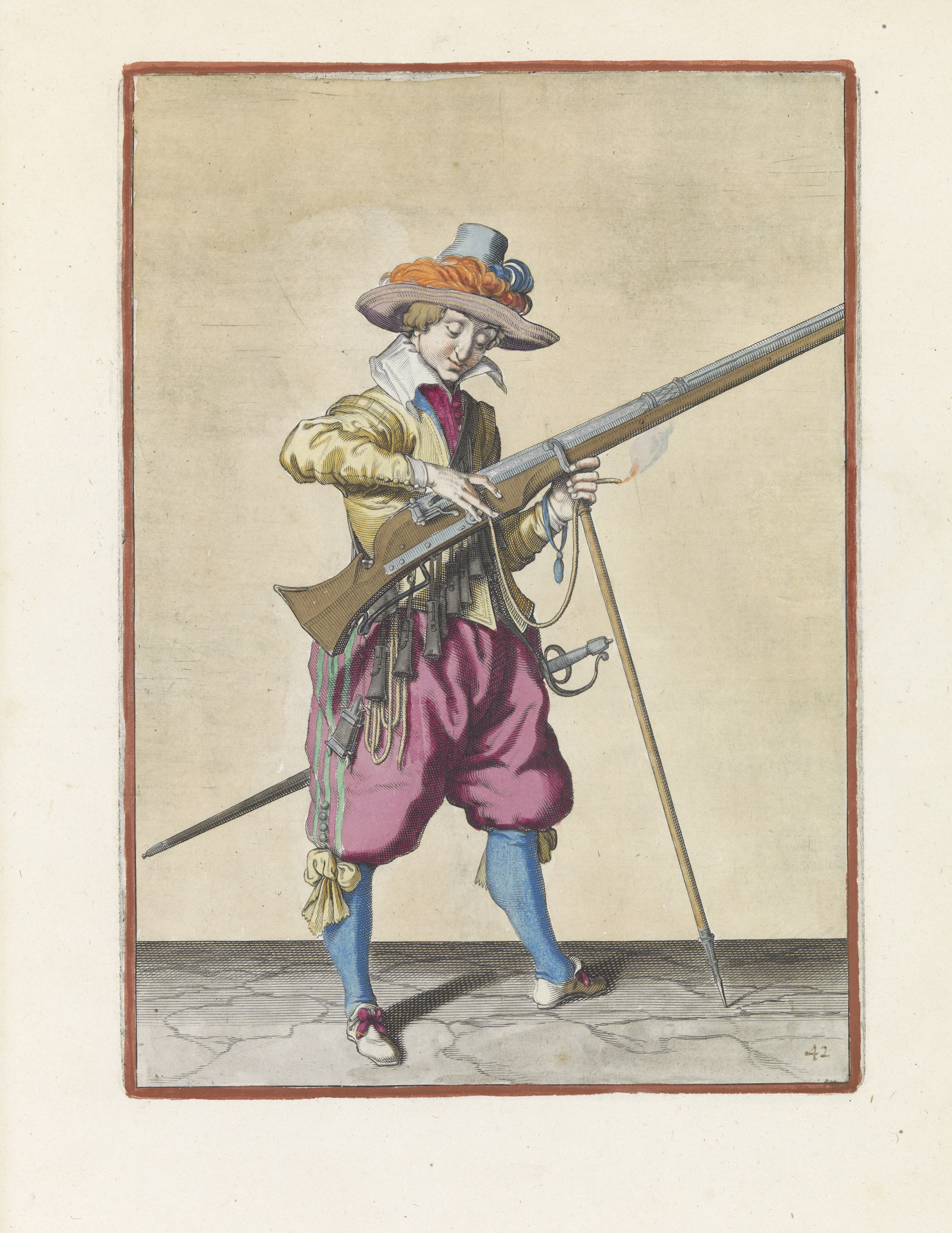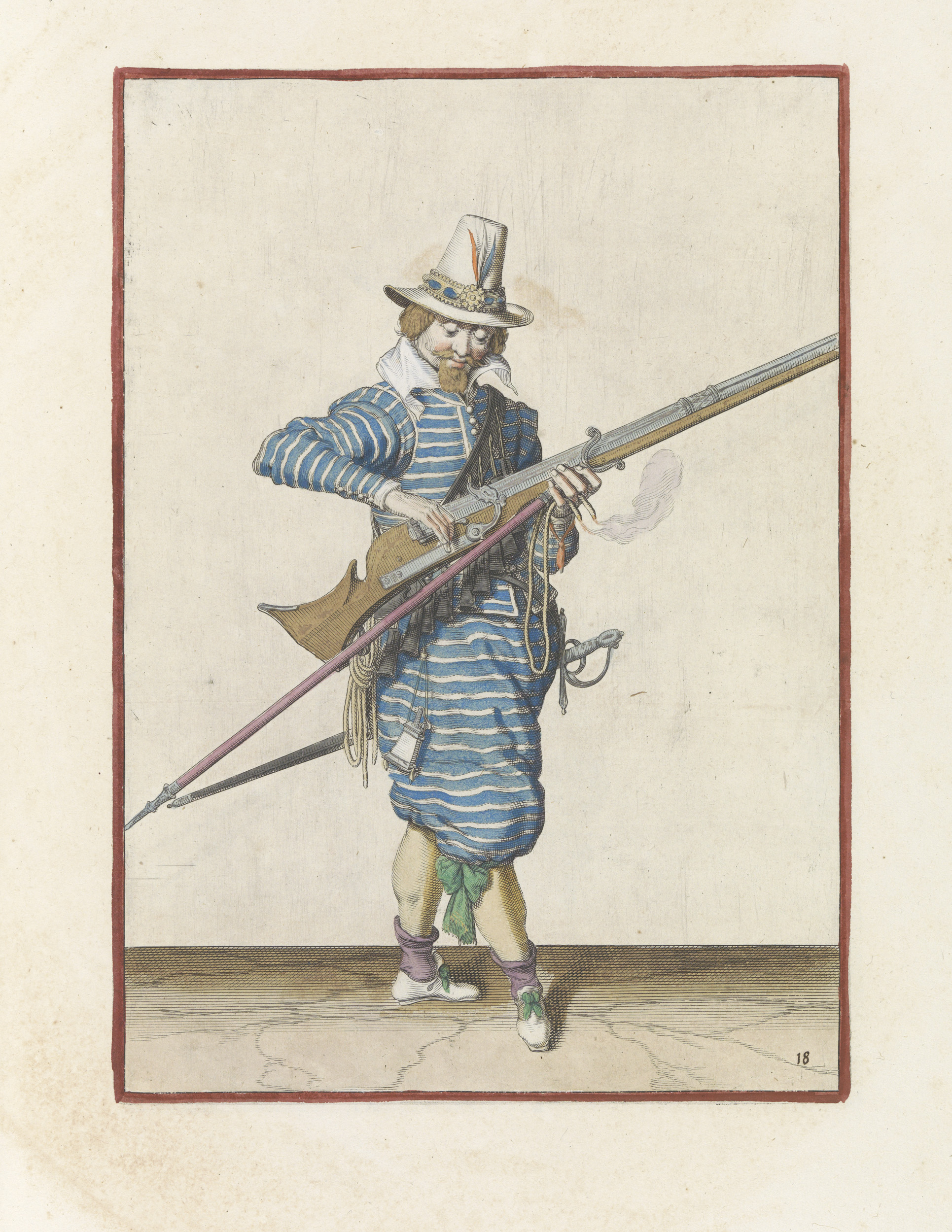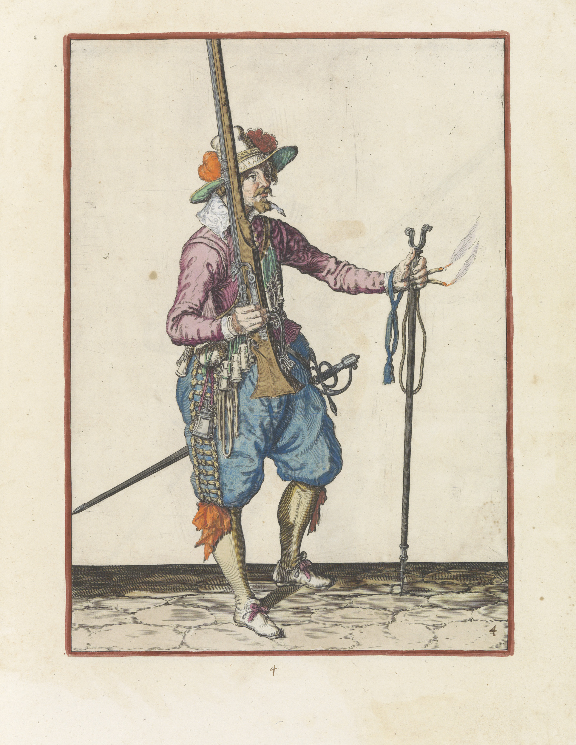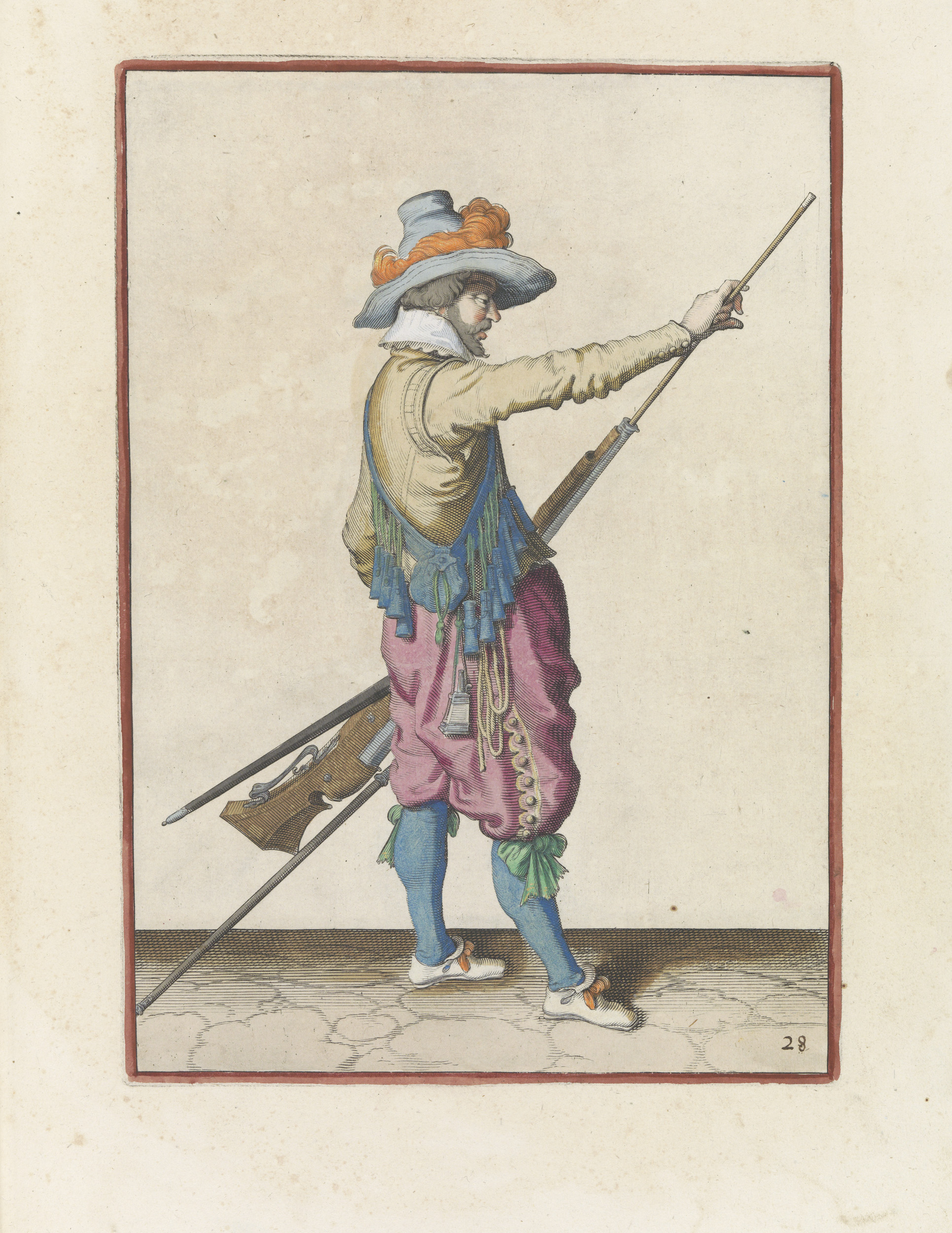 Soldaat die zijn musket, steunend op zijn furket, af...
