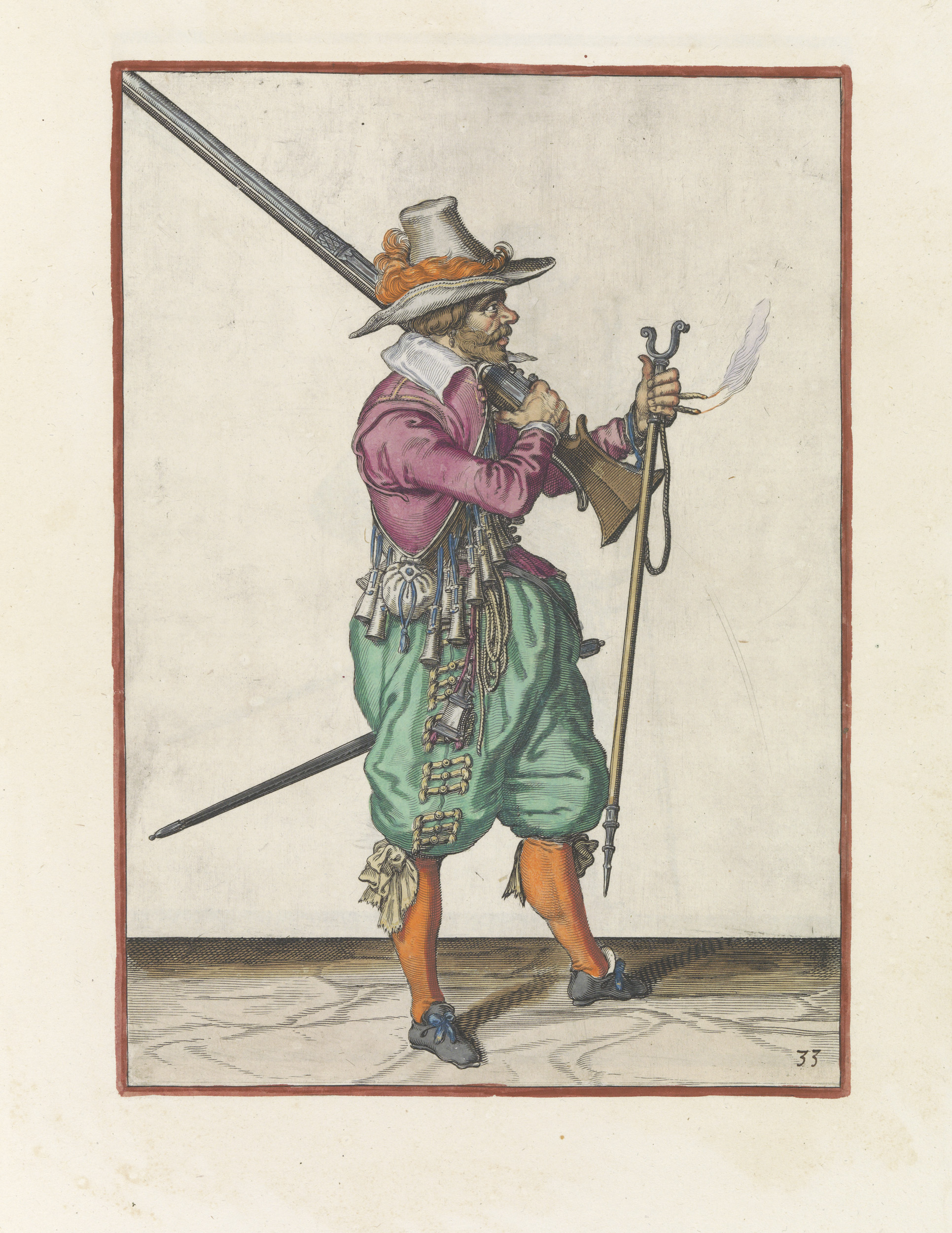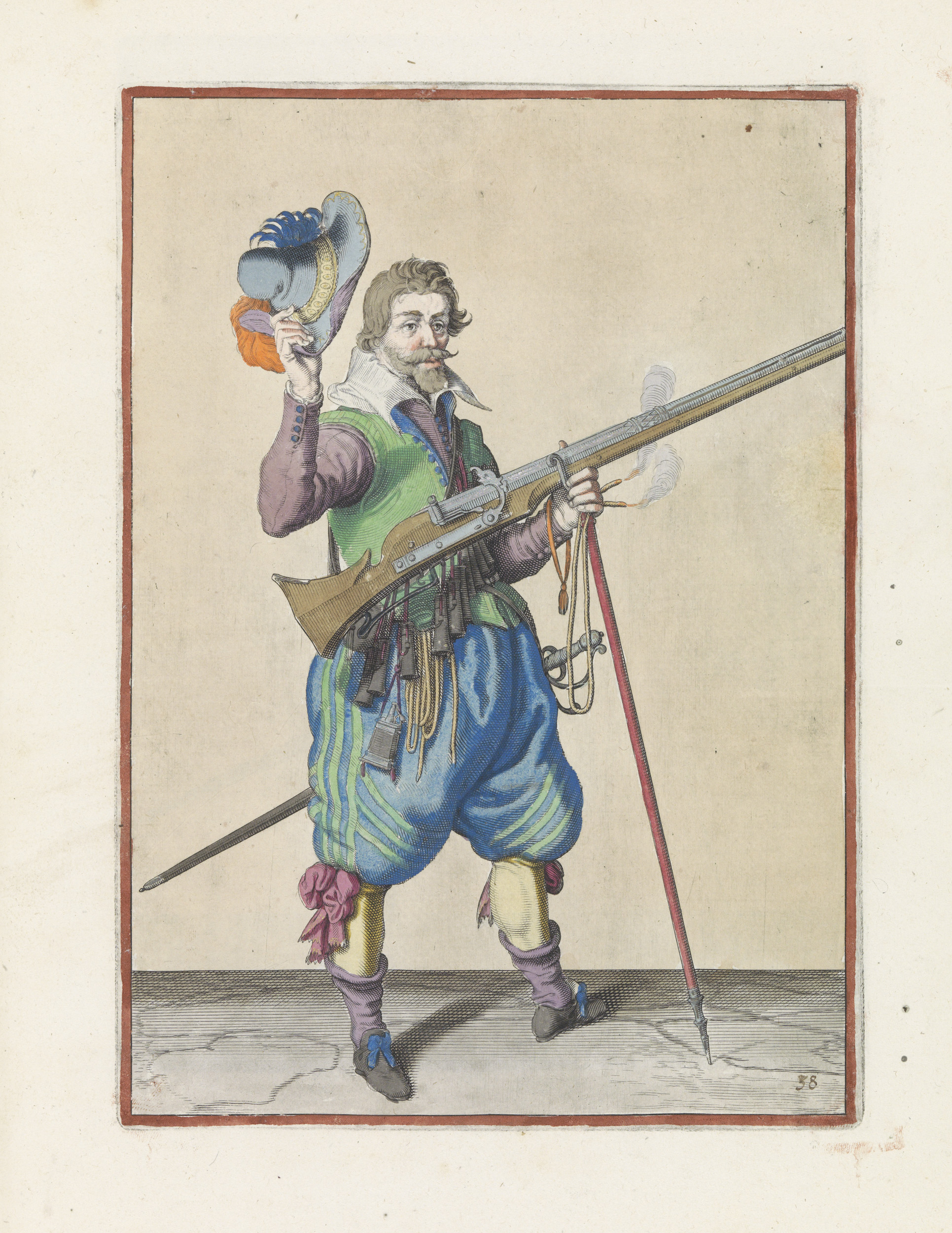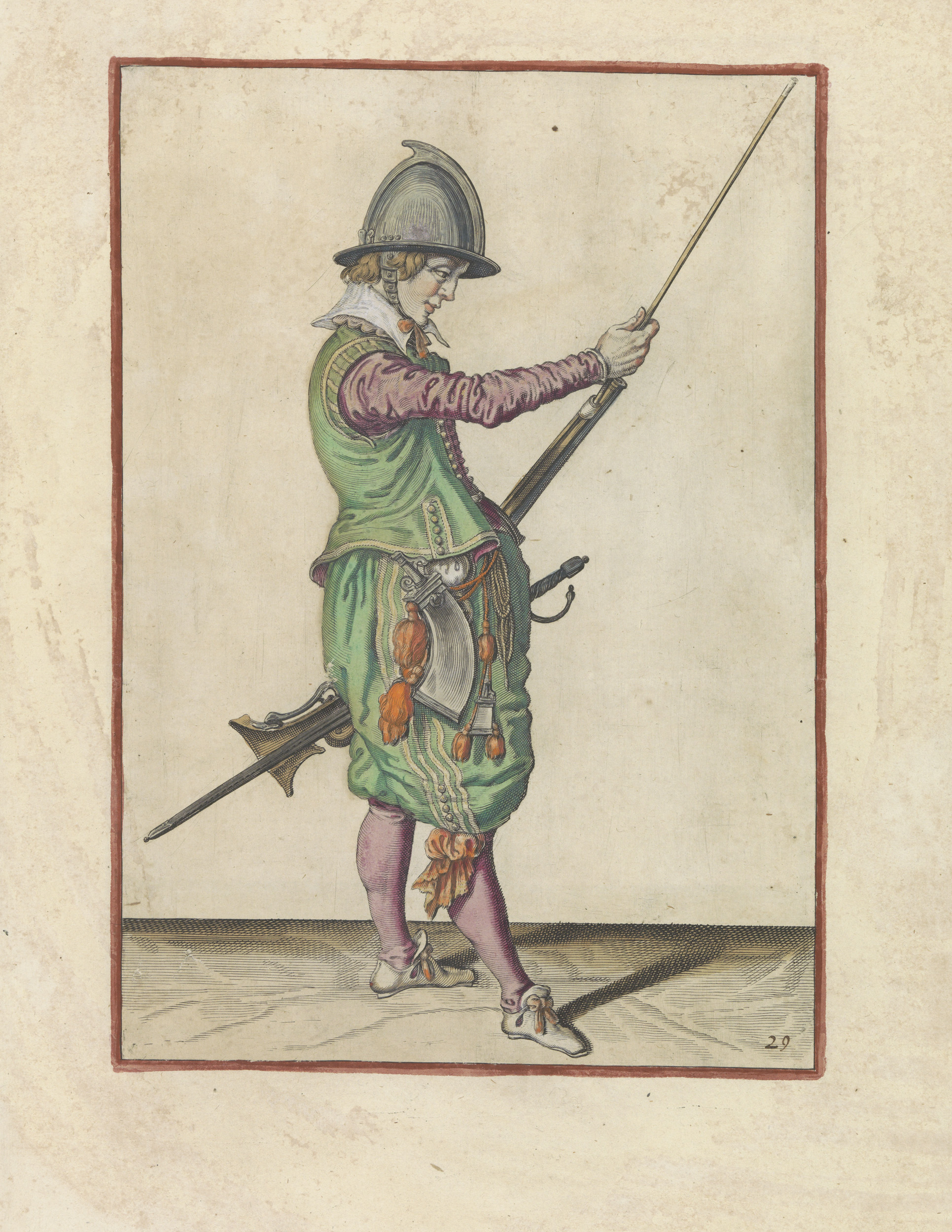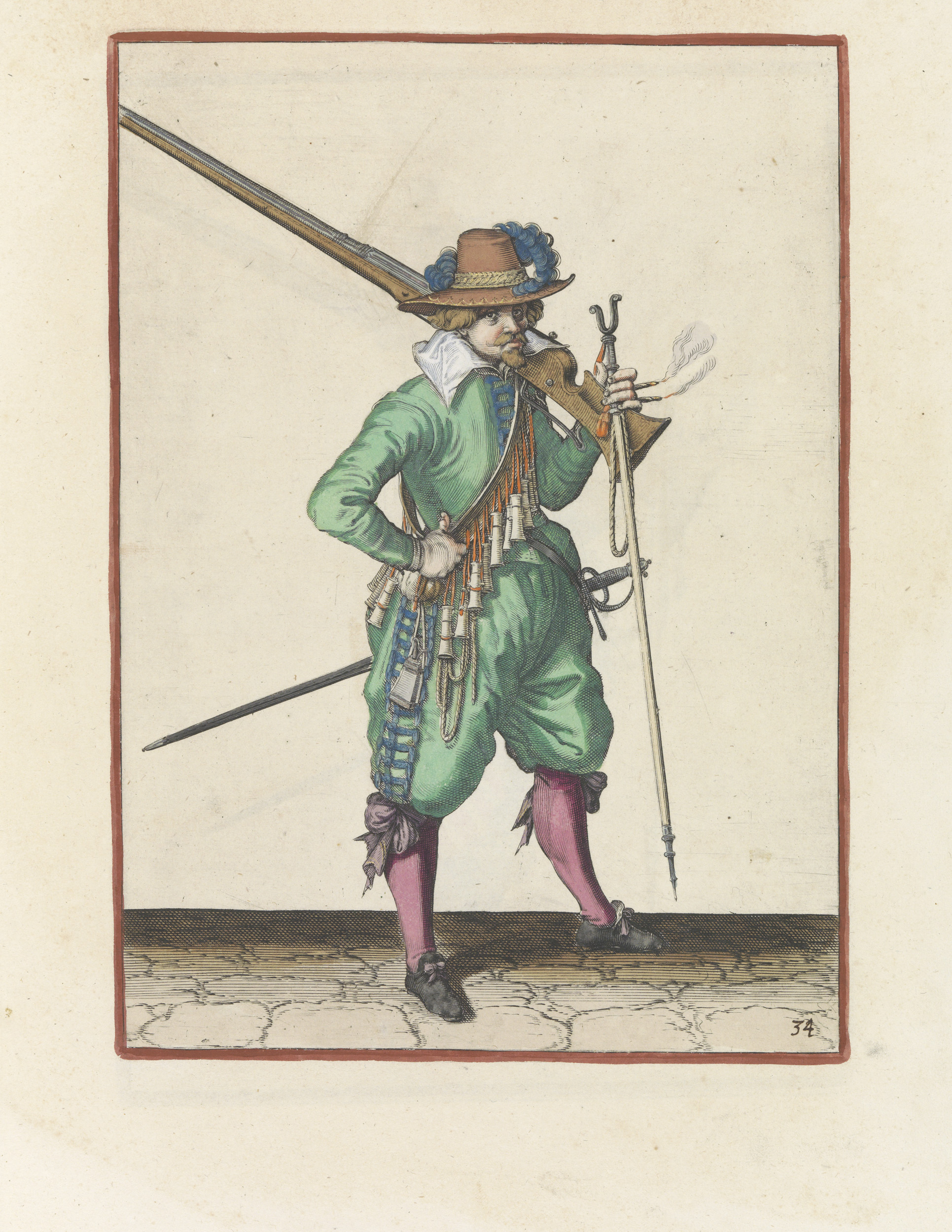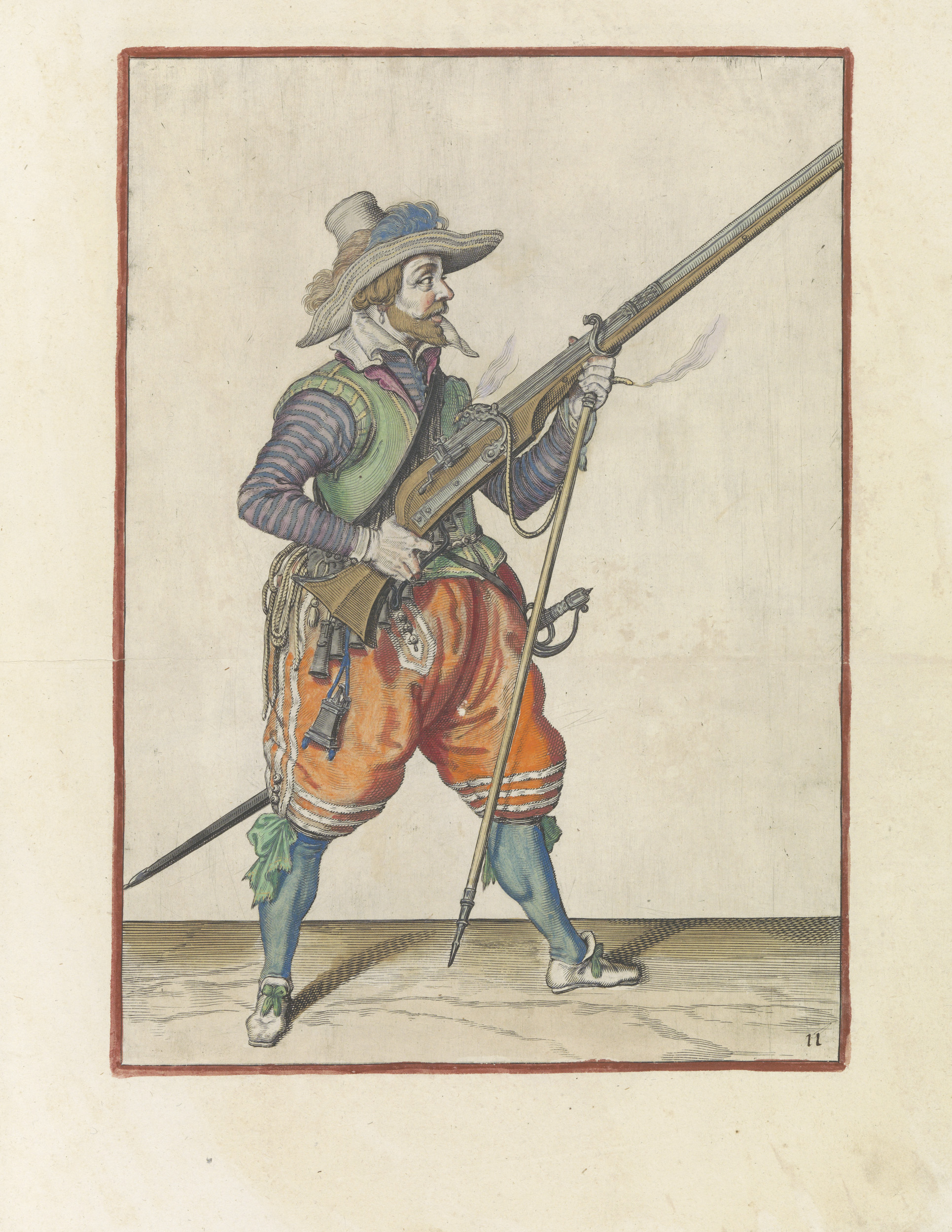 Soldaat die zijn musket, steunend op zijn furket, af...