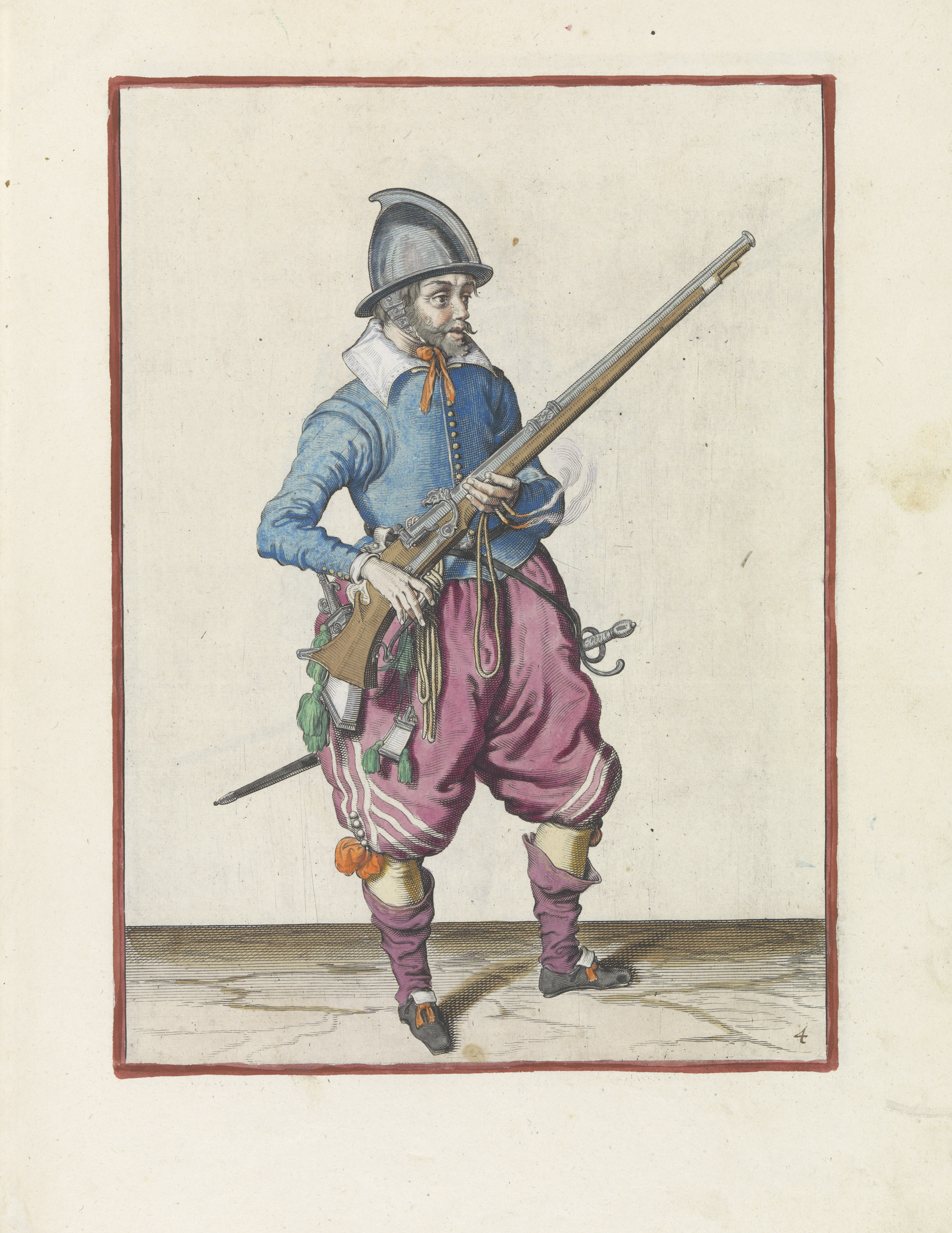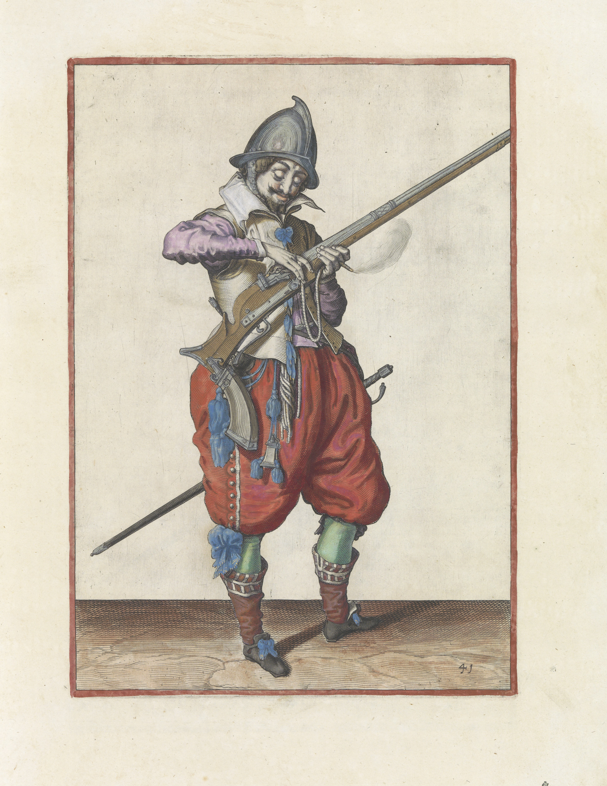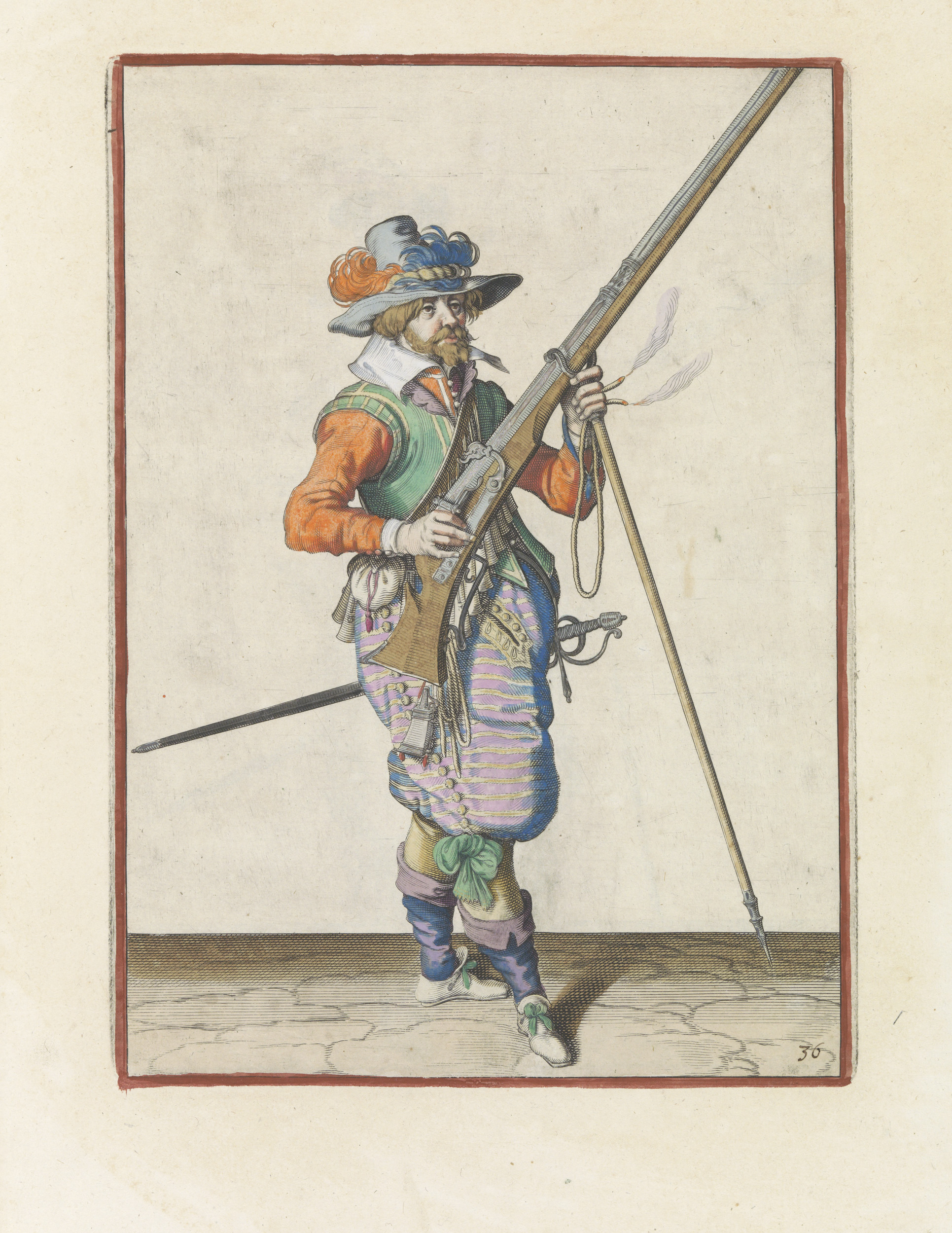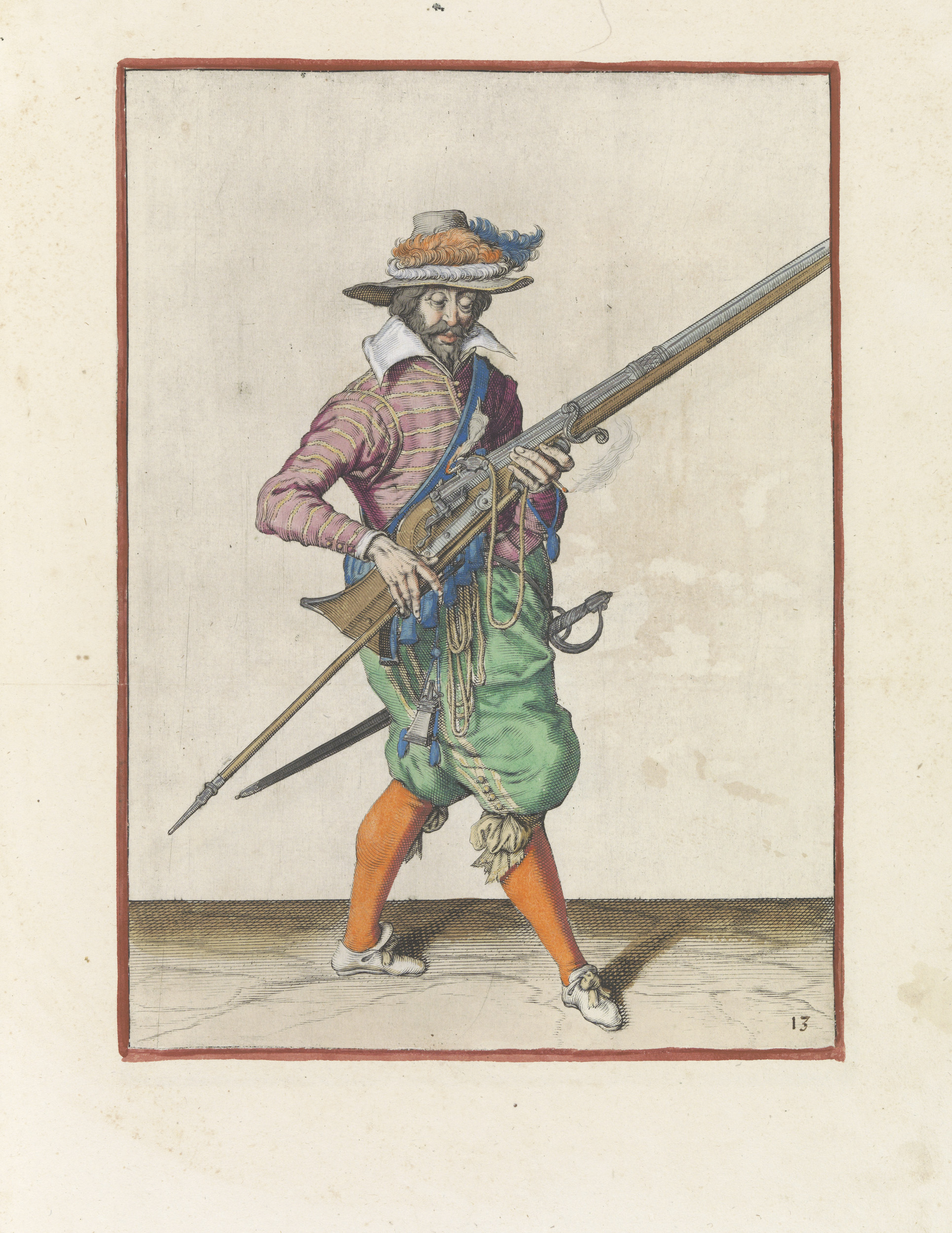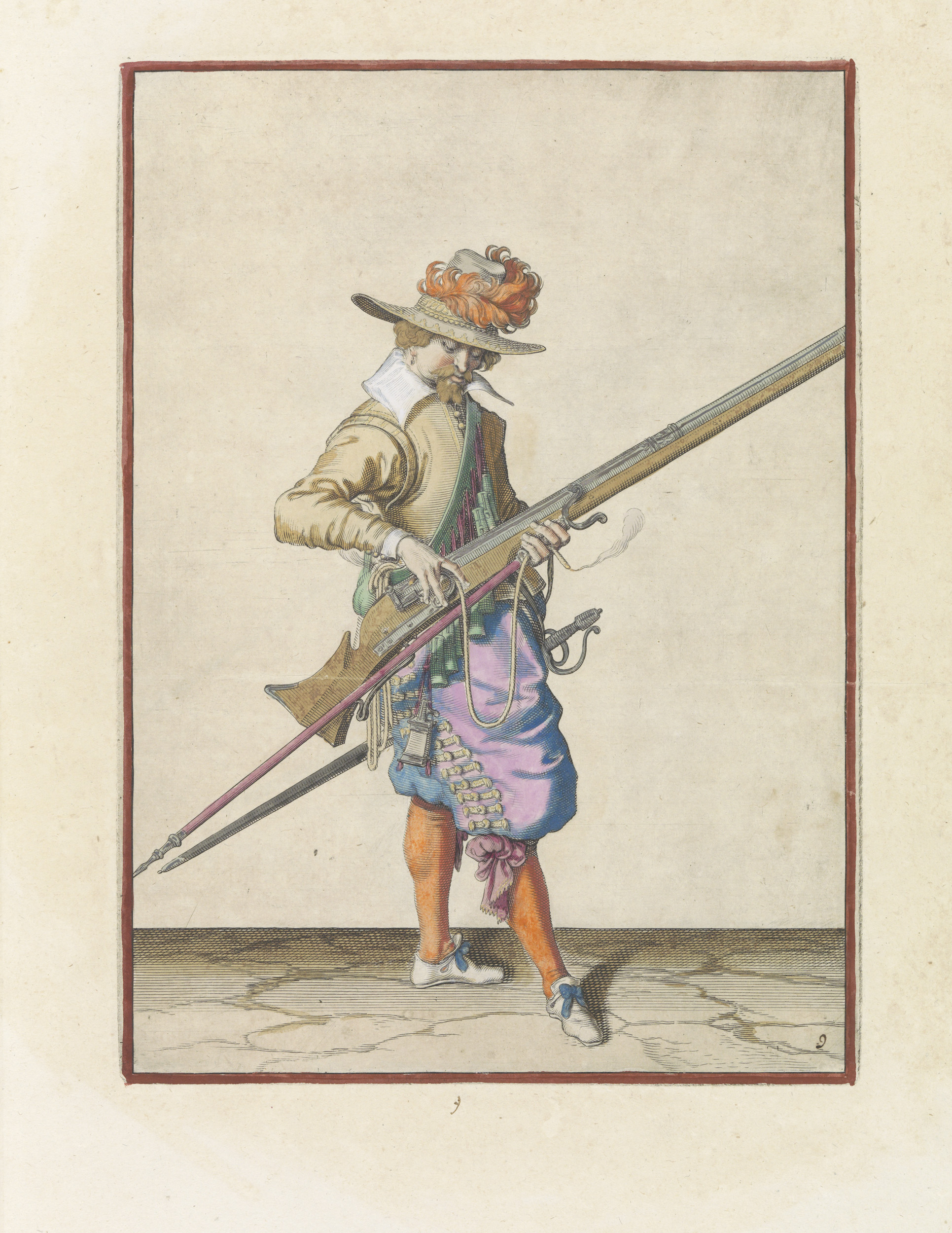 Soldaat die zijn musket, steunend op zijn furket, af...
