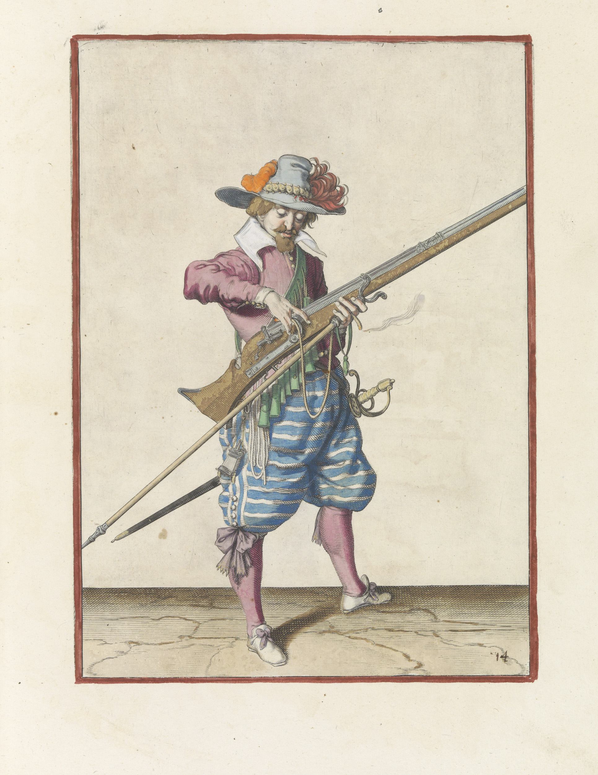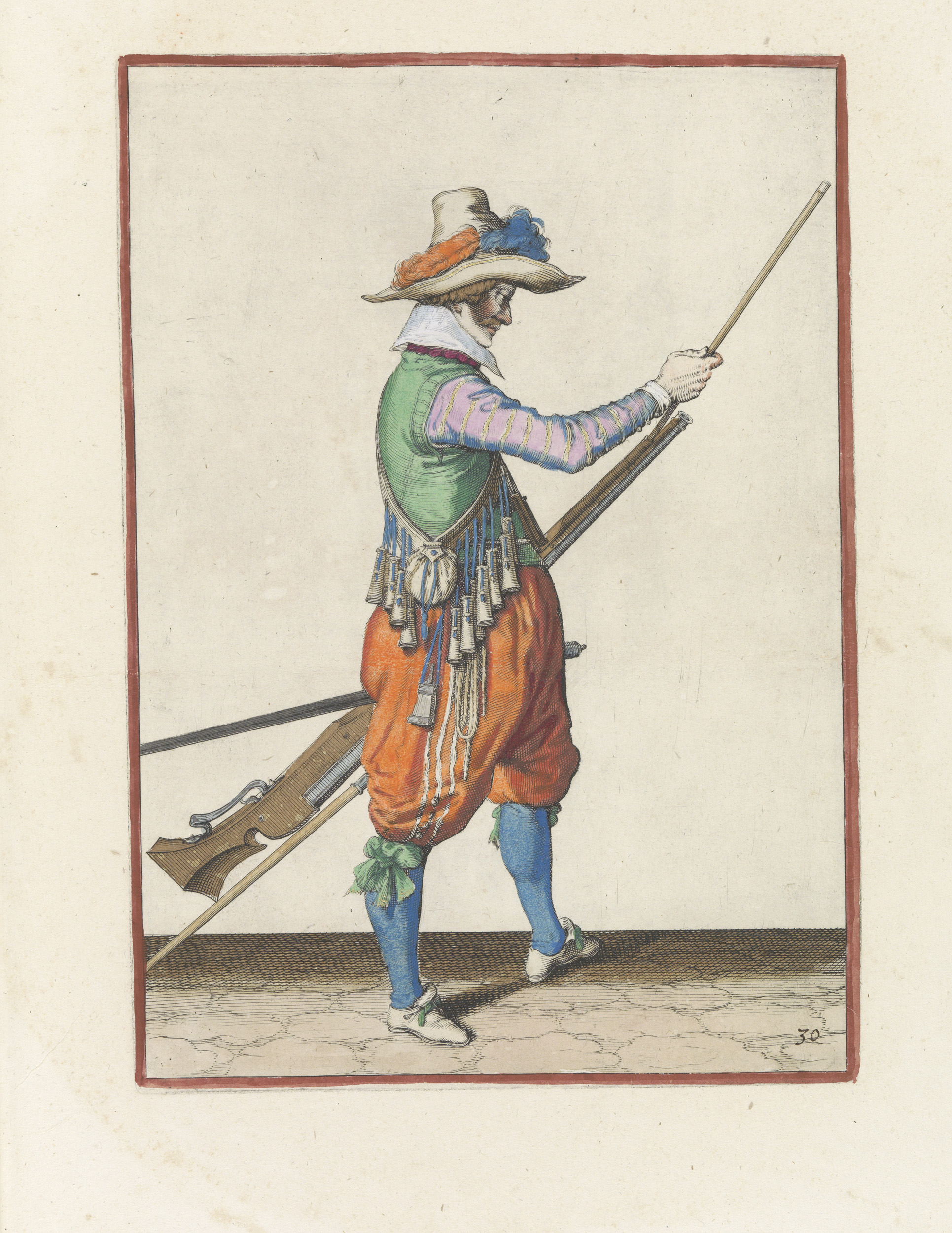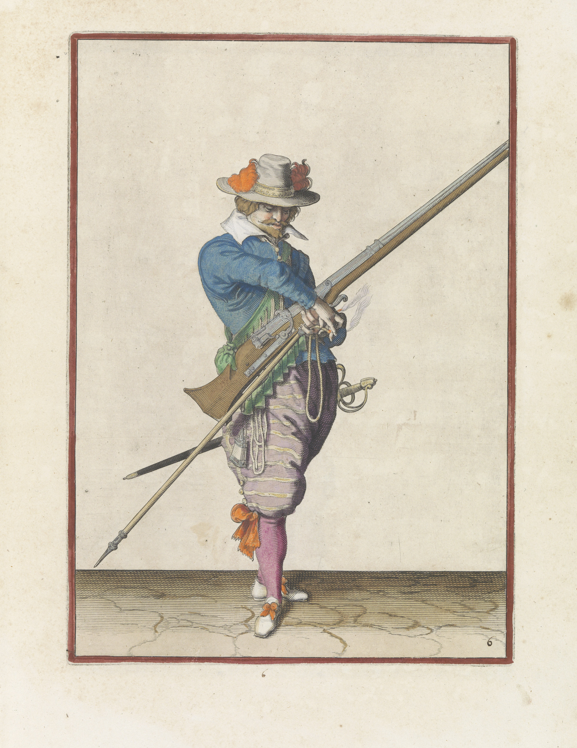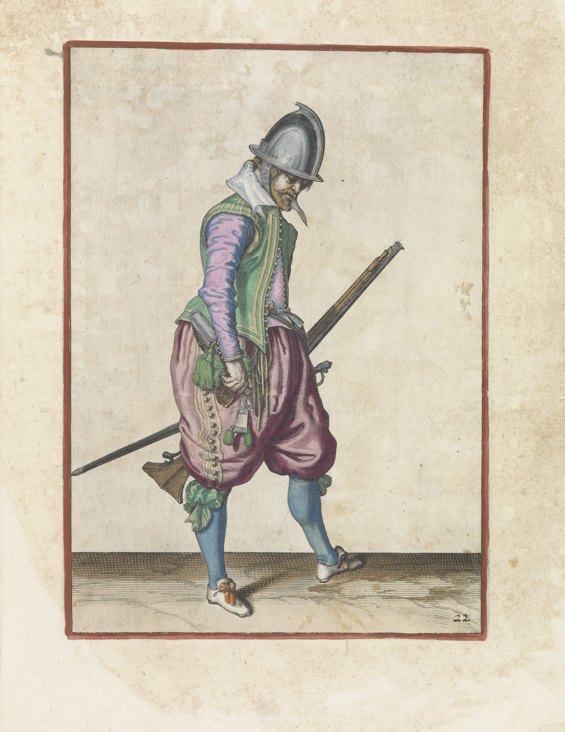 Soldaat die zijn musket, steunend op zijn furket, af...