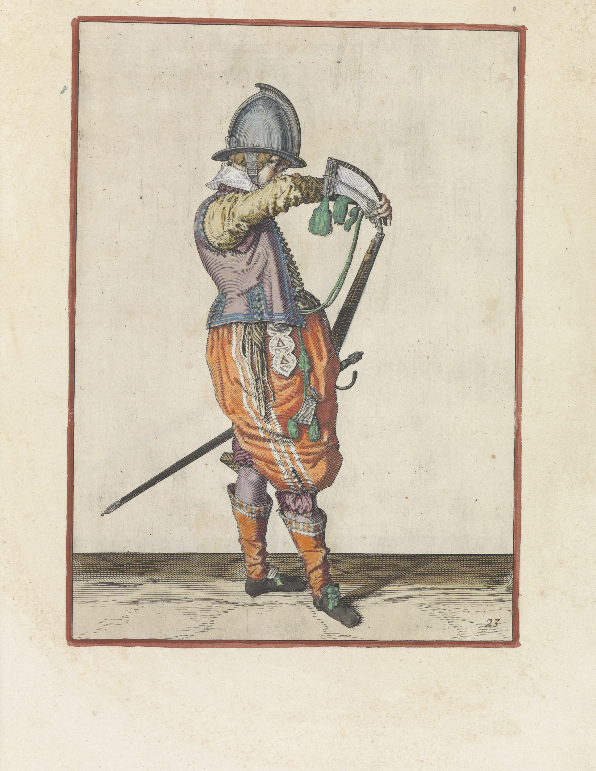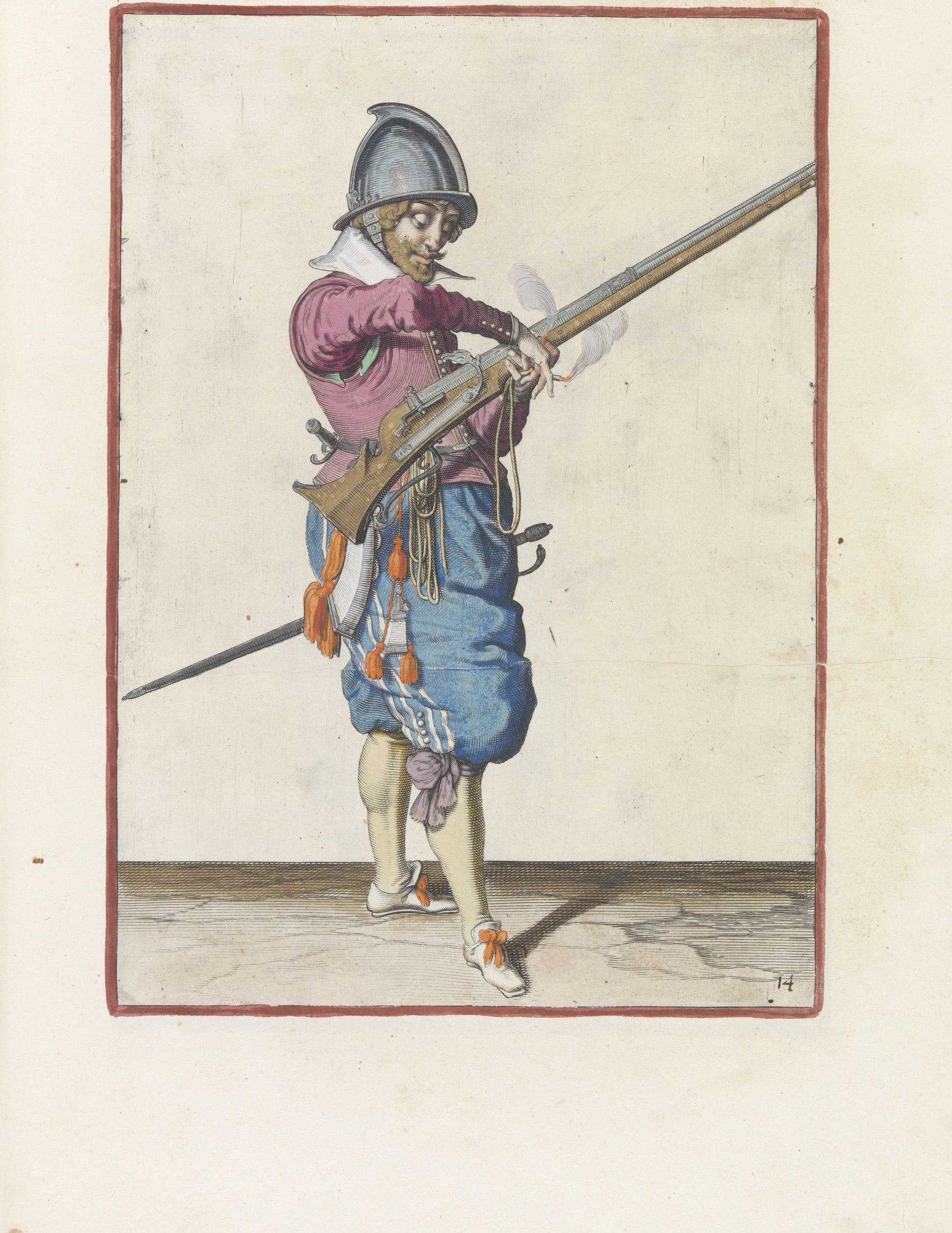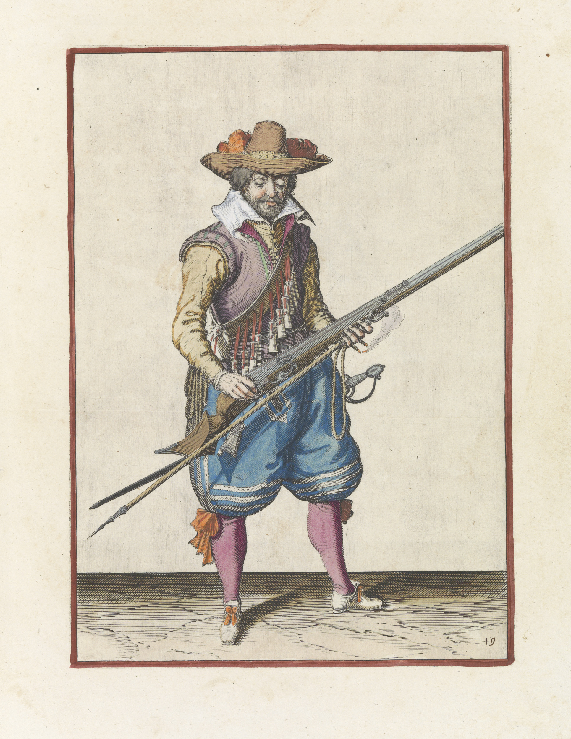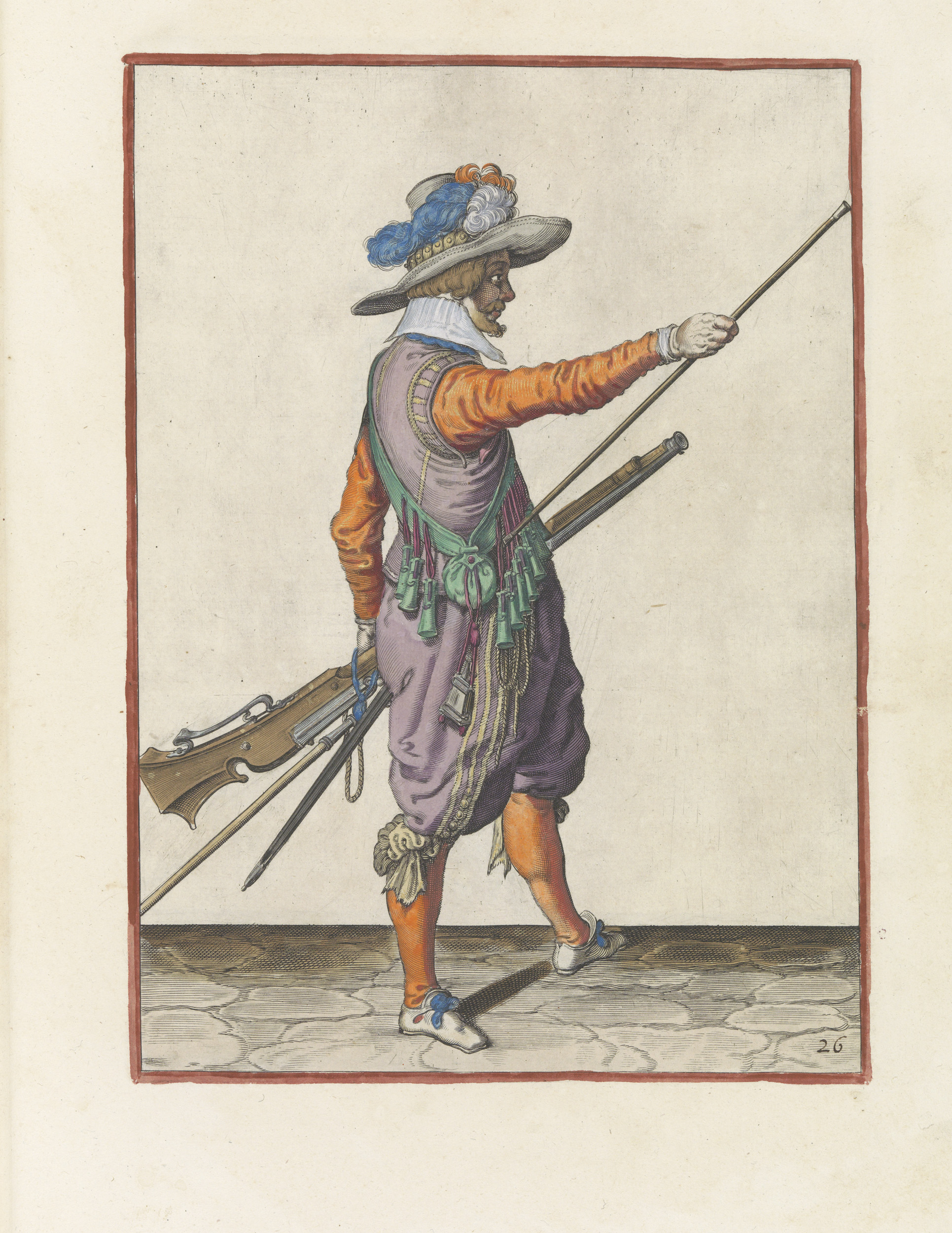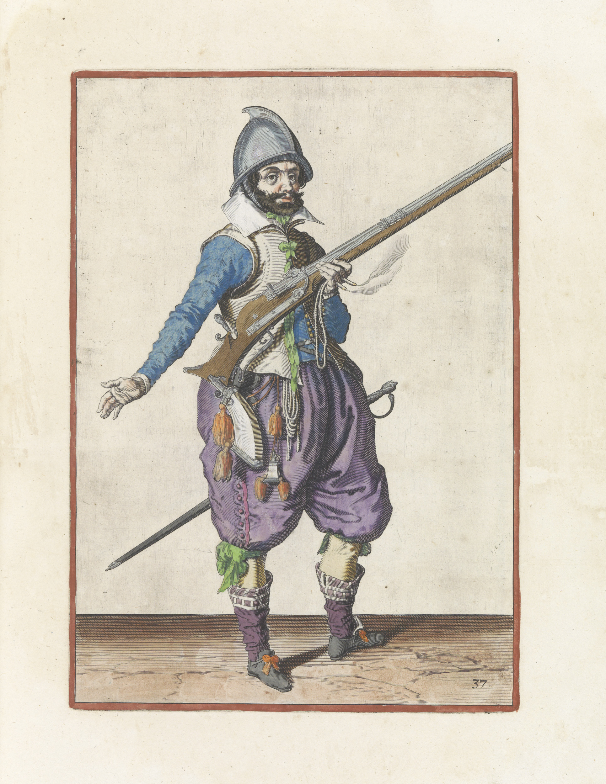 Soldaat die zijn musket, steunend op zijn furket, af...