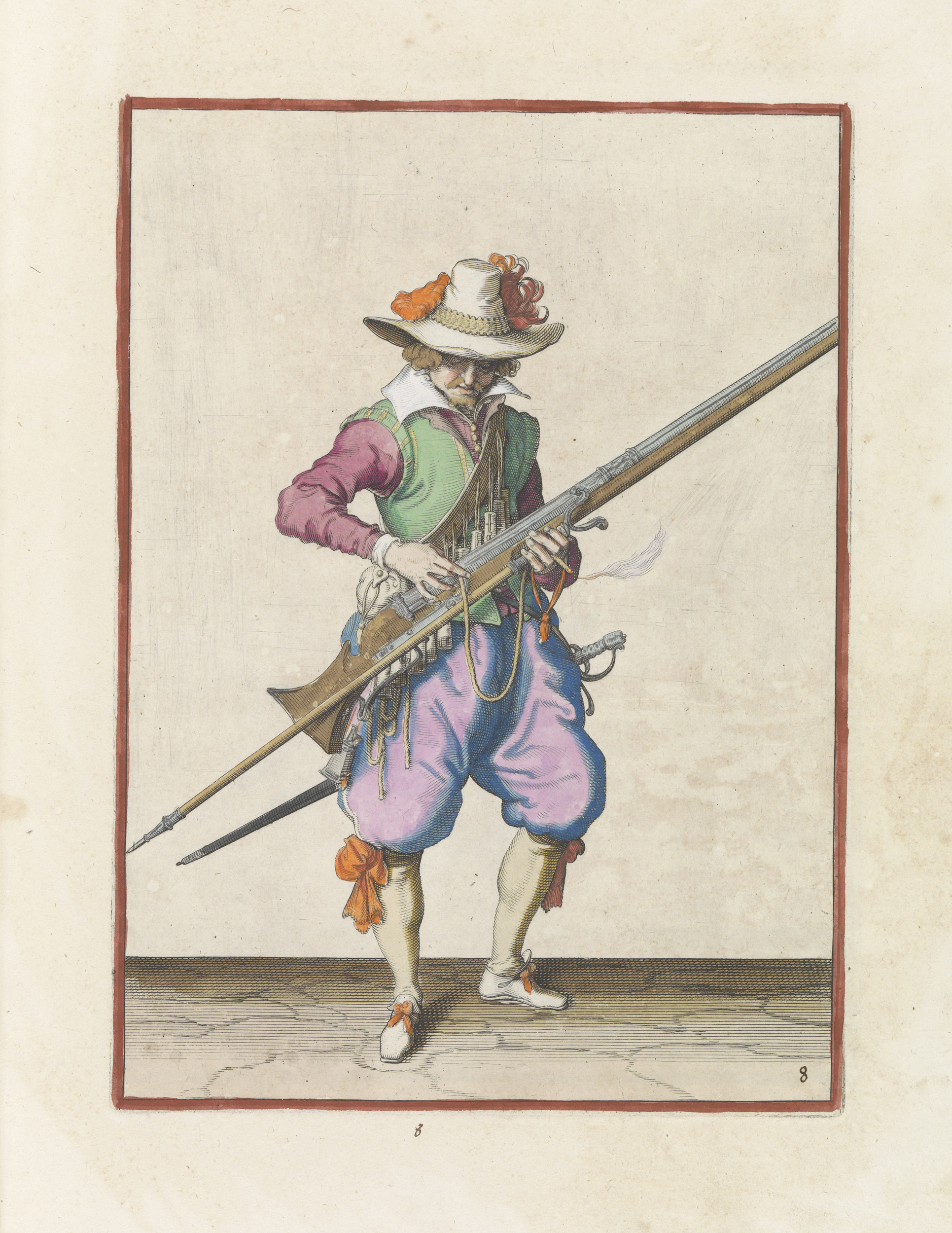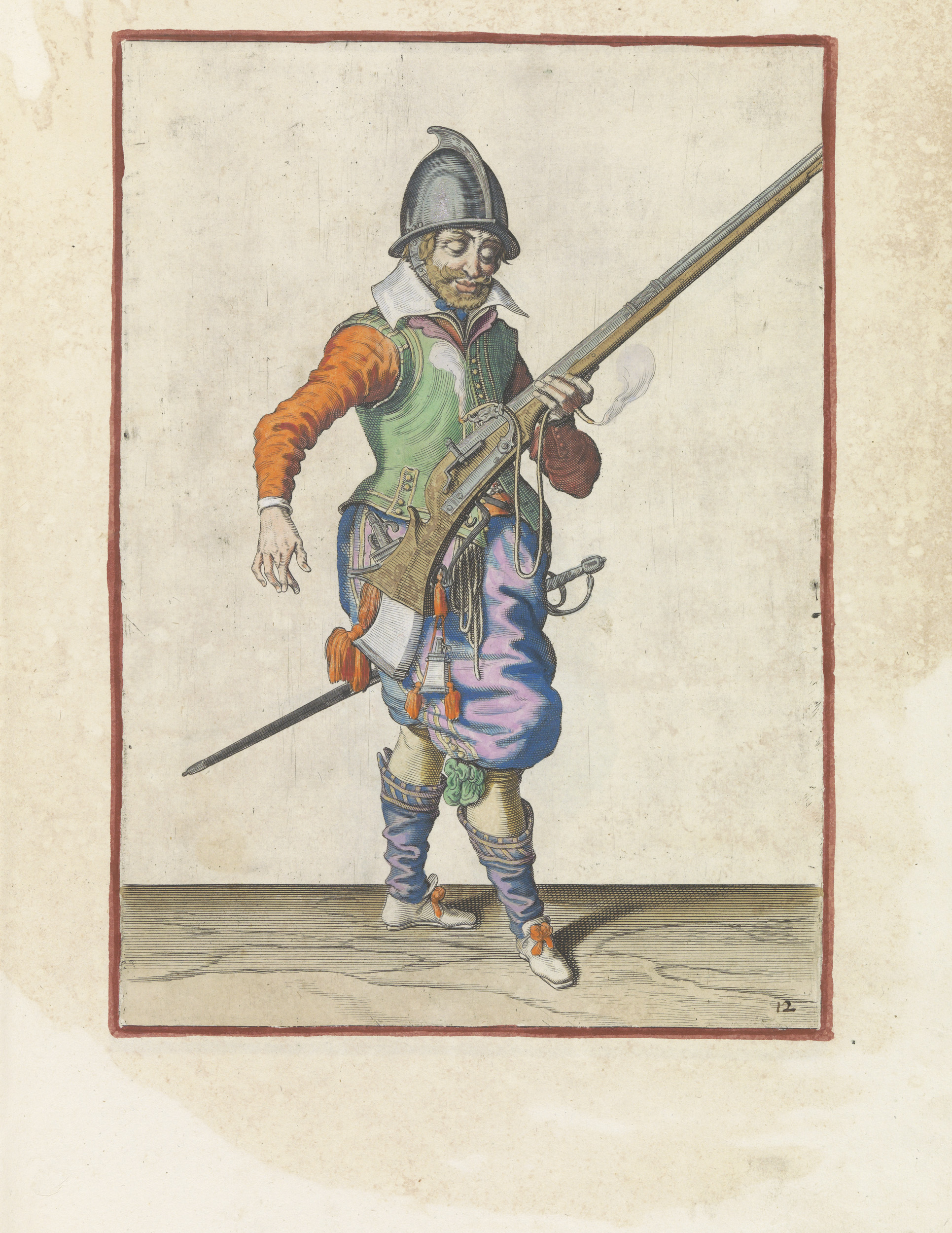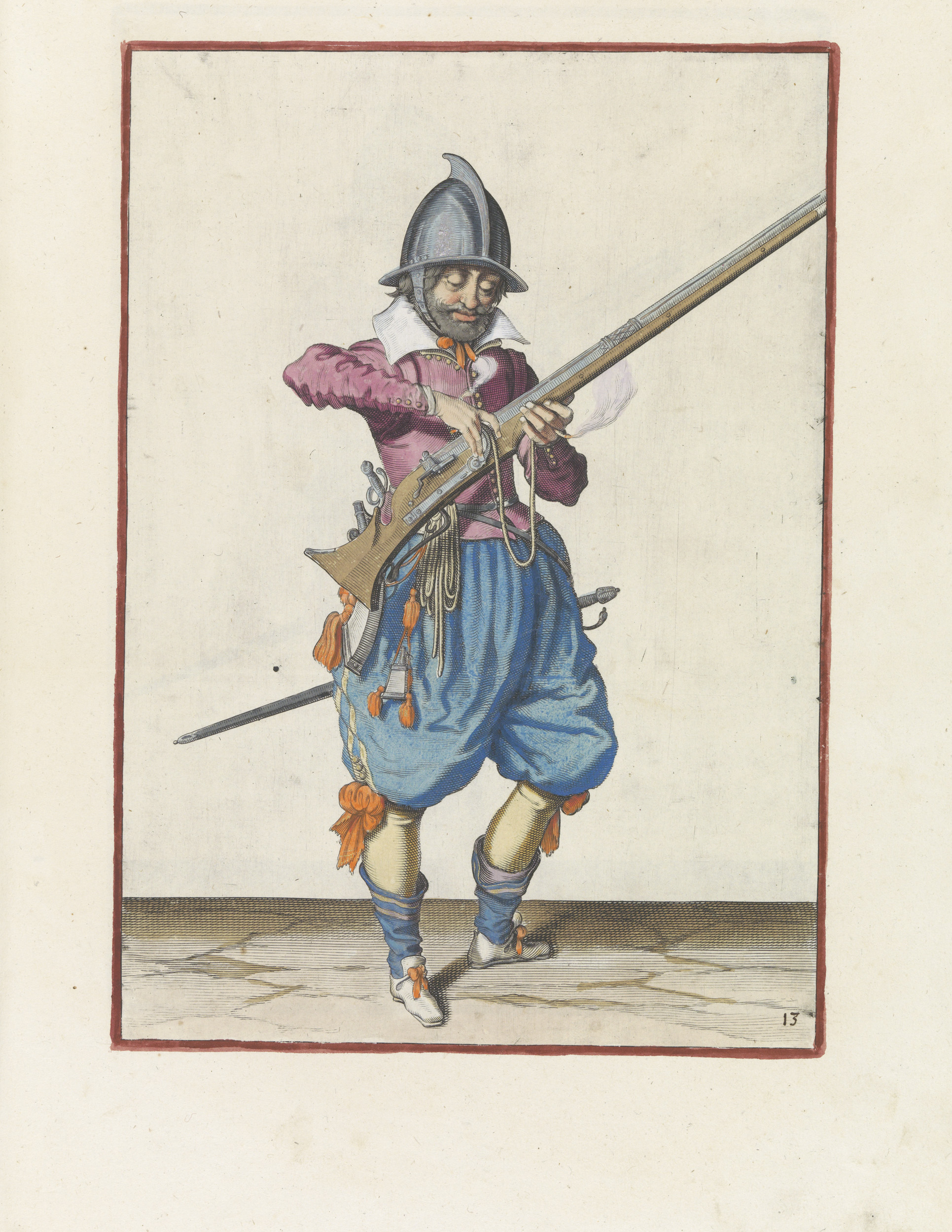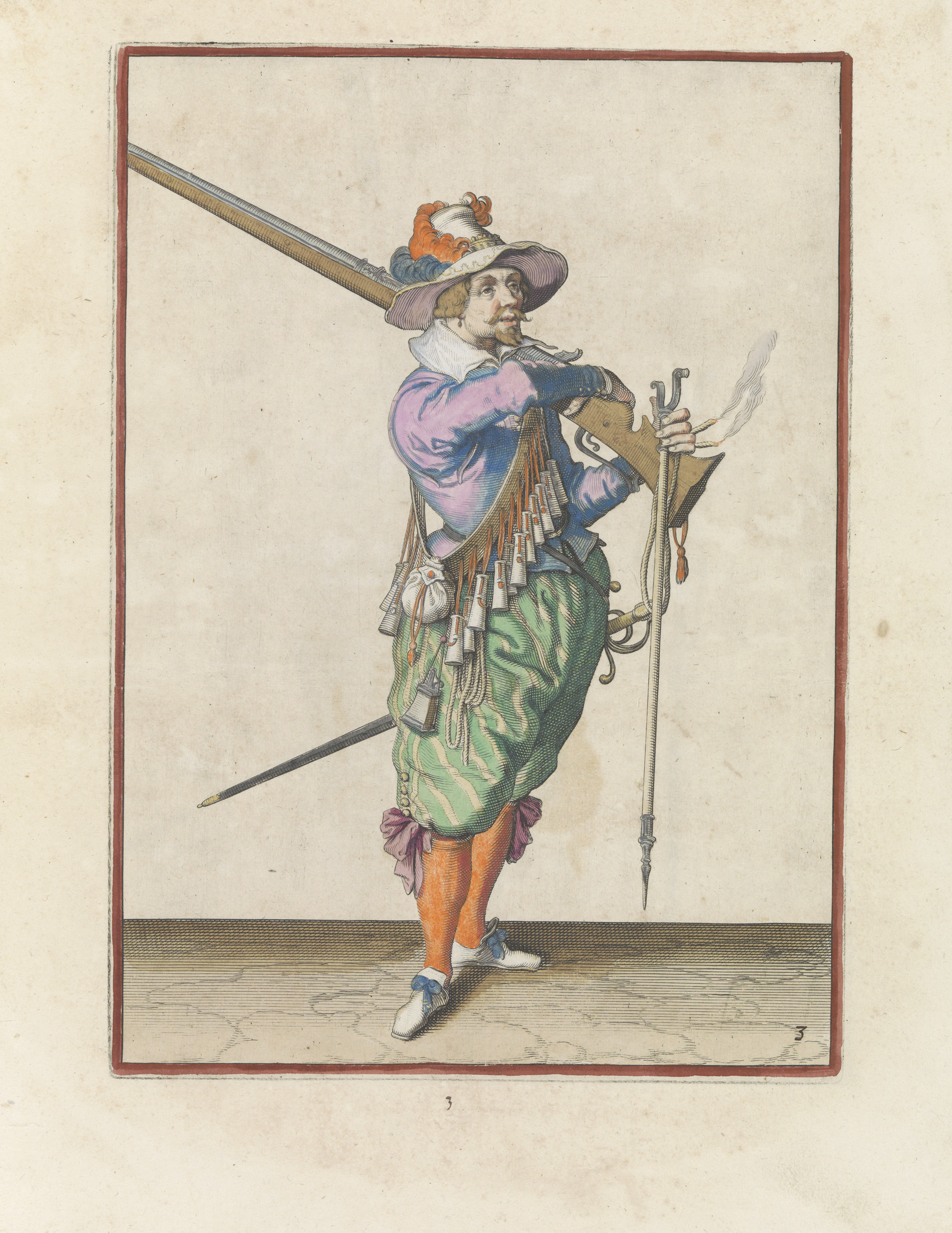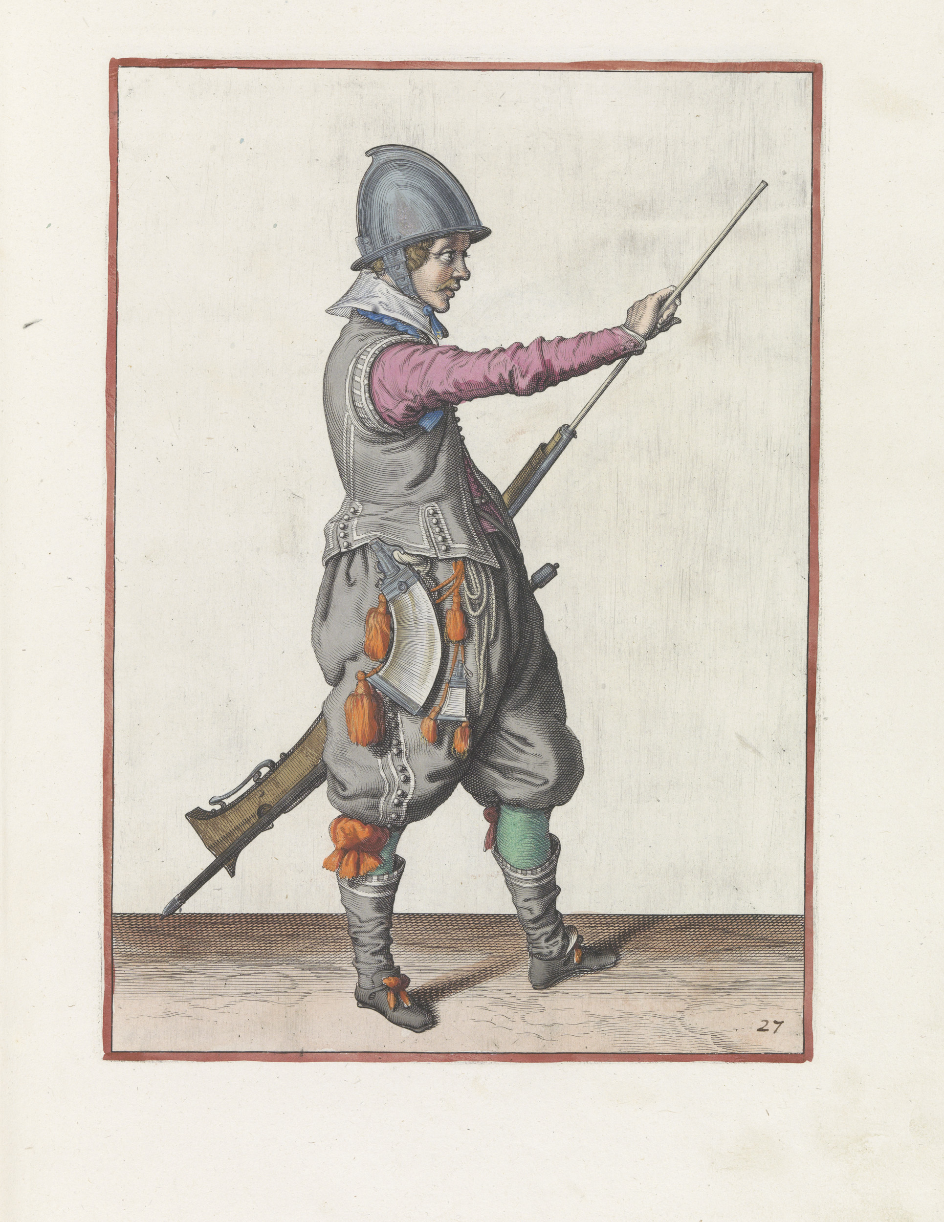Soldaat die zijn musket, steunend op zijn furket, af...