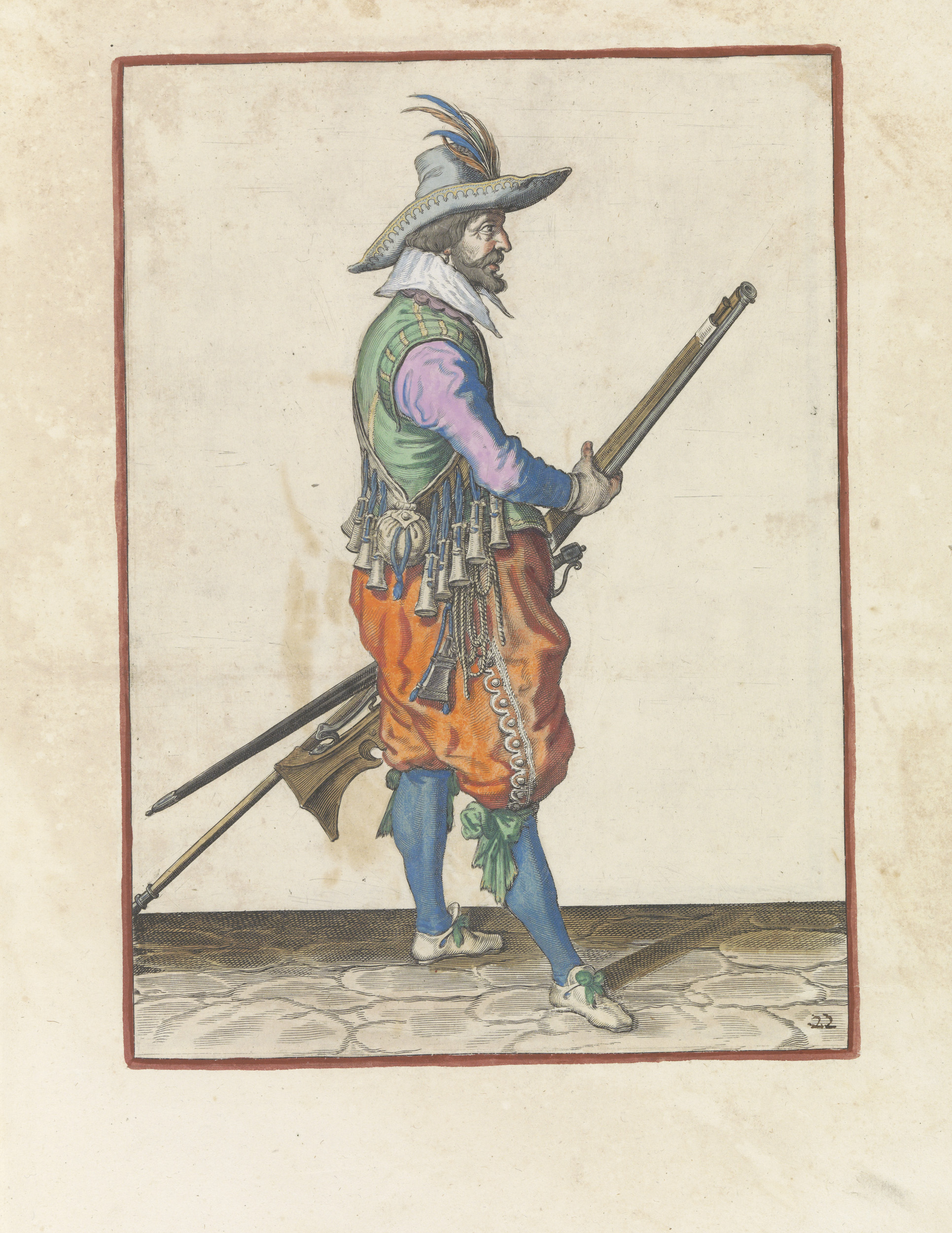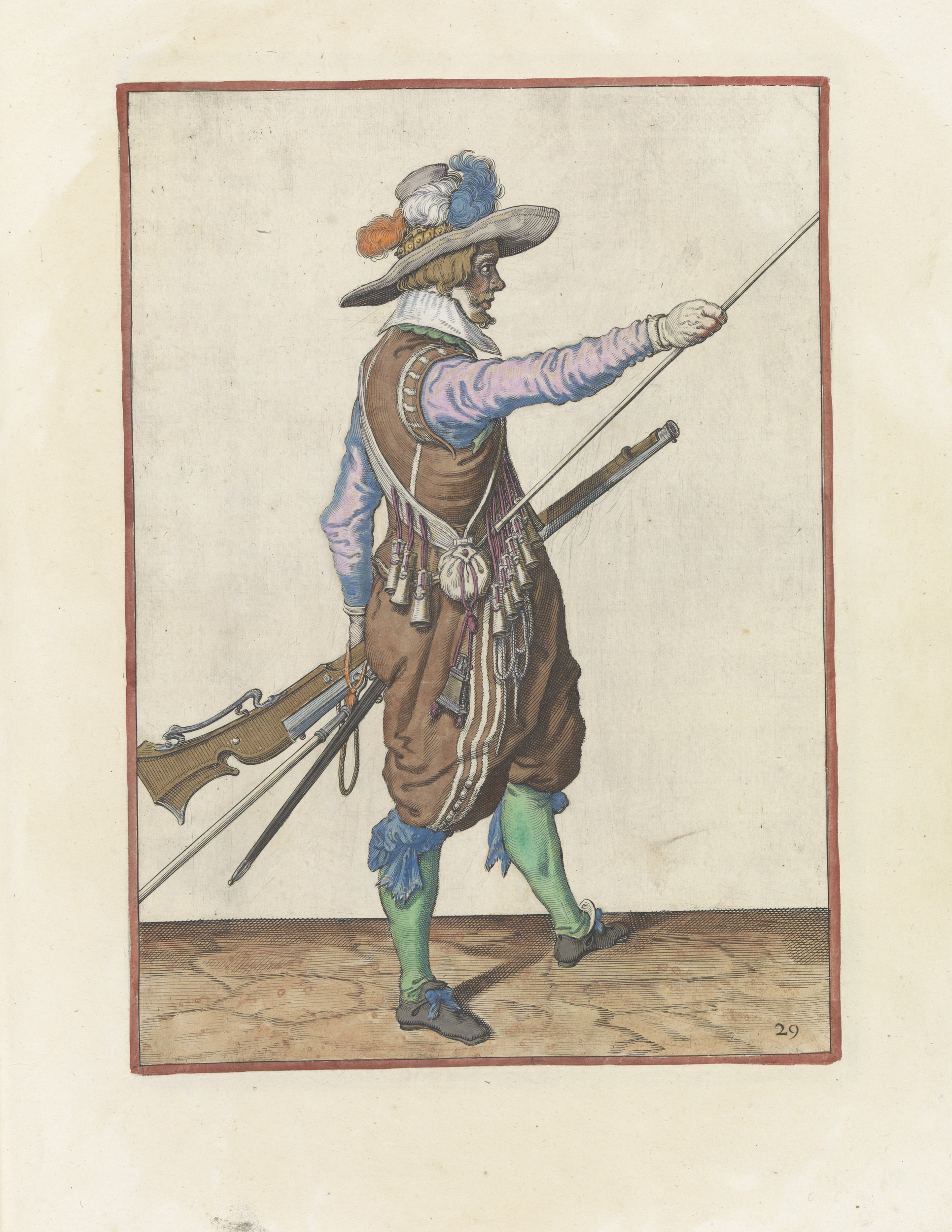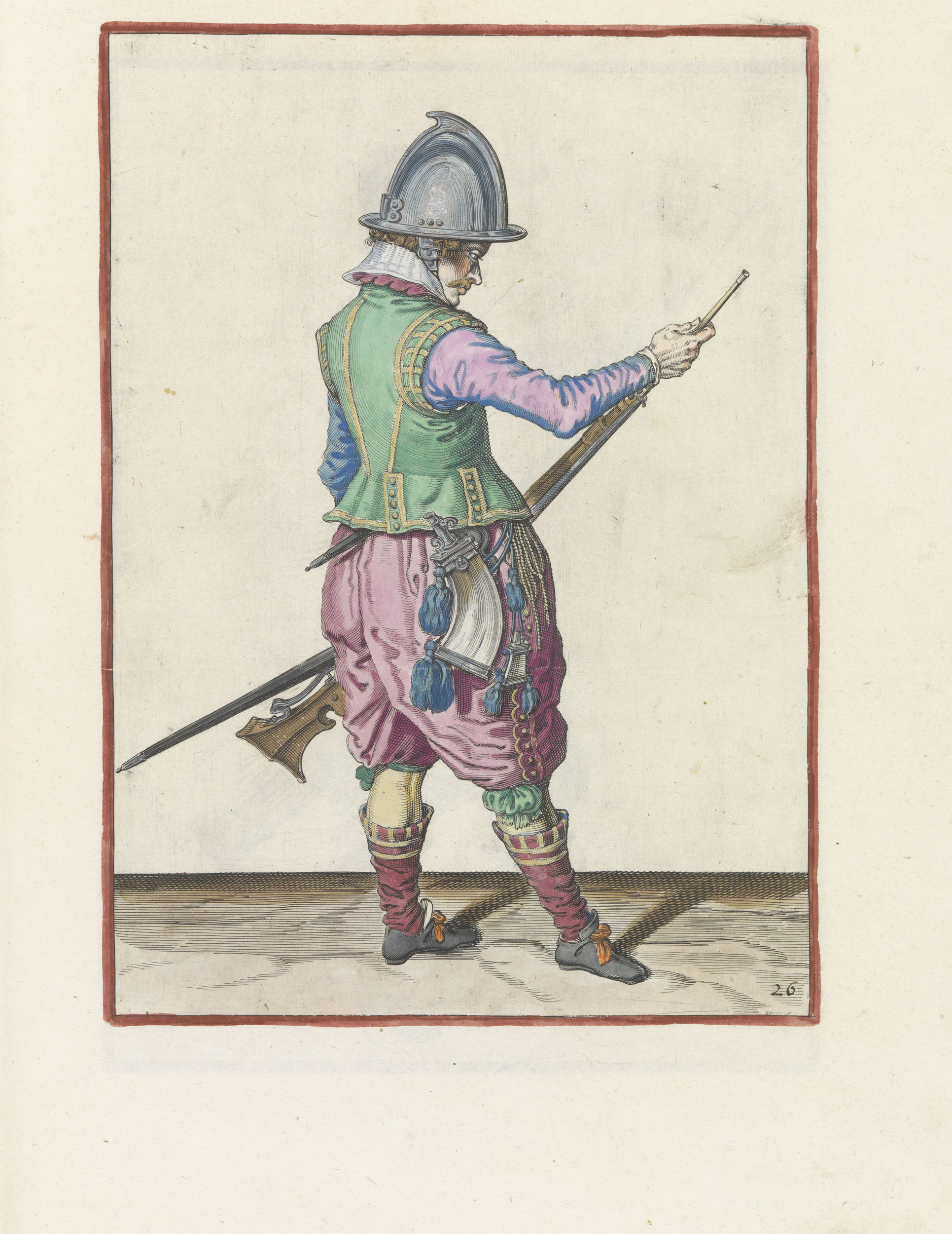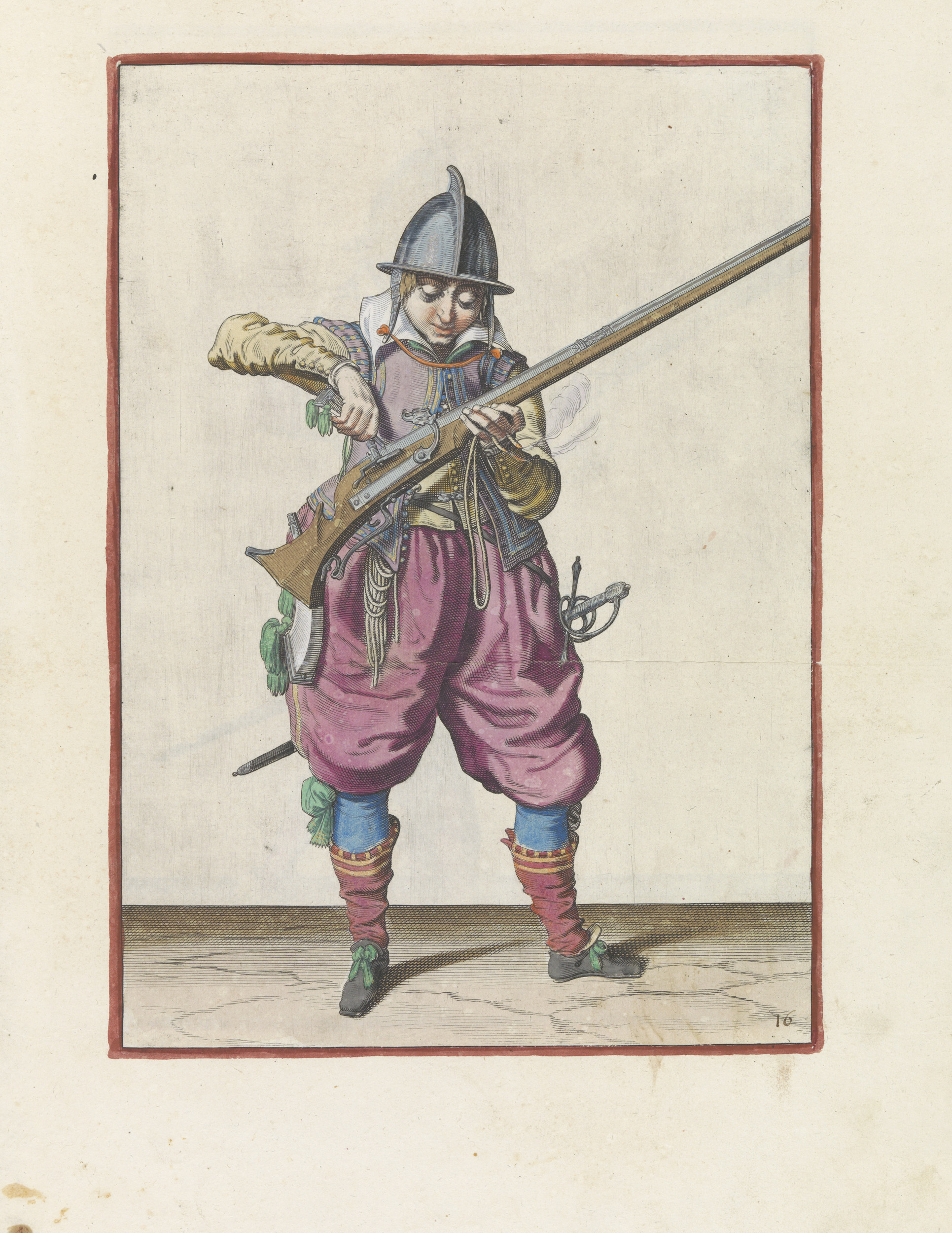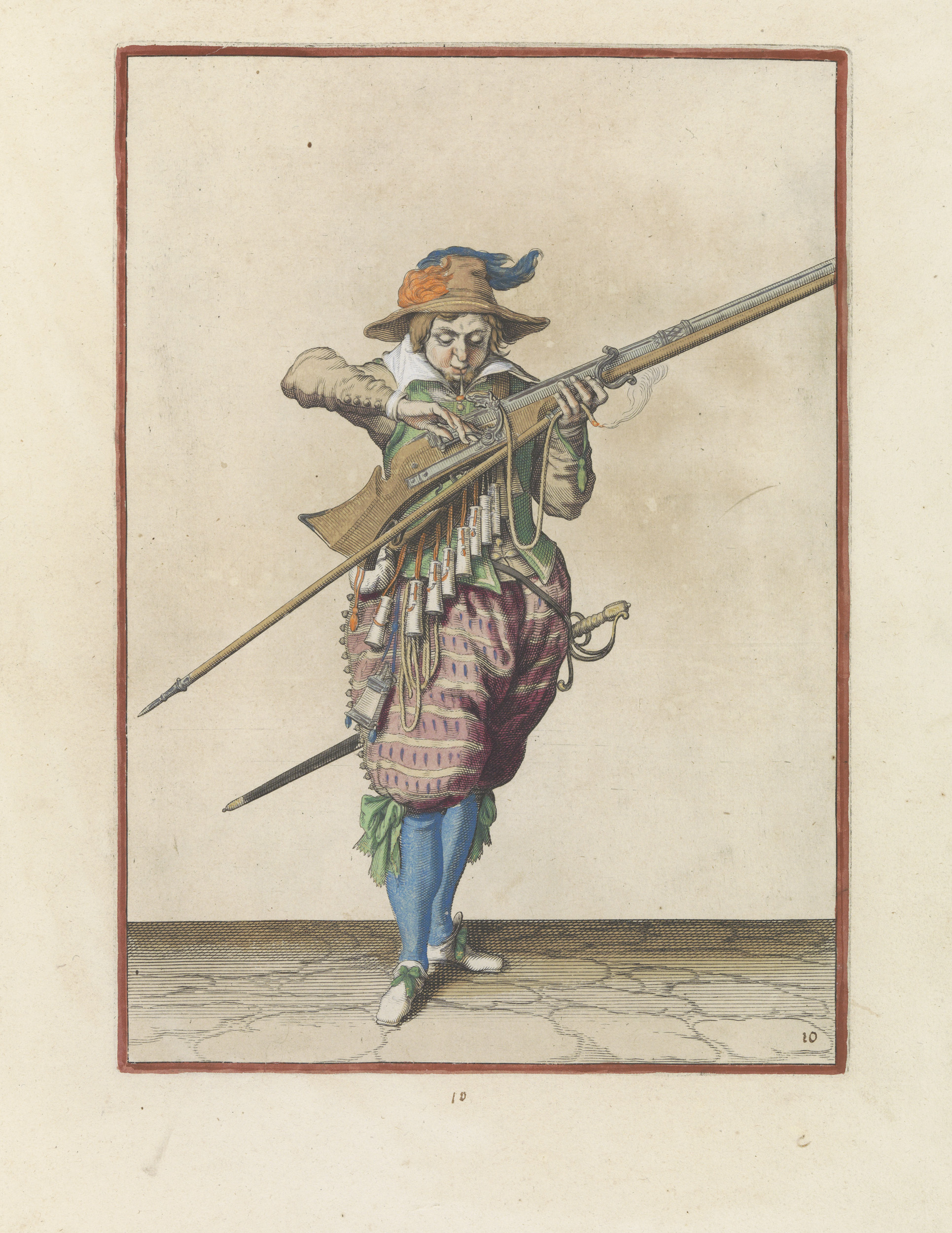 Soldaat die zijn musket, steunend op zijn furket, af...