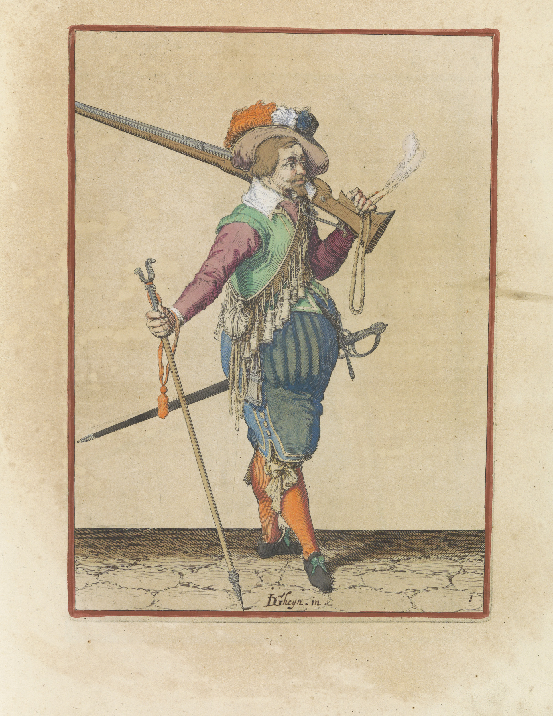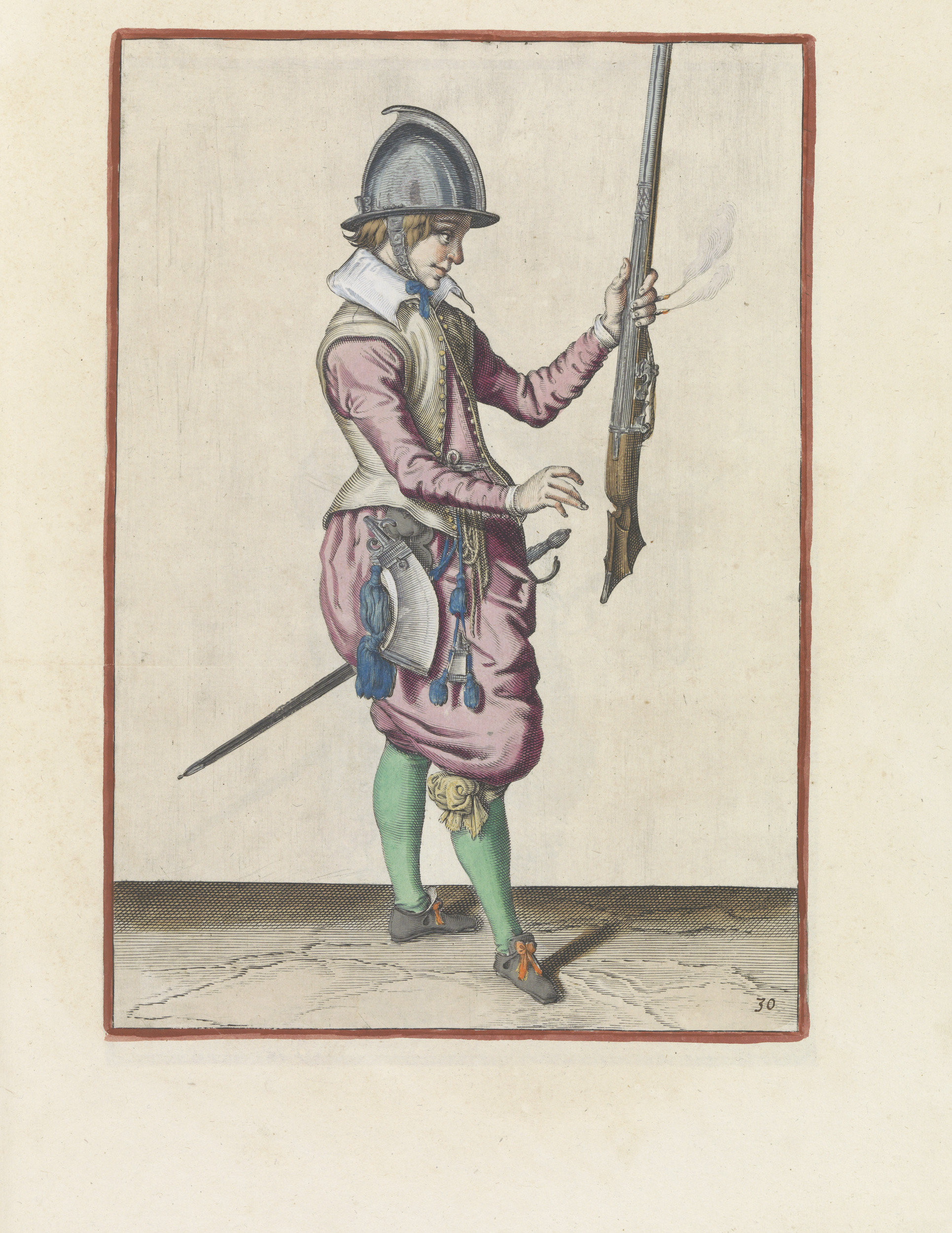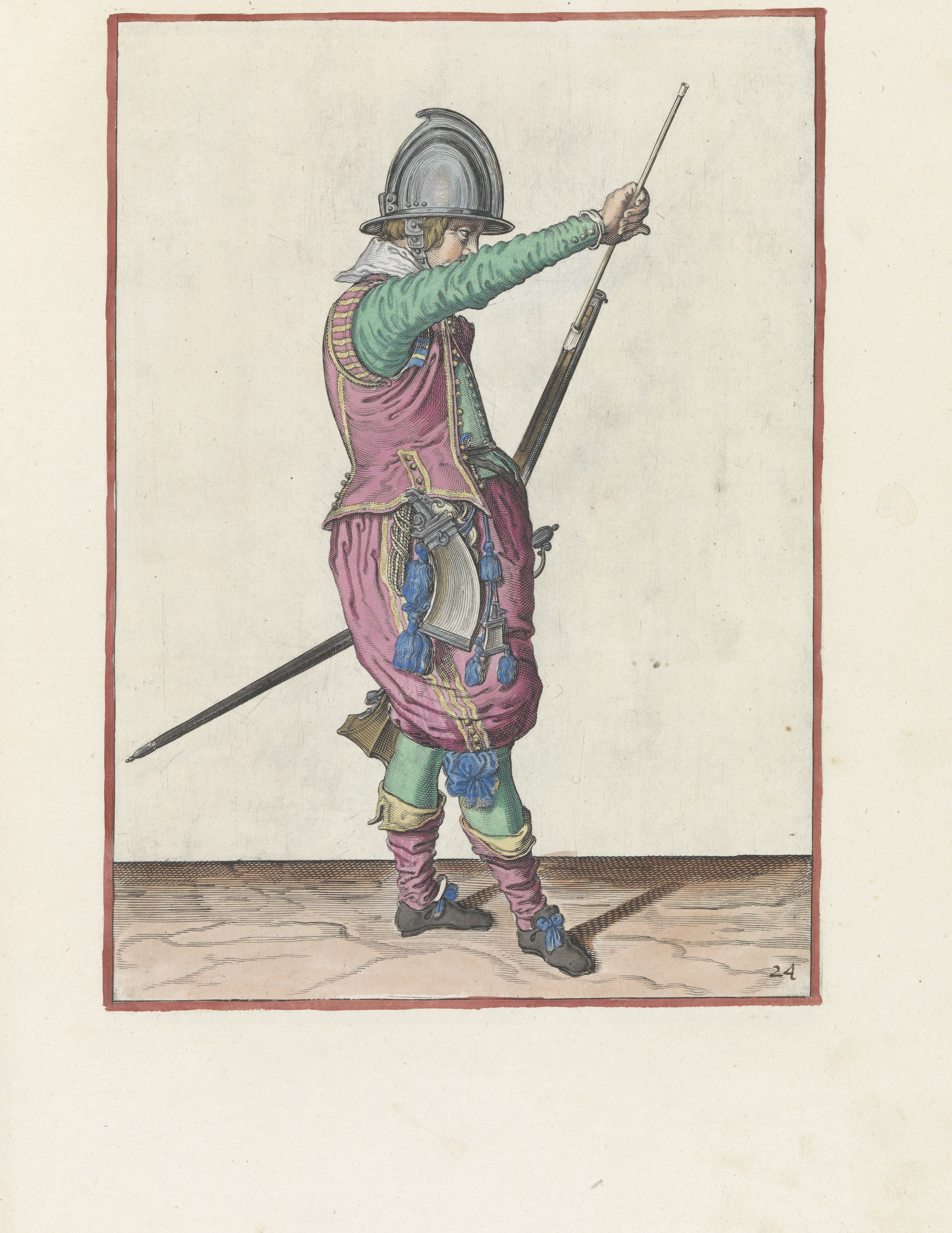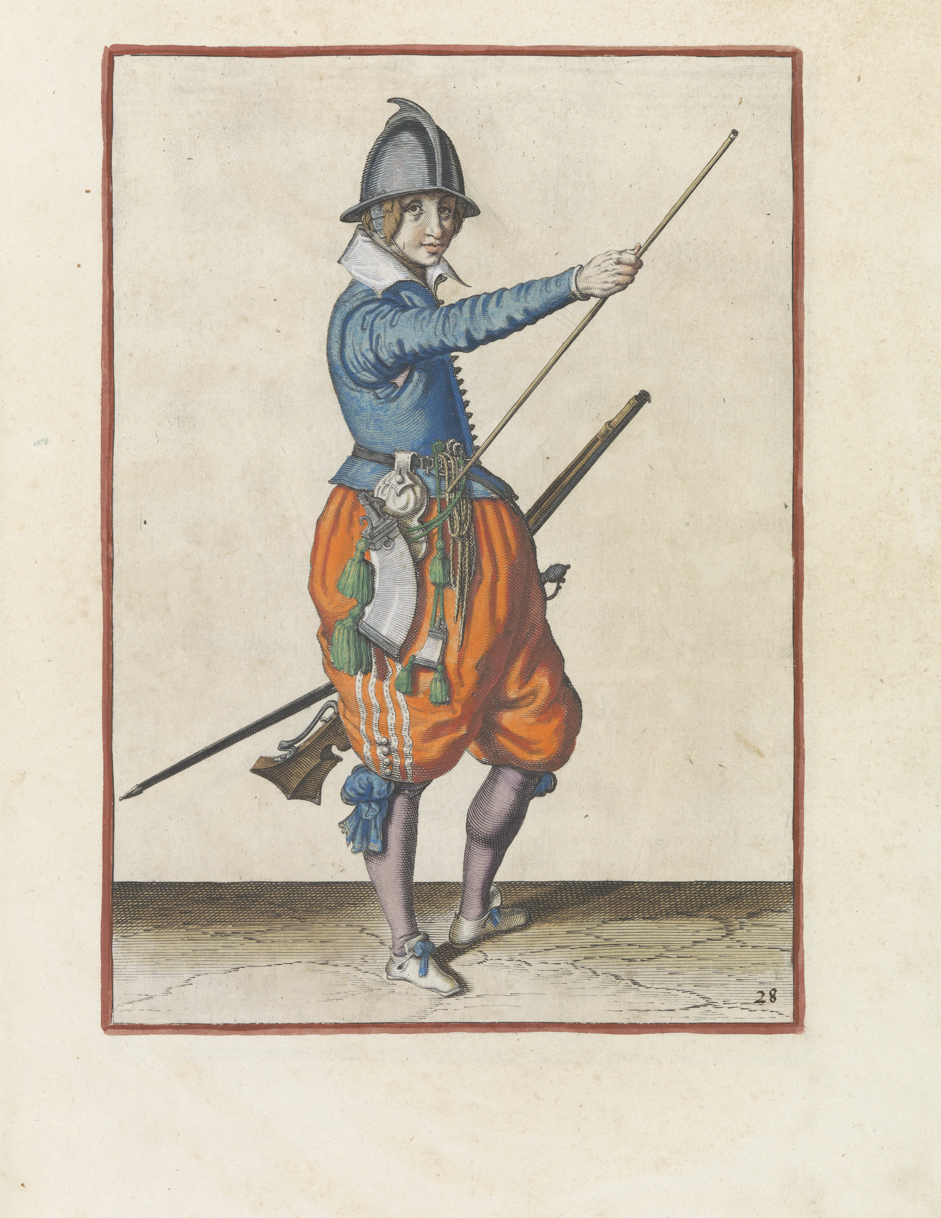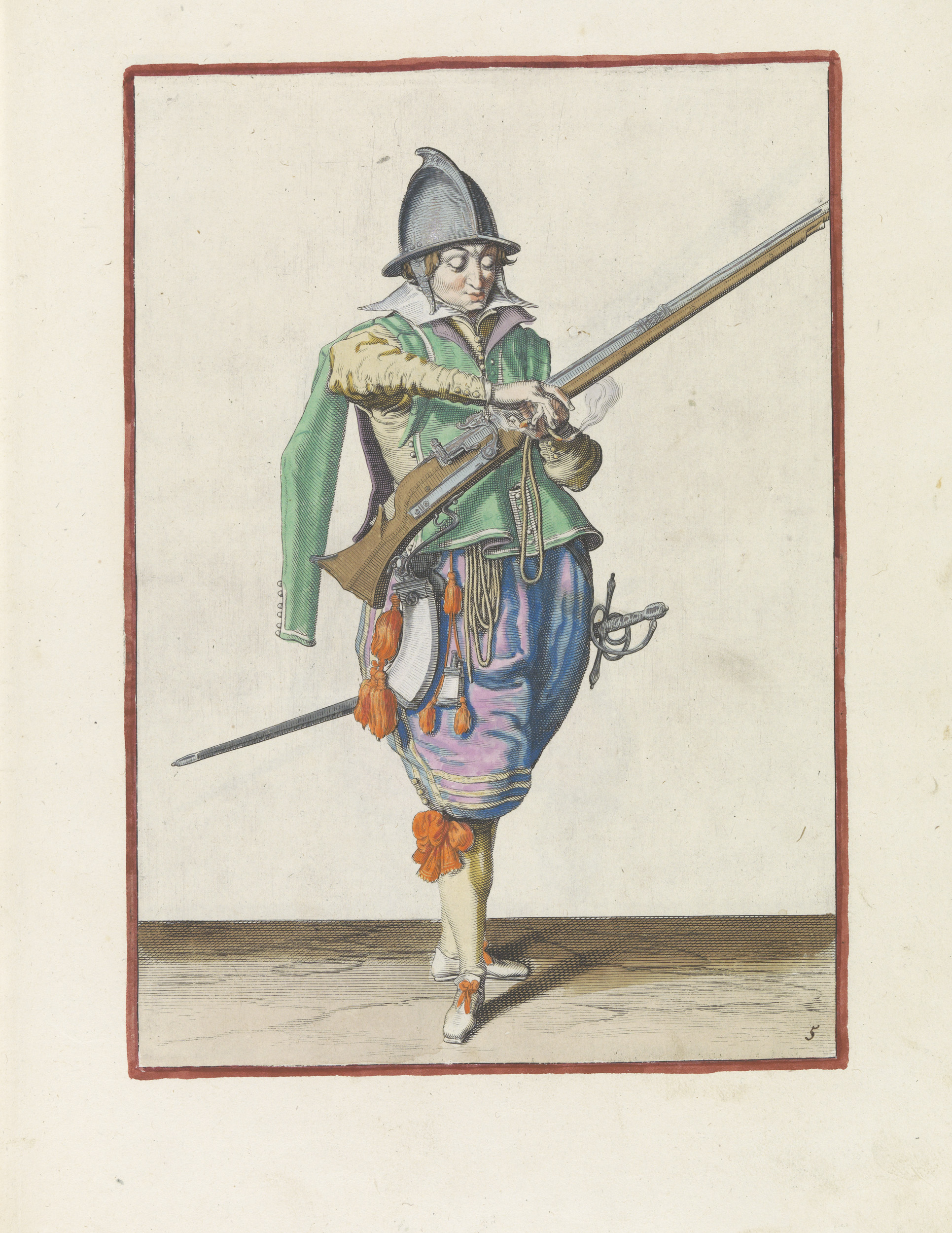 Soldaat die zijn musket, steunend op zijn furket, af...