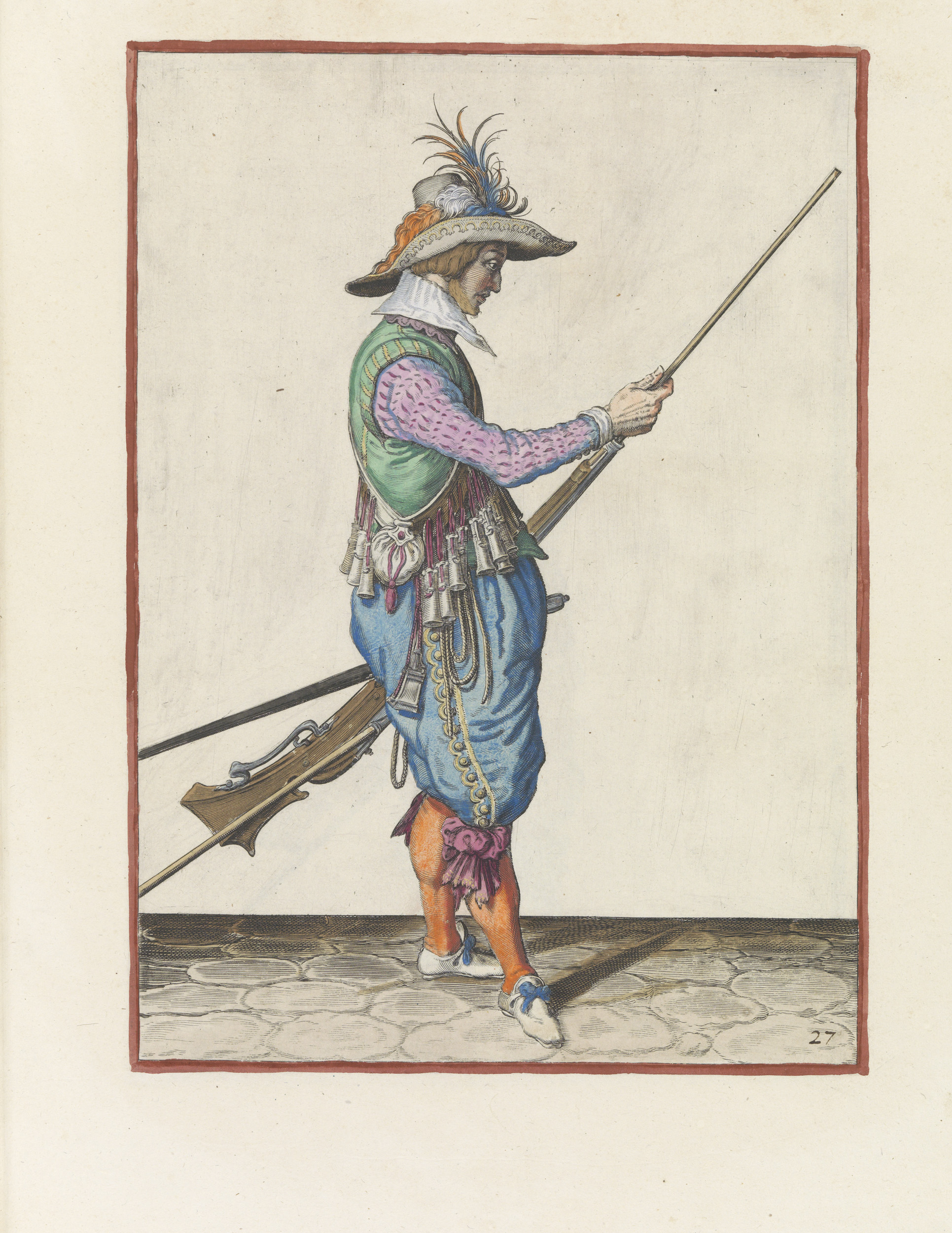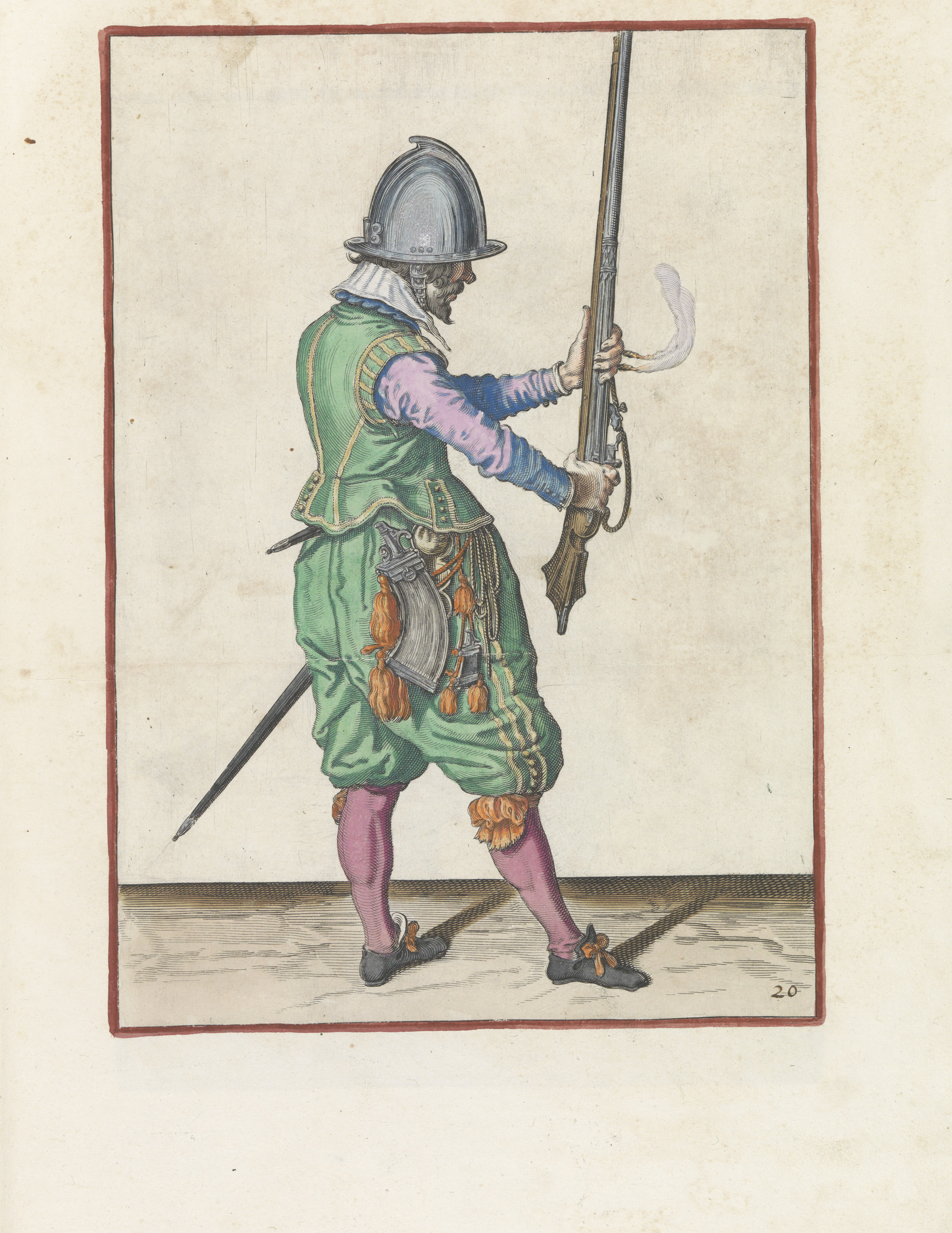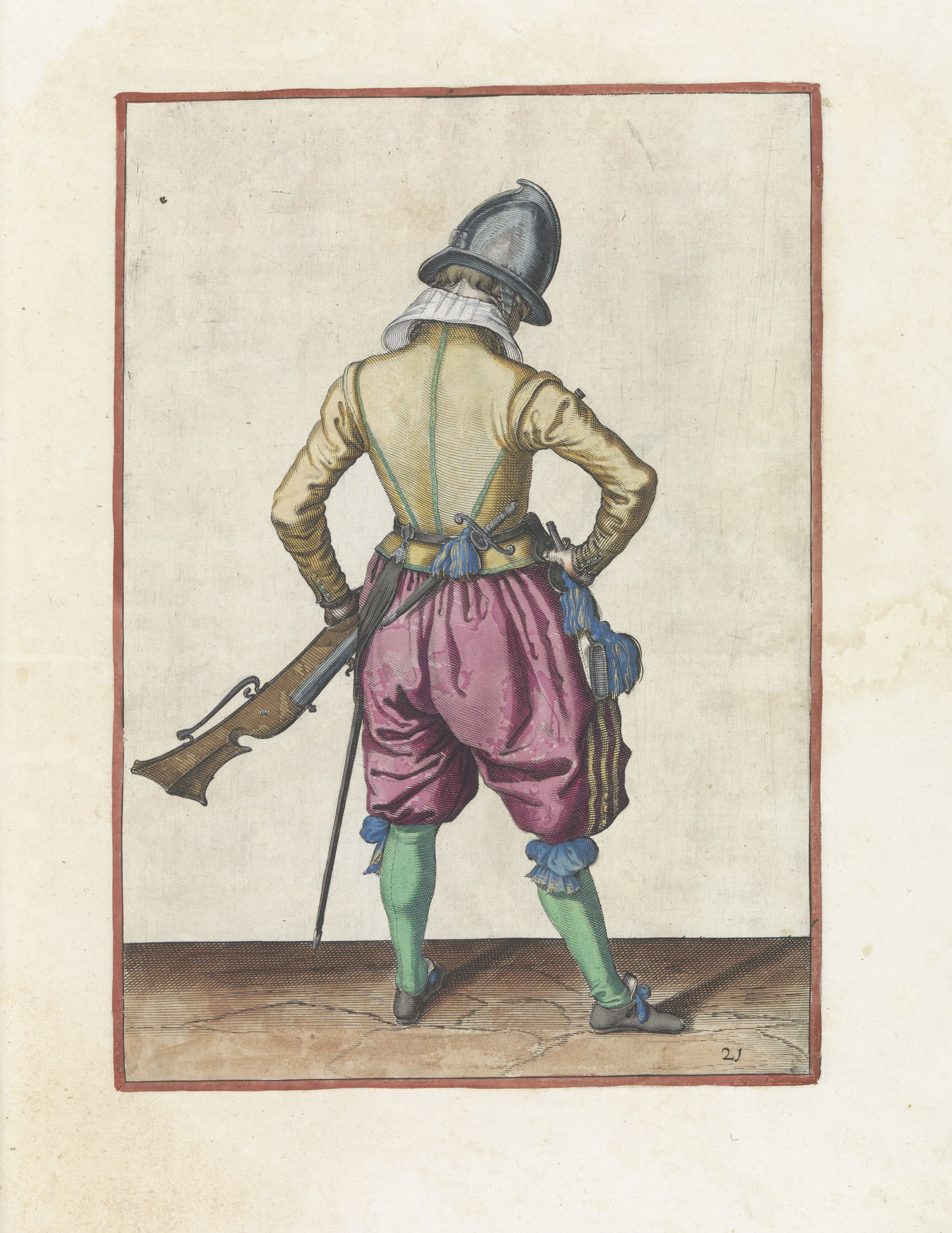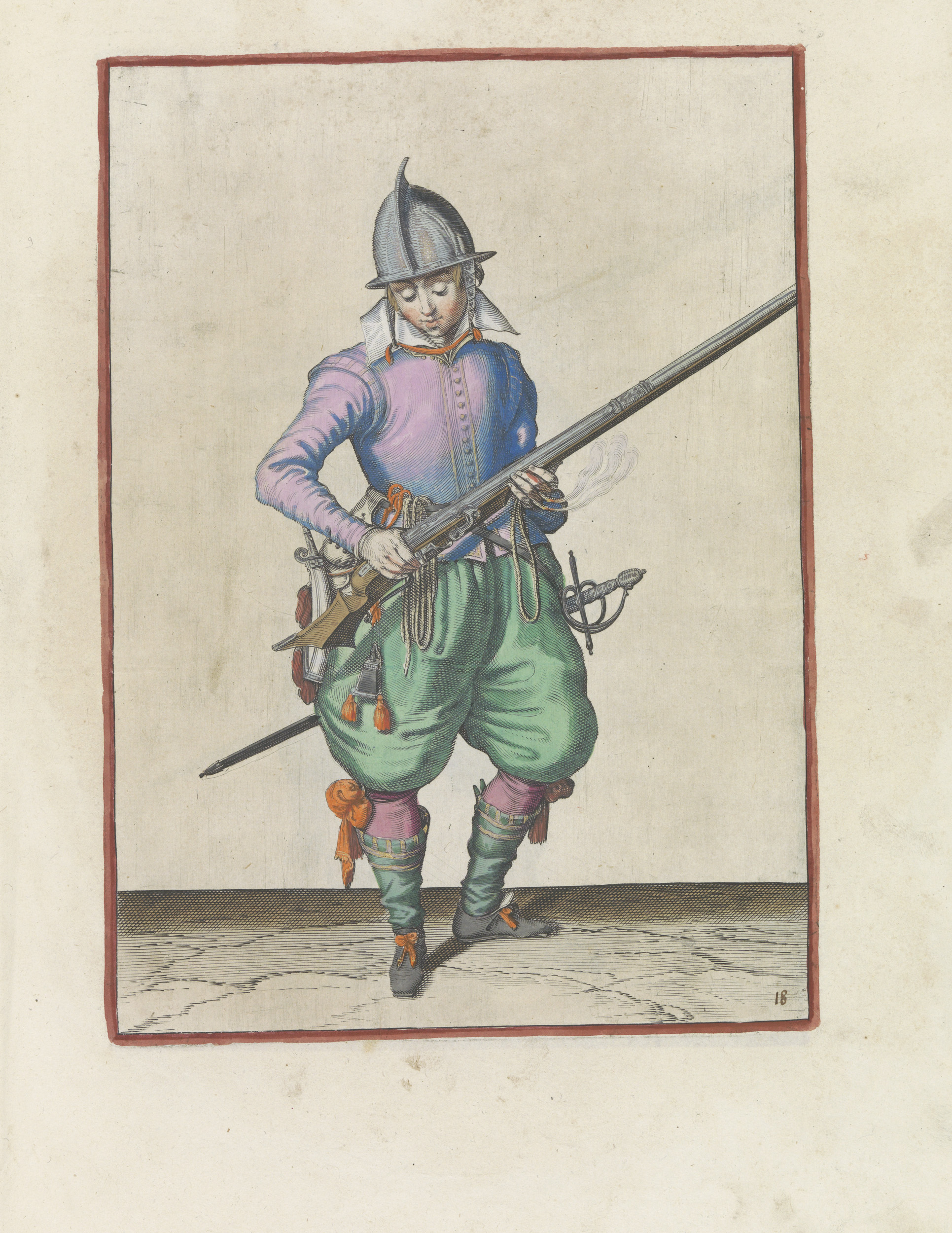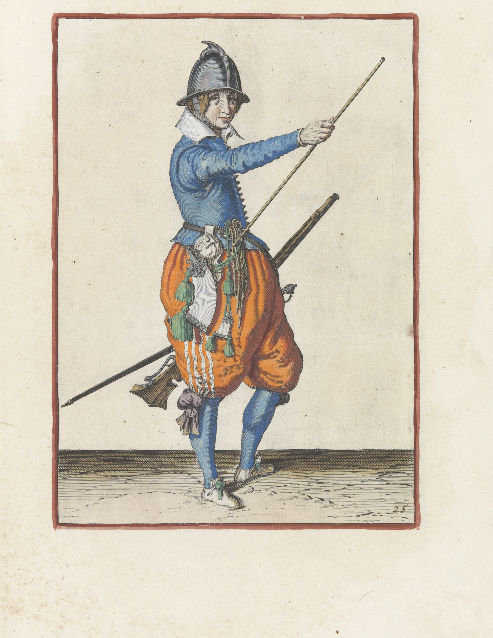 Soldaat die zijn musket, steunend op zijn furket, af...