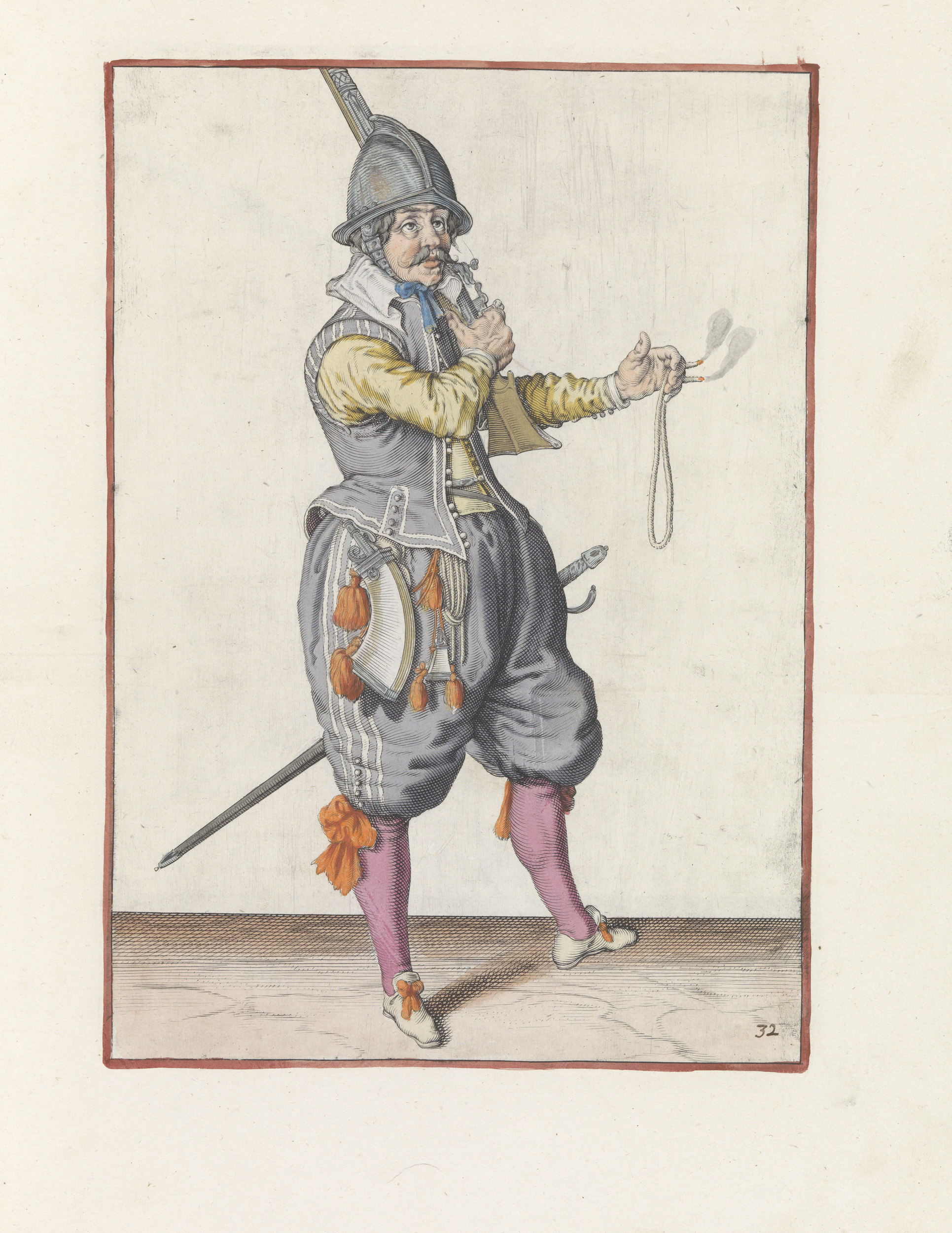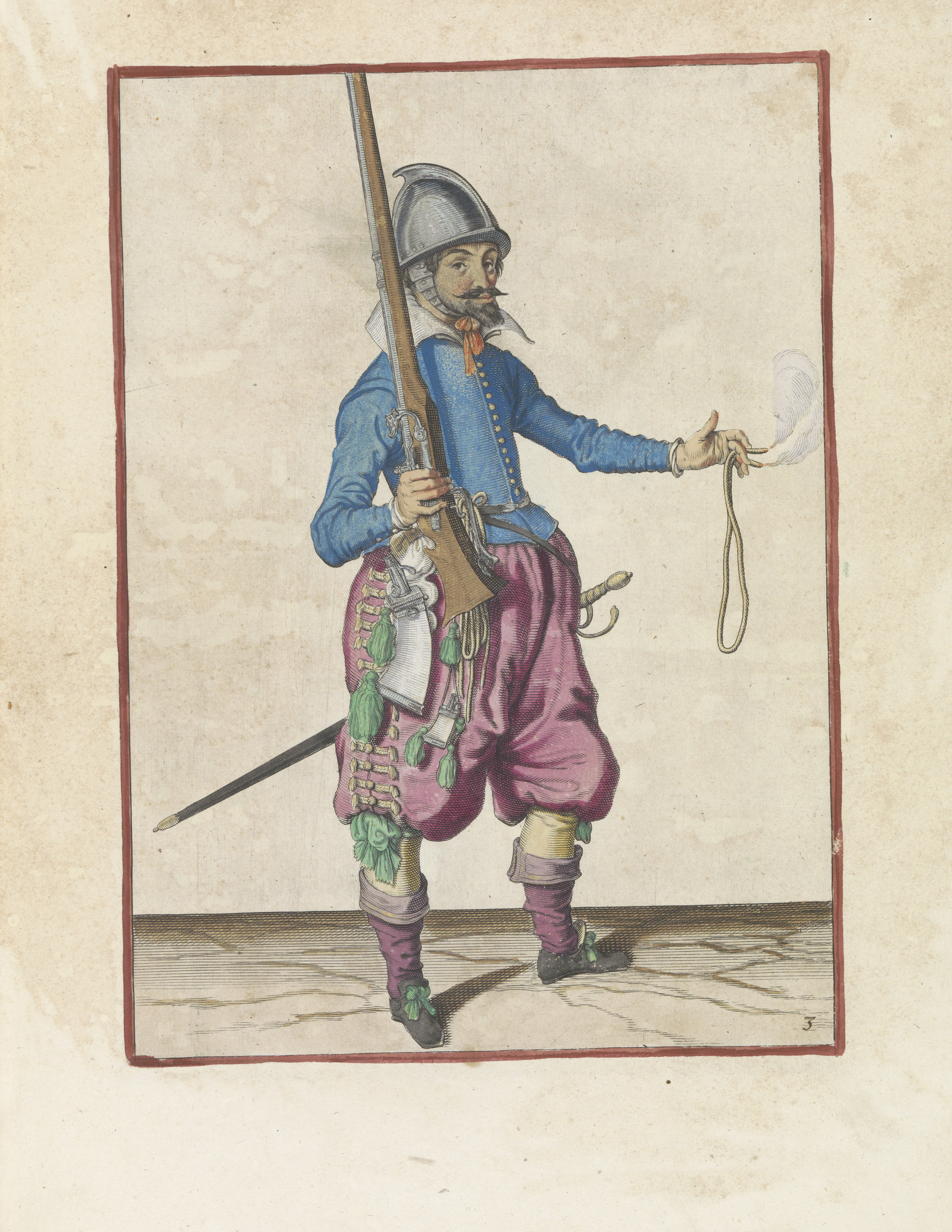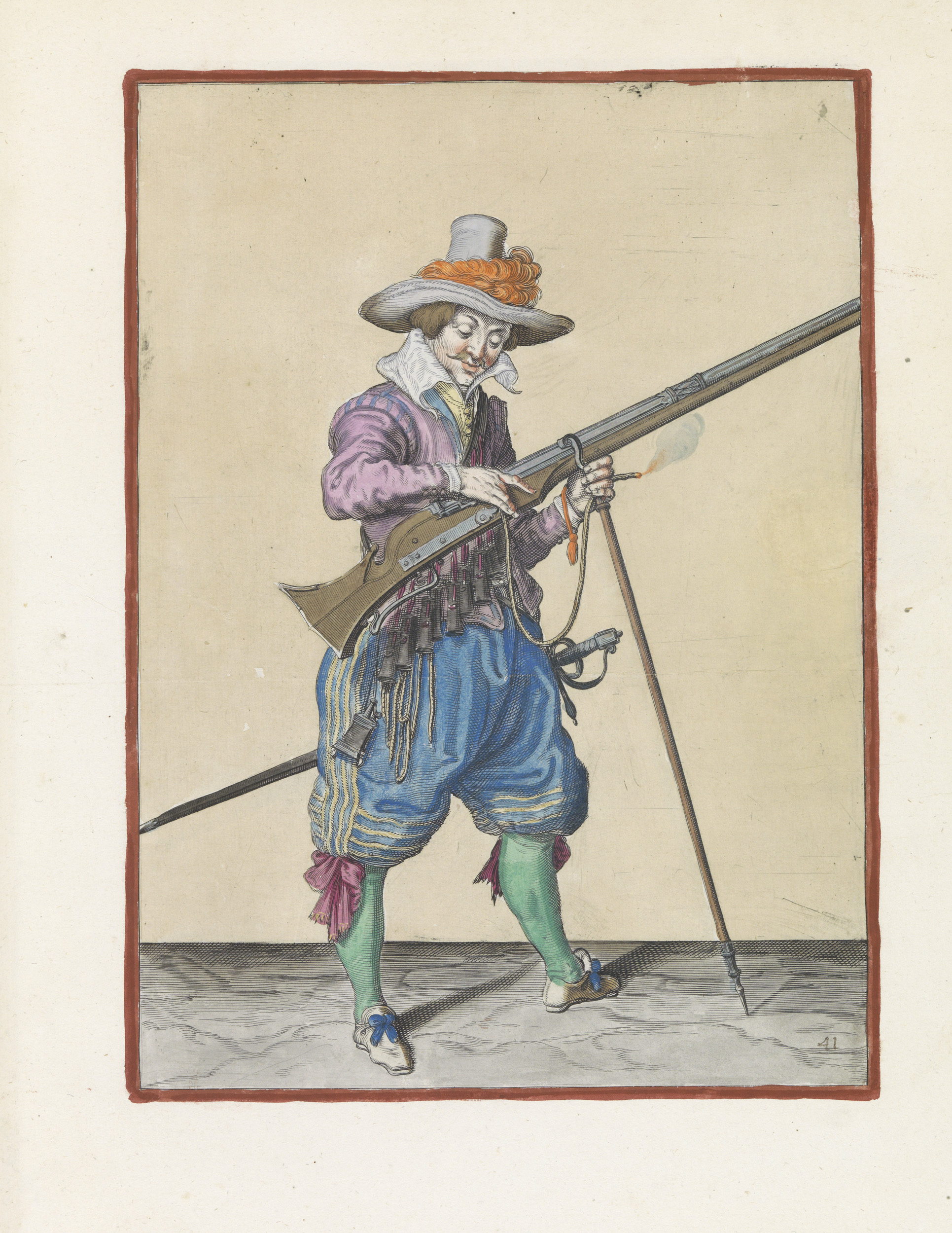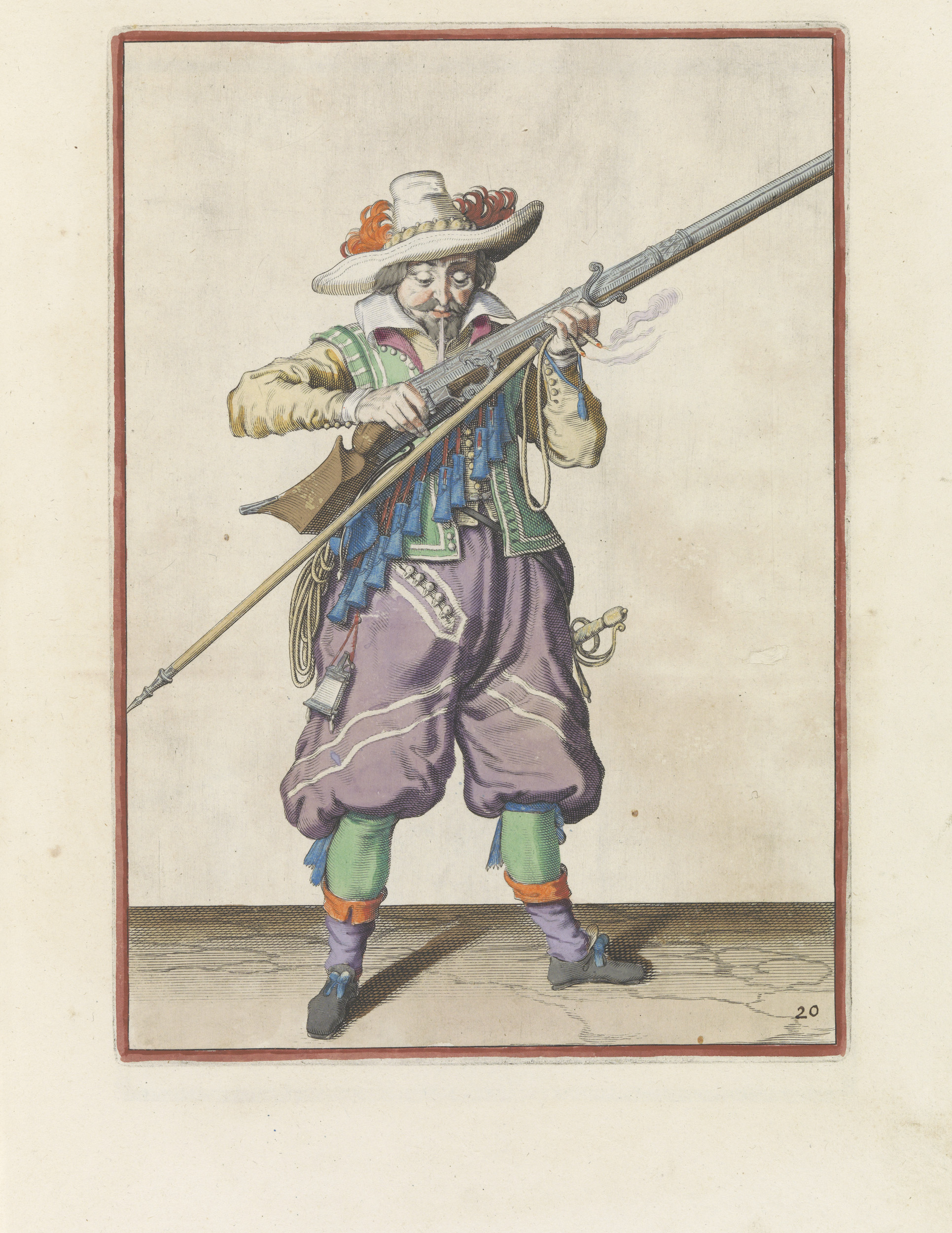 Soldaat die zijn lont op de haan van zijn musket drukt