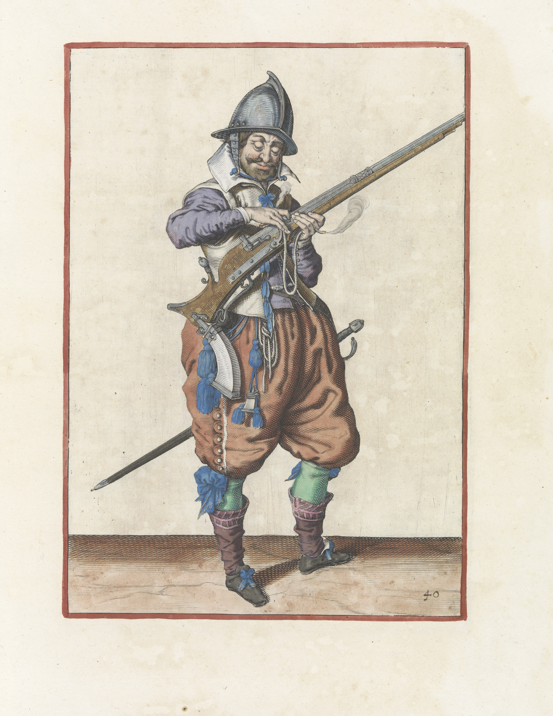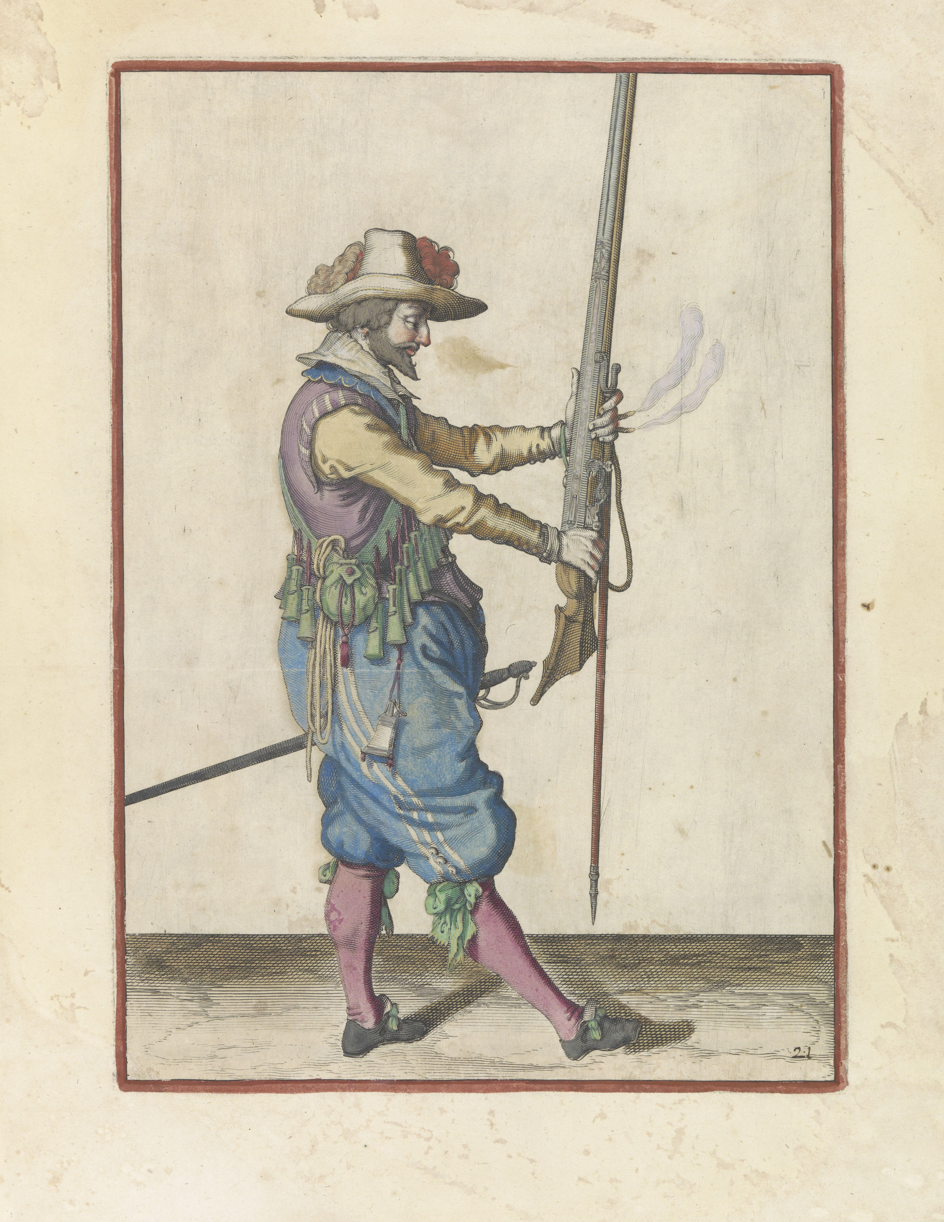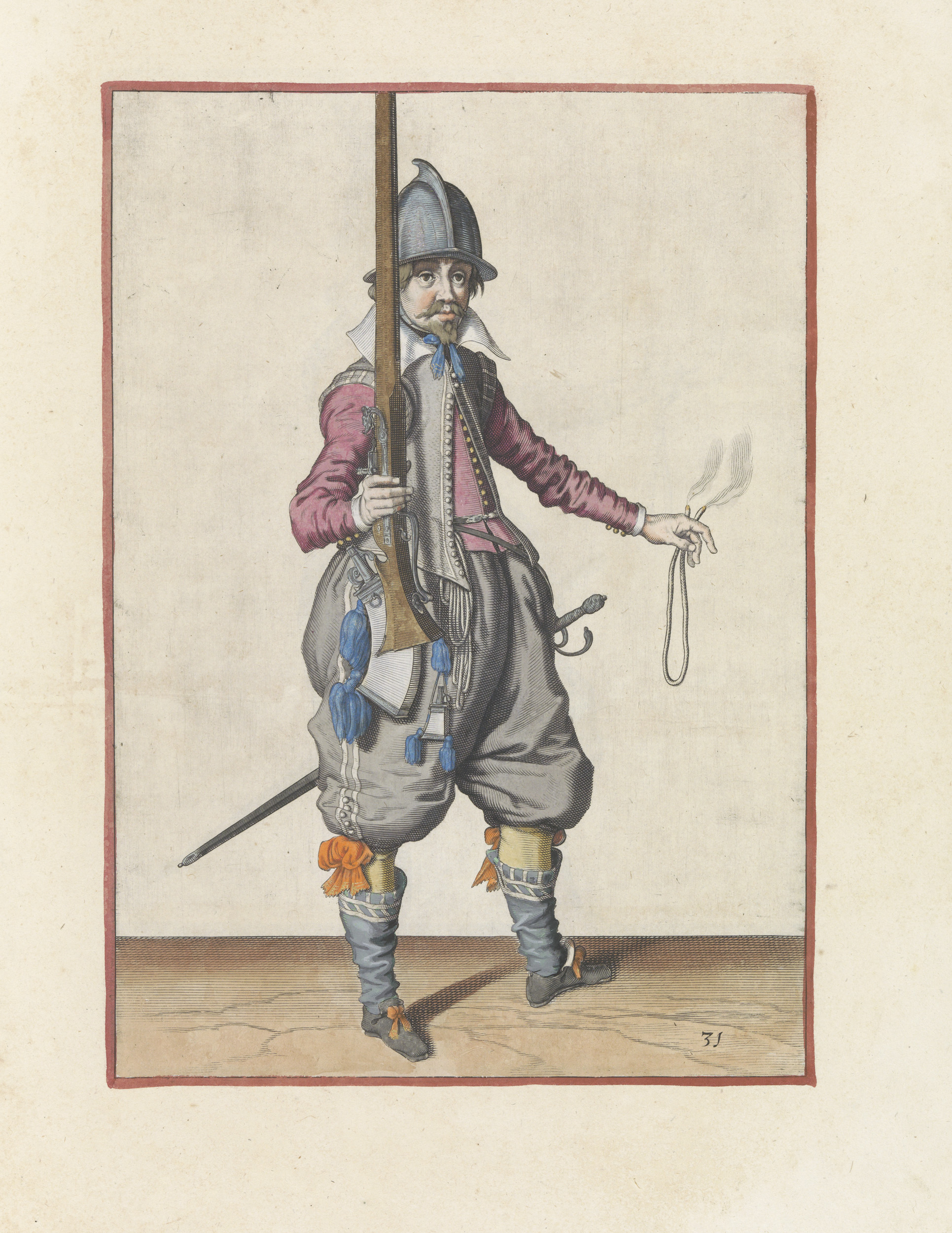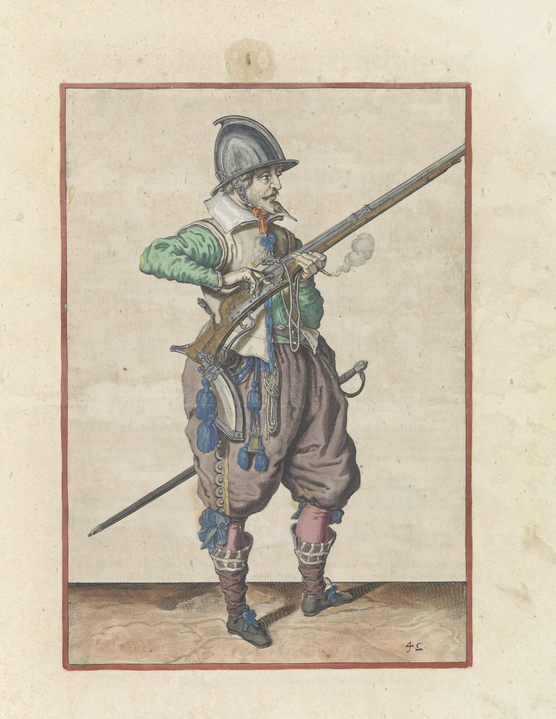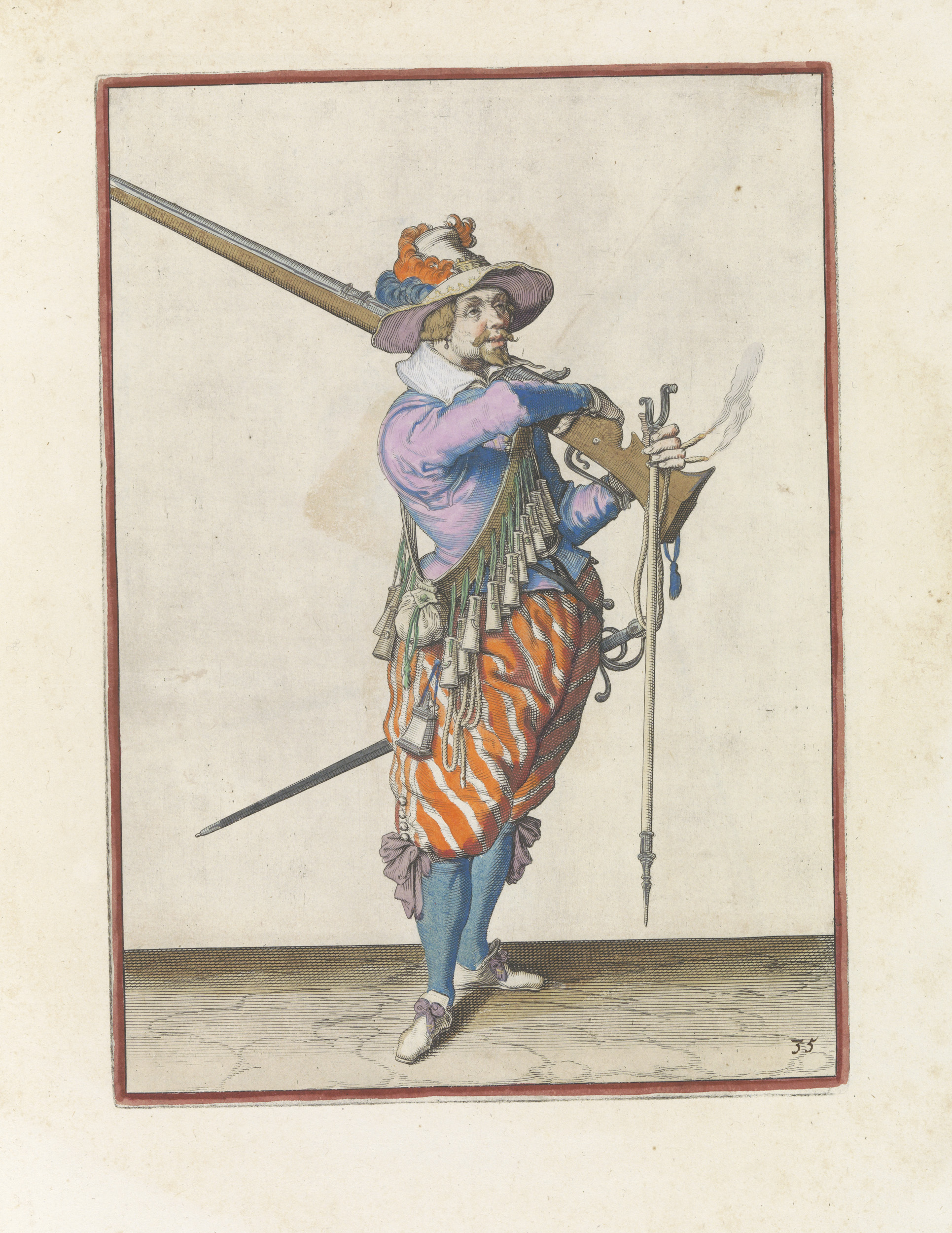 Soldaat die zijn lont op de haan van zijn musket drukt