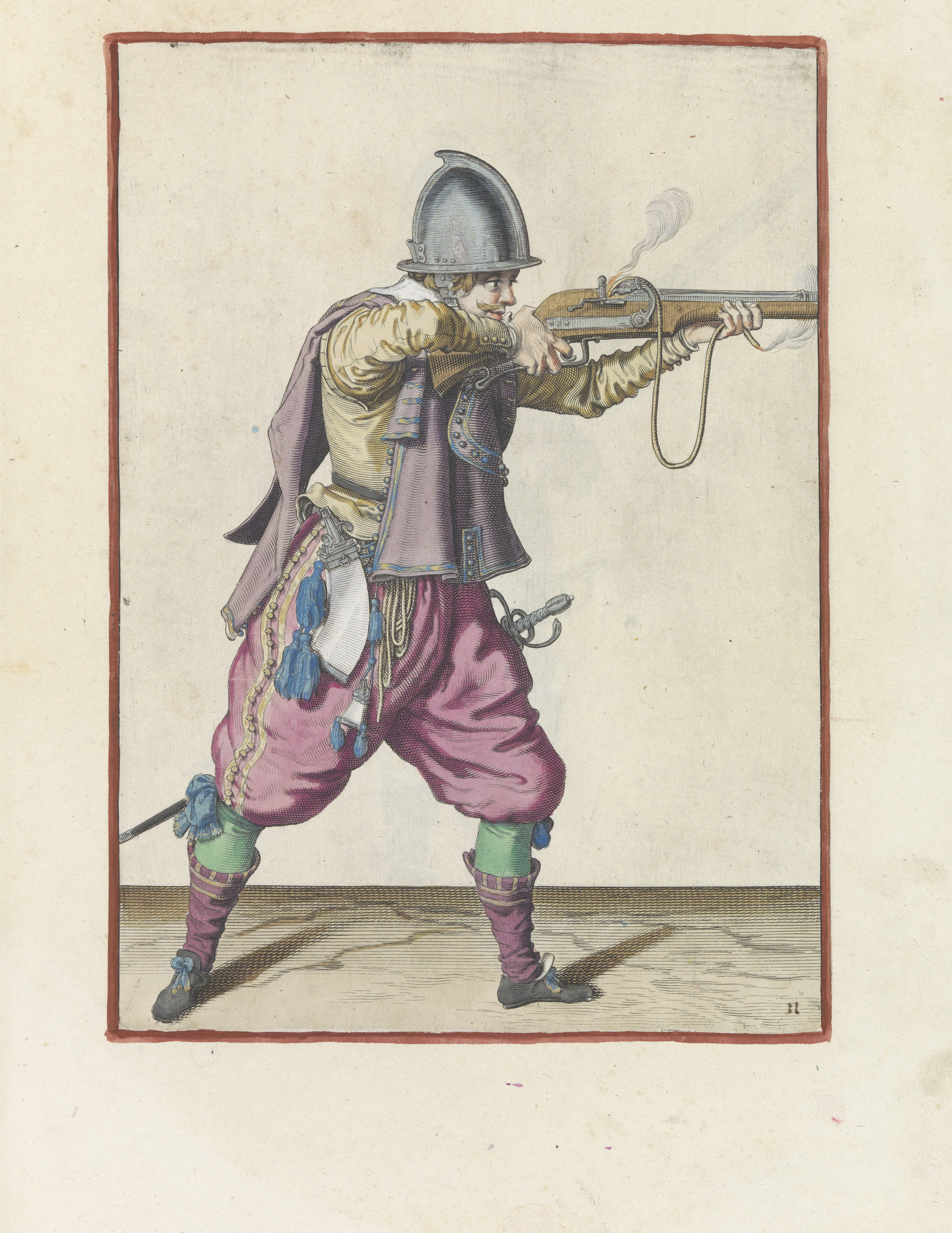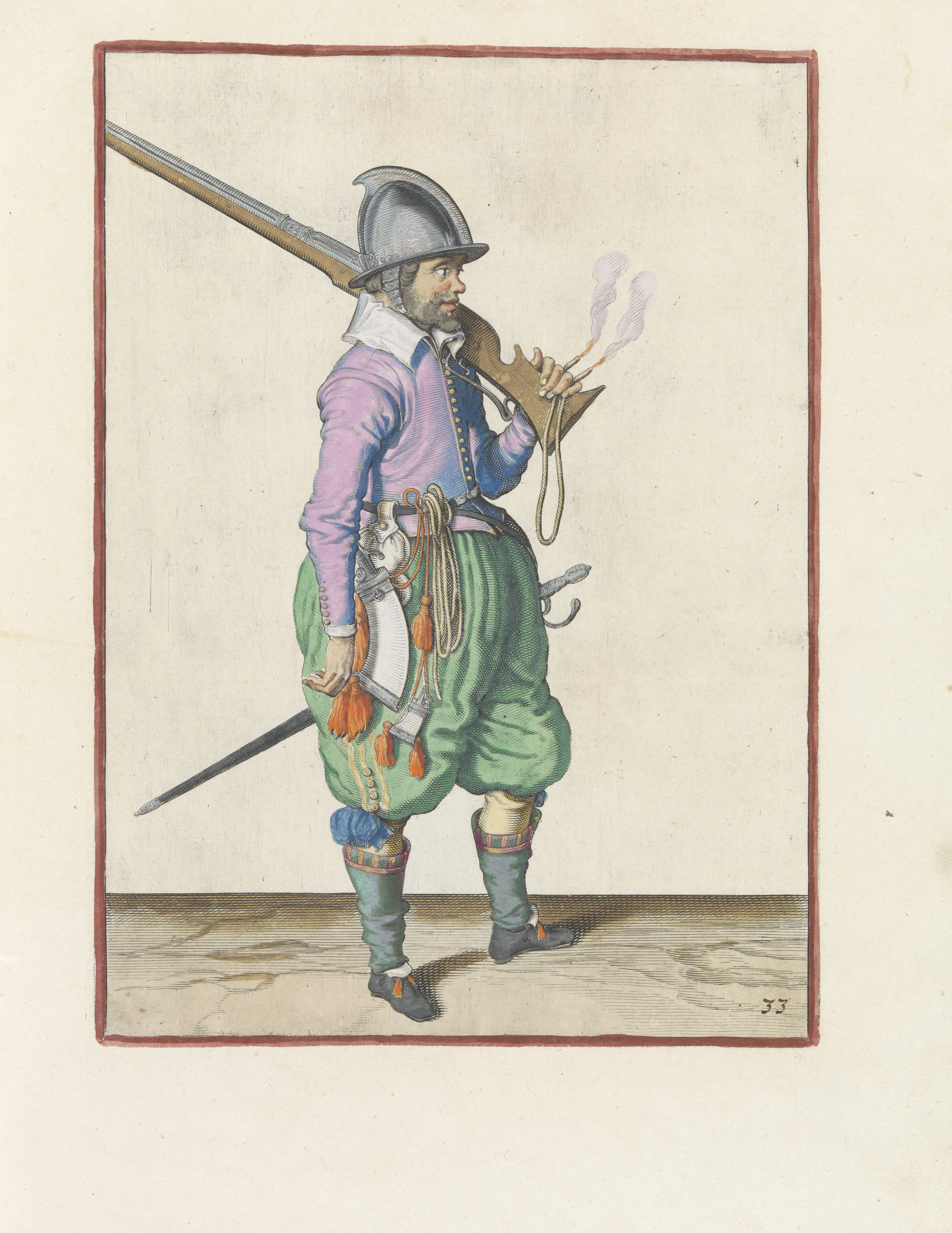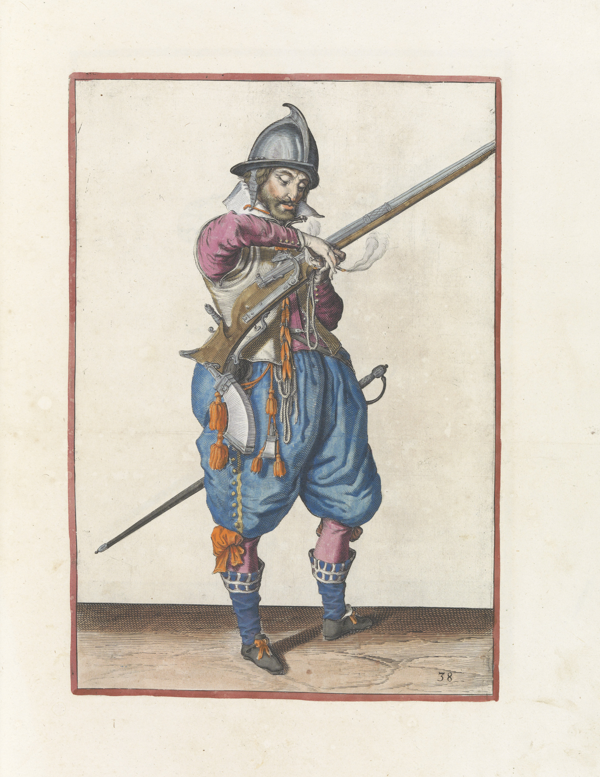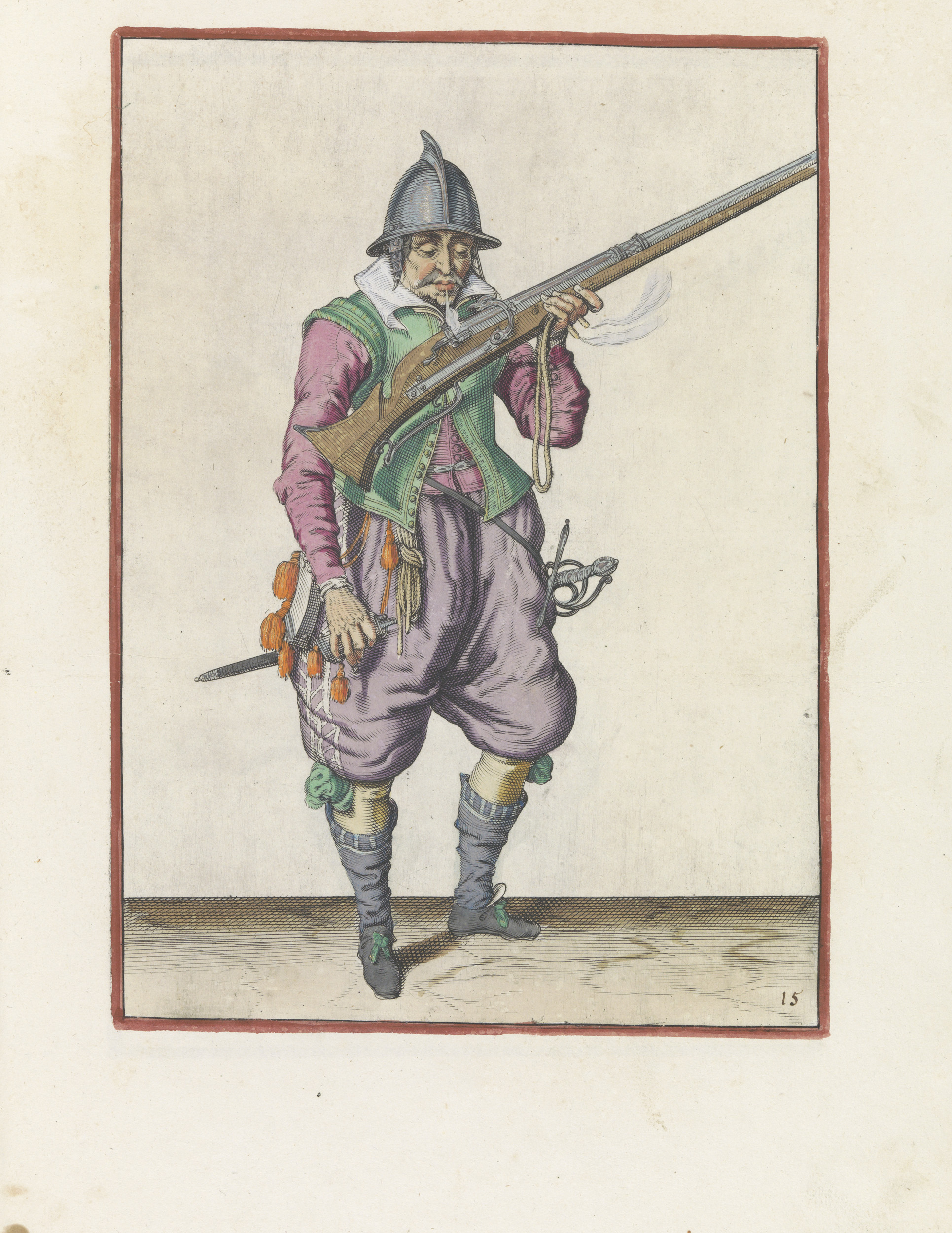 Soldaat die zijn lont op de haan van zijn musket drukt