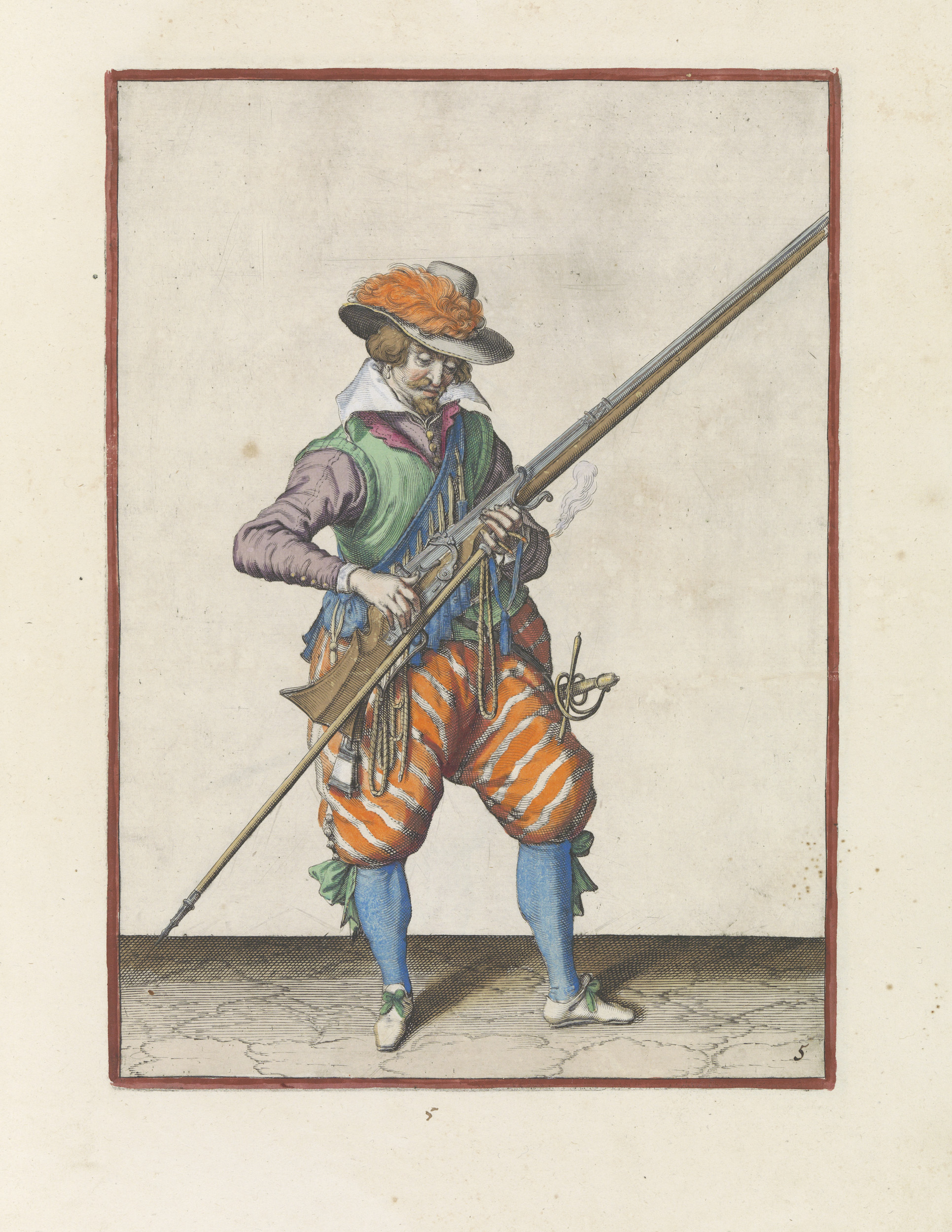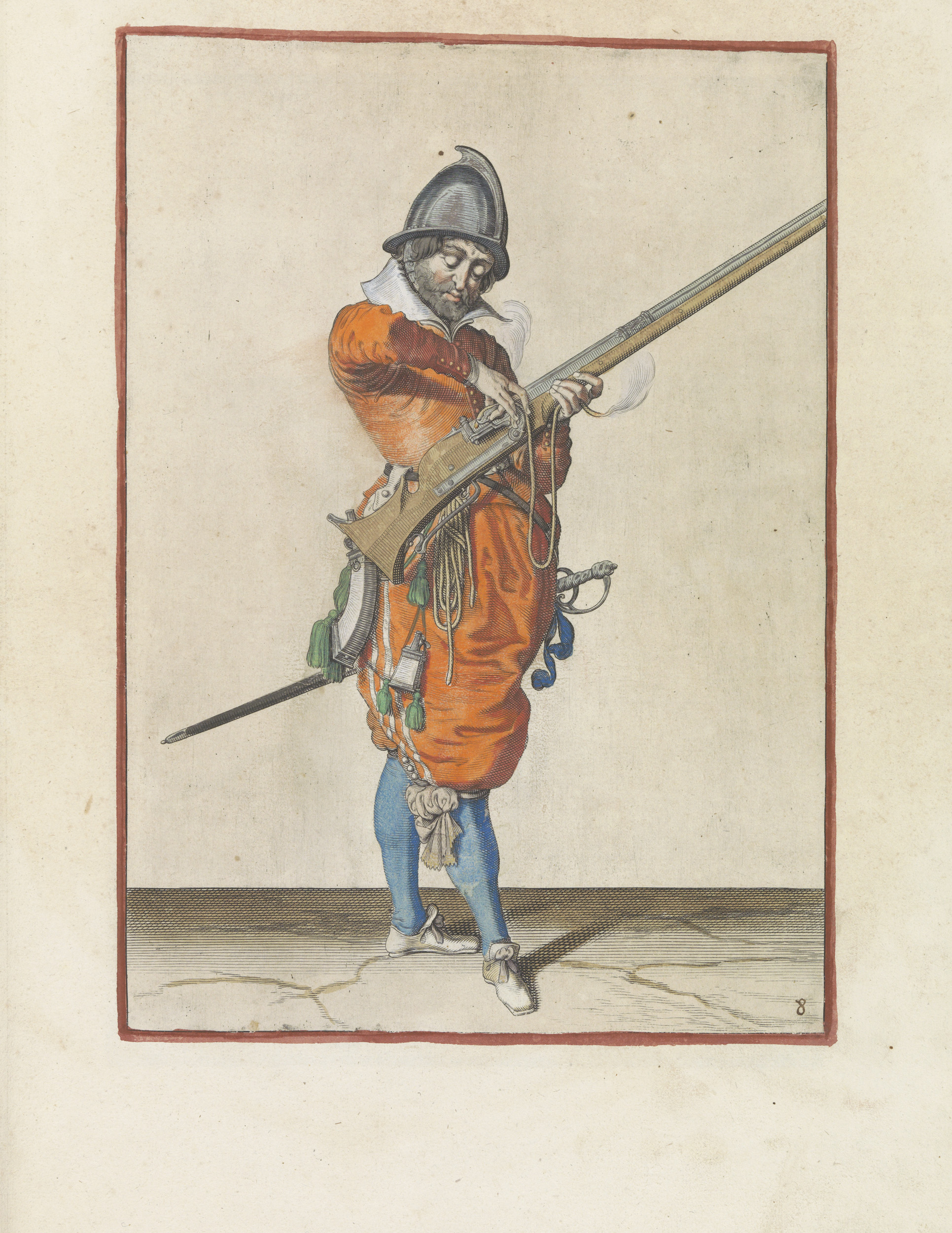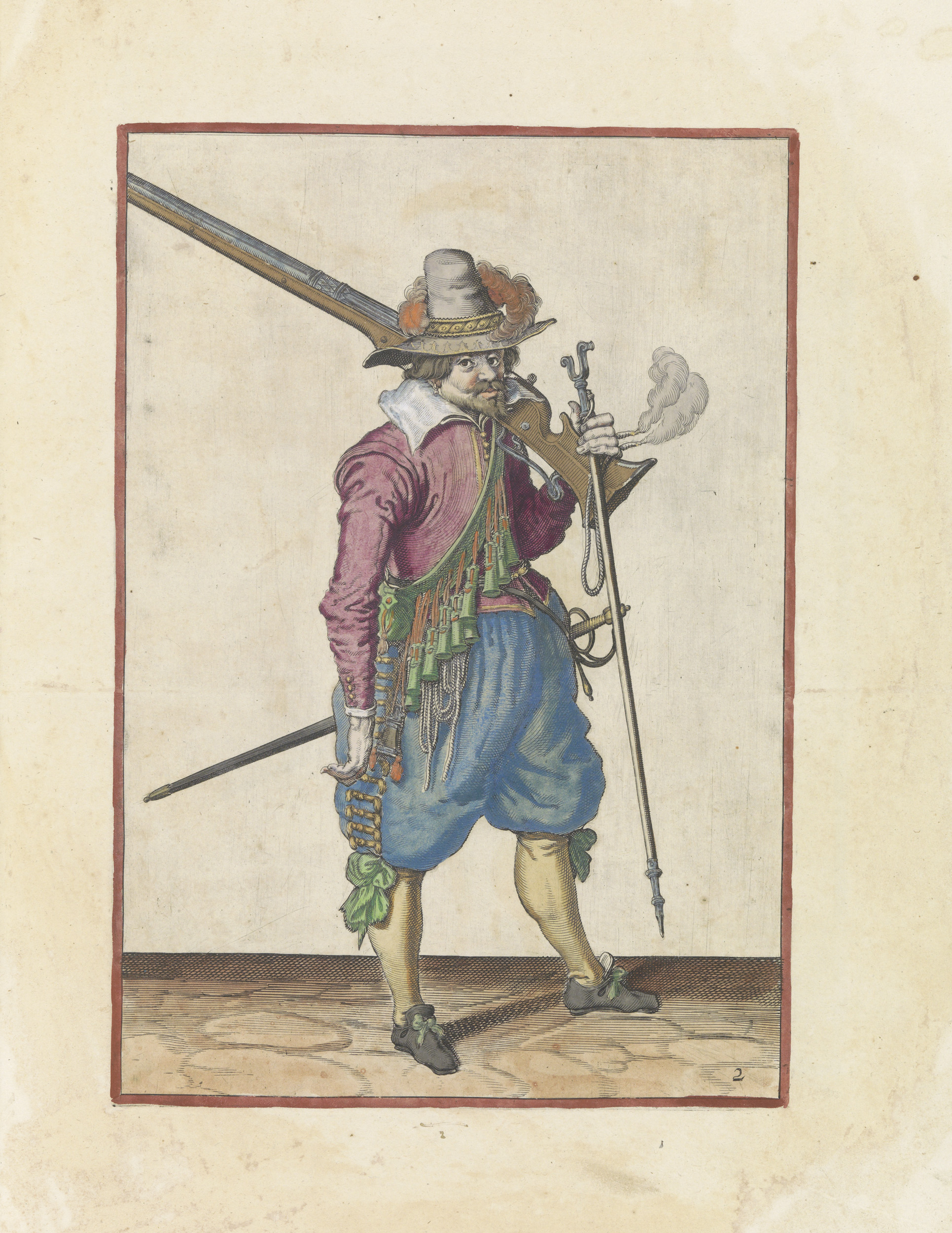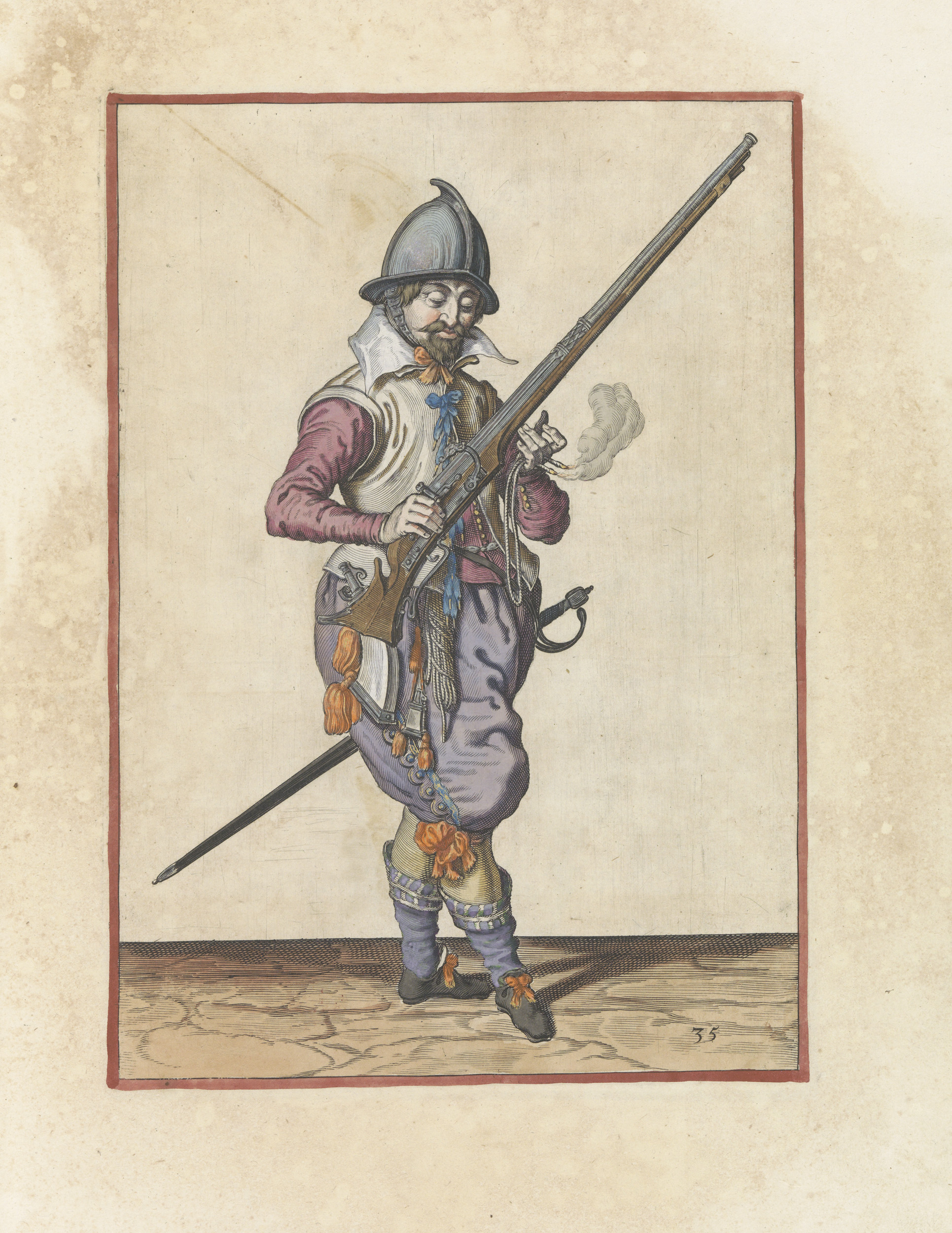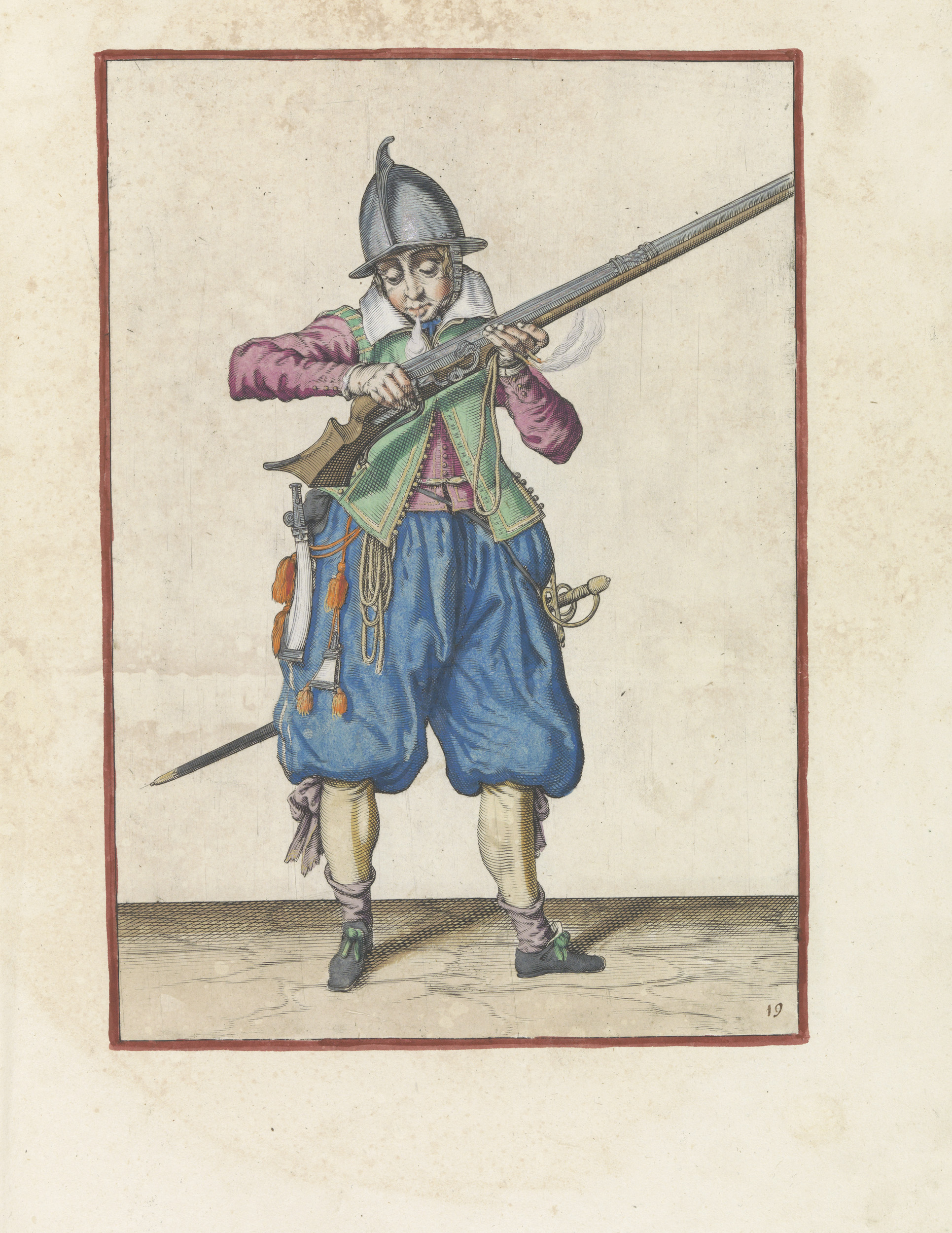 Soldaat die zijn lont op de haan van zijn musket drukt
