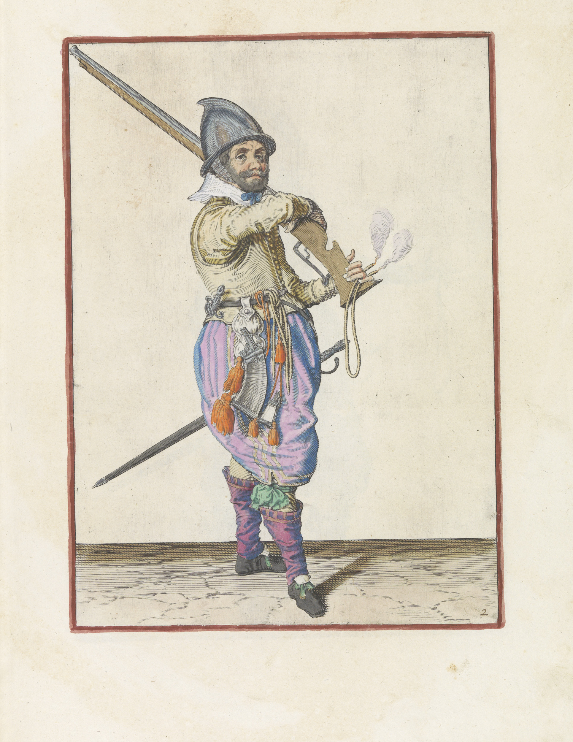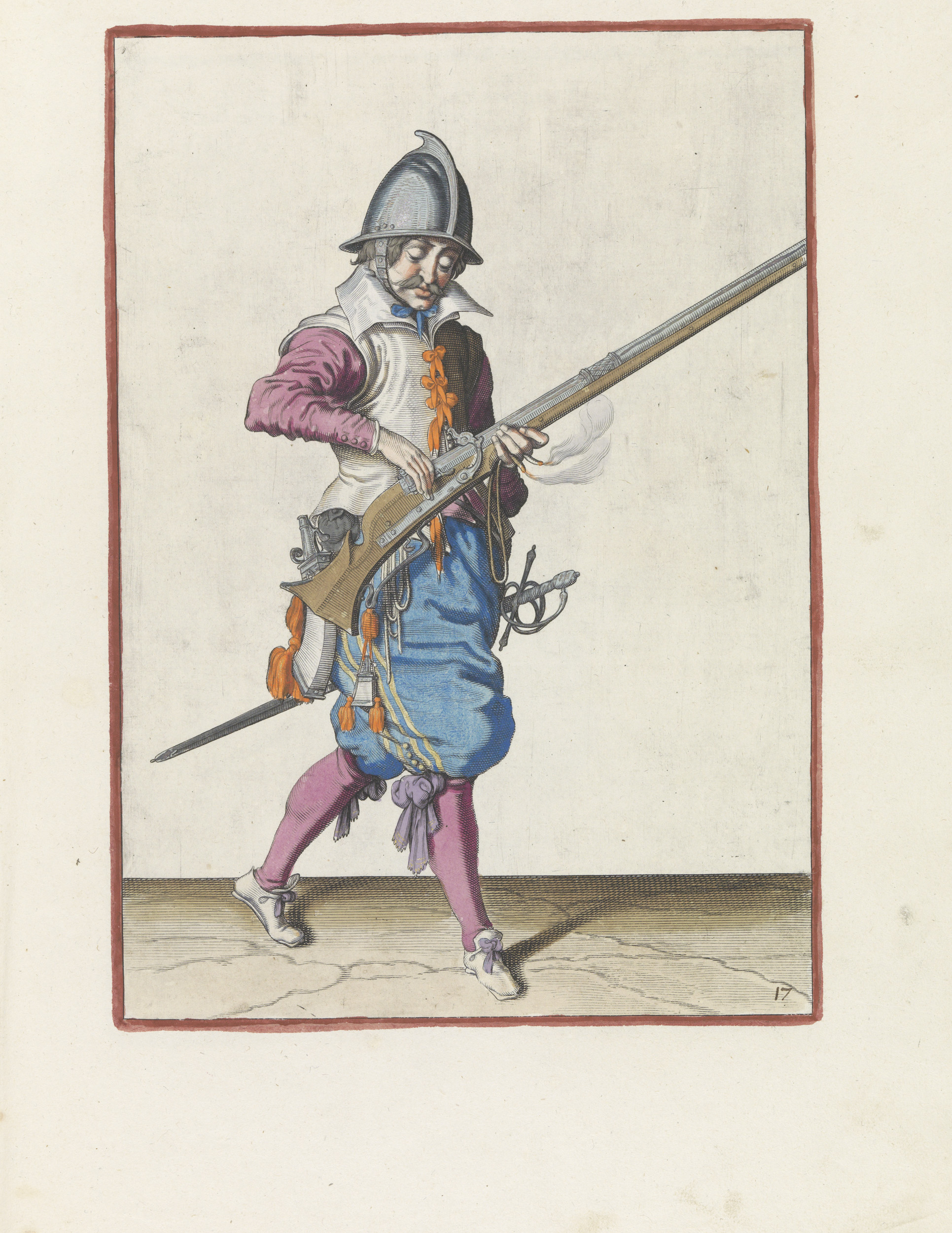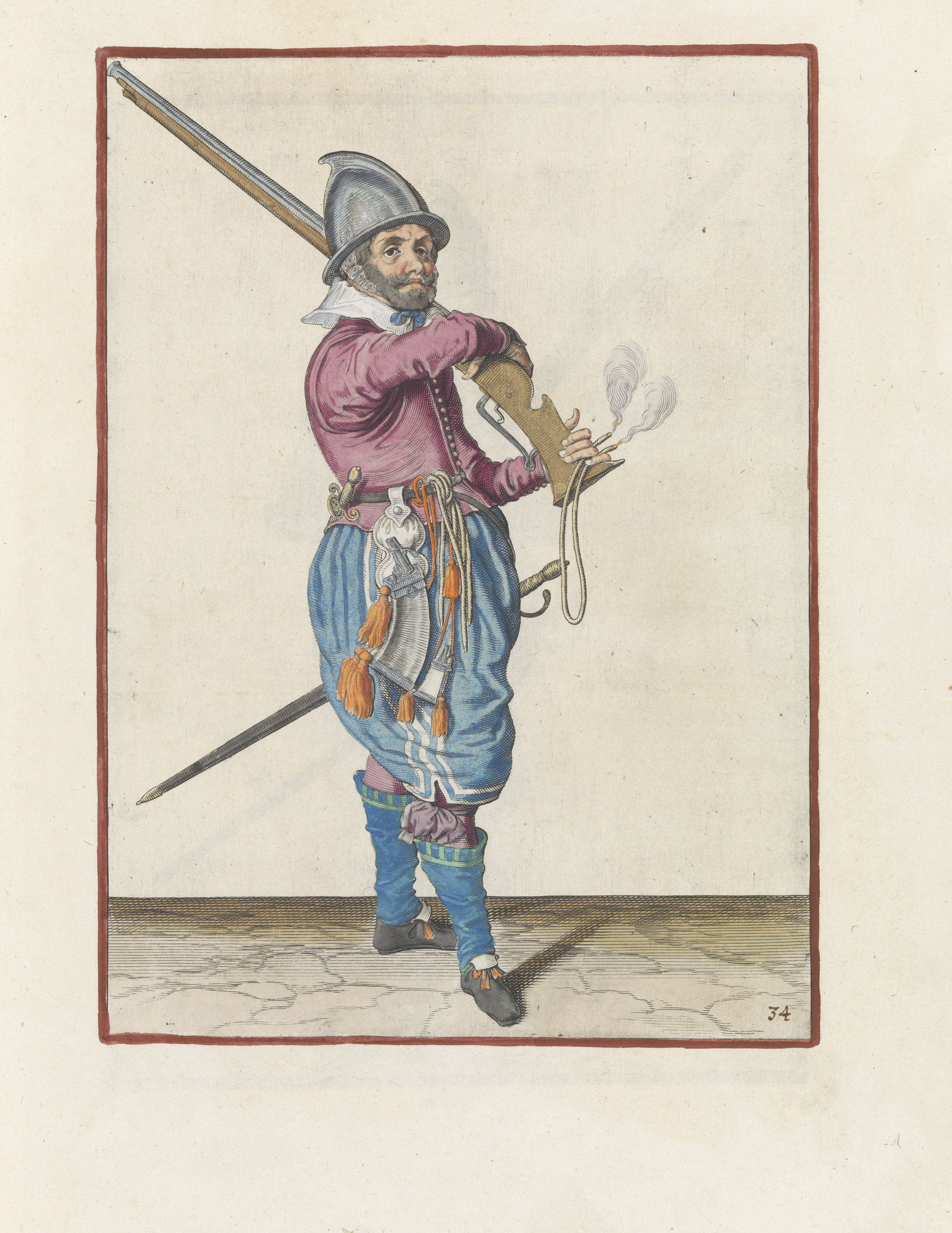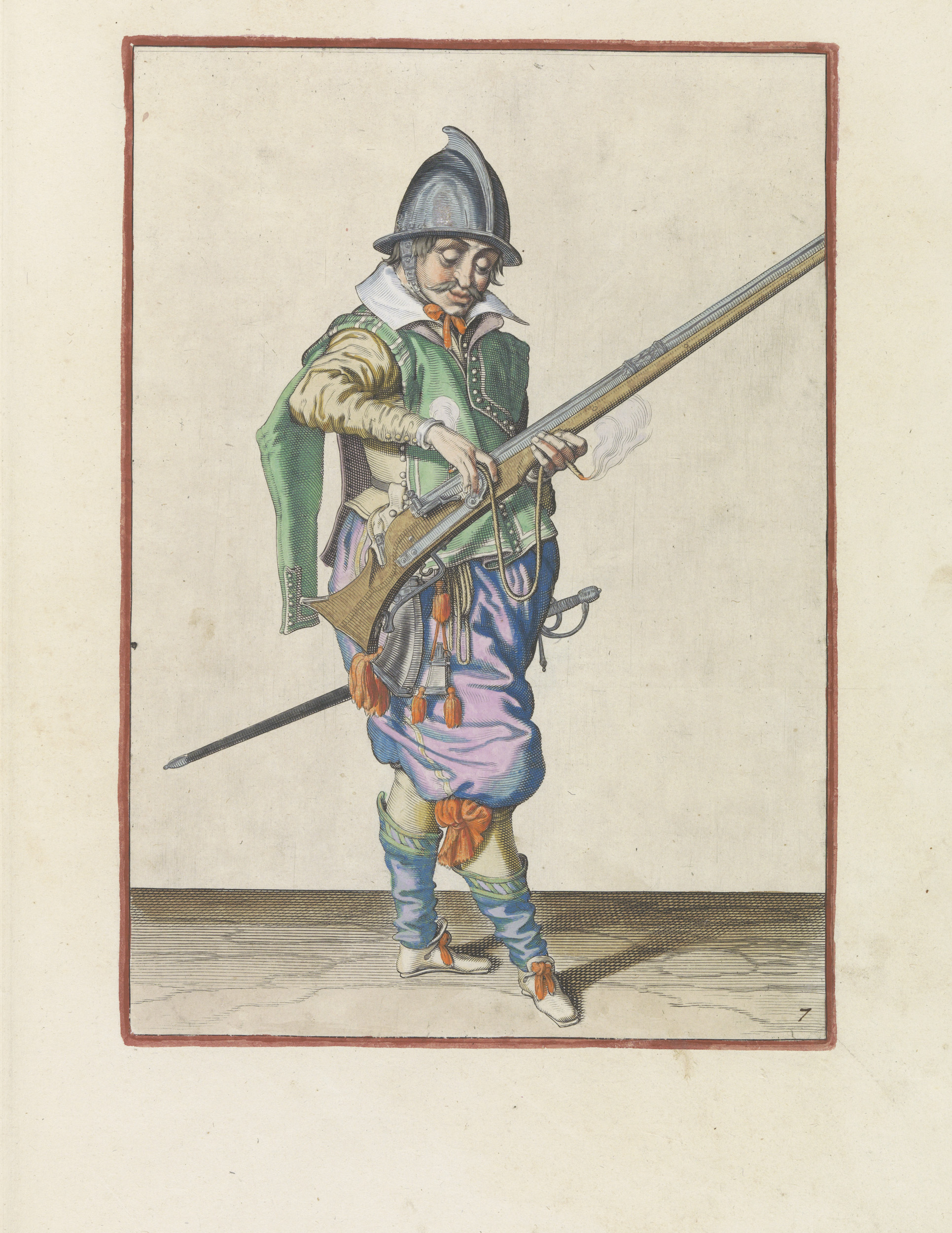 Soldaat die zijn lont op de haan van zijn musket drukt
