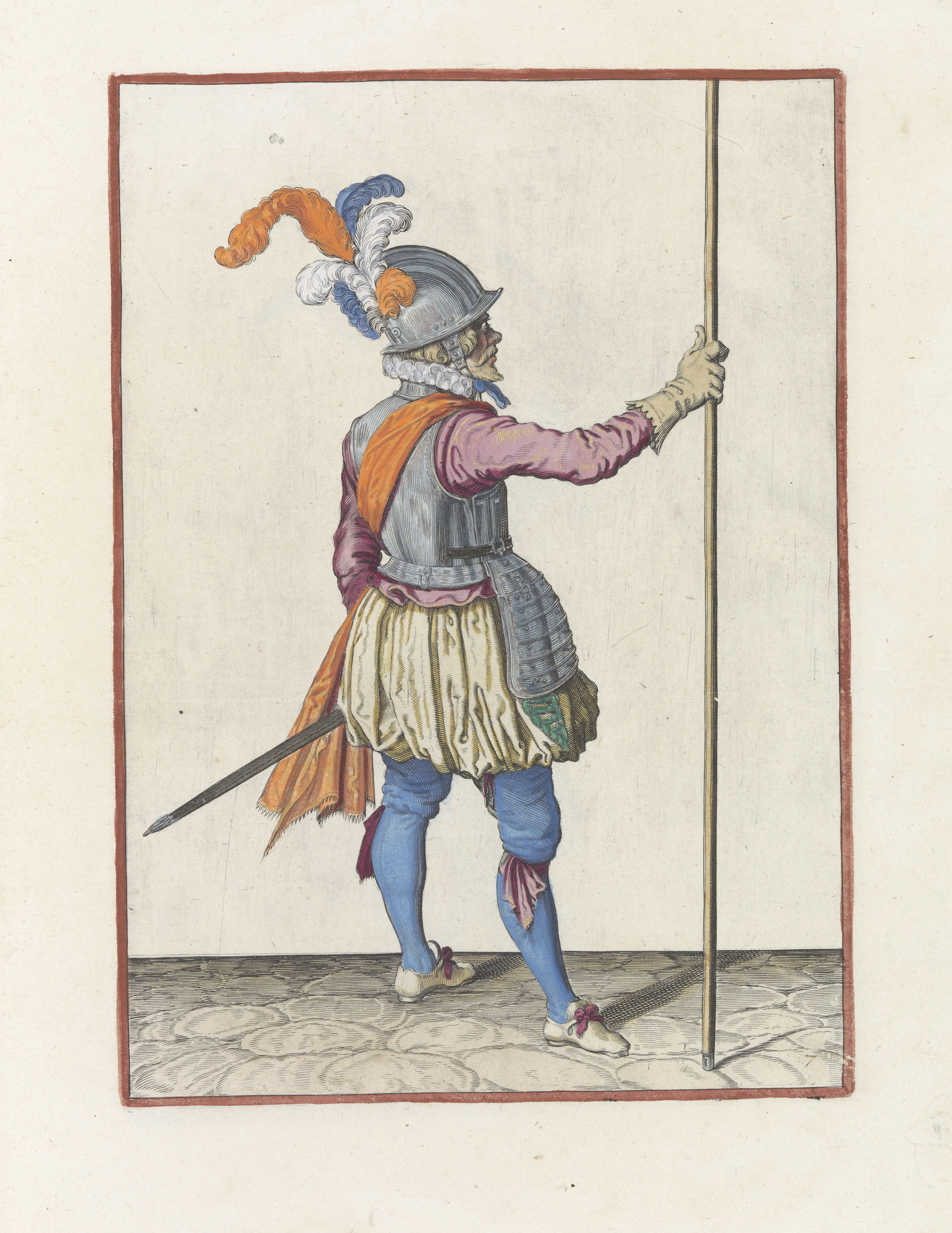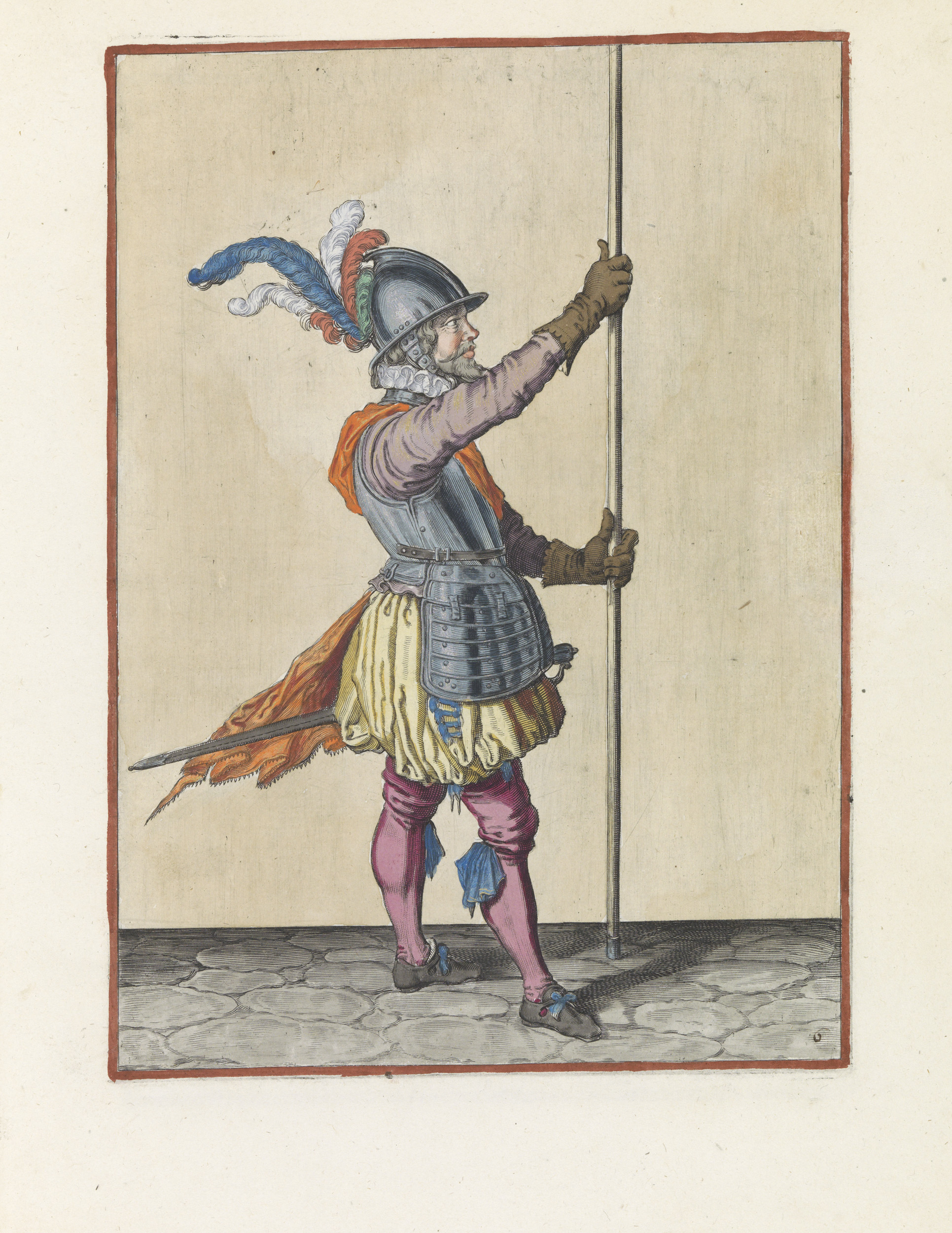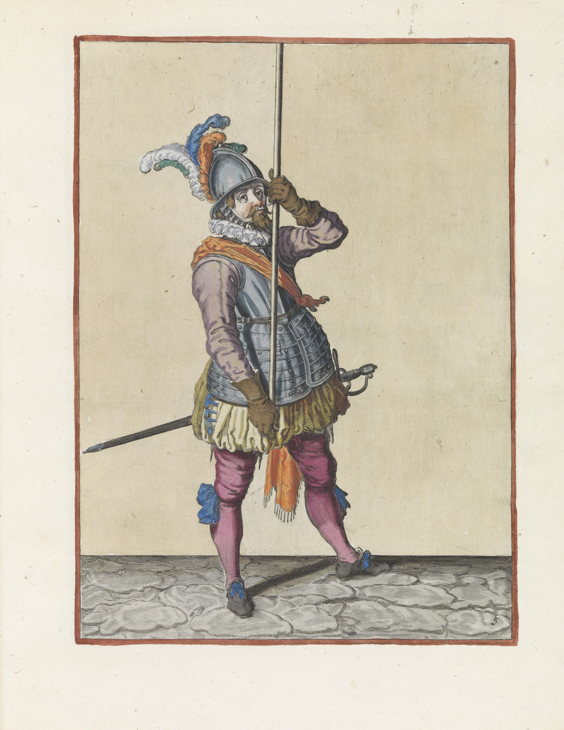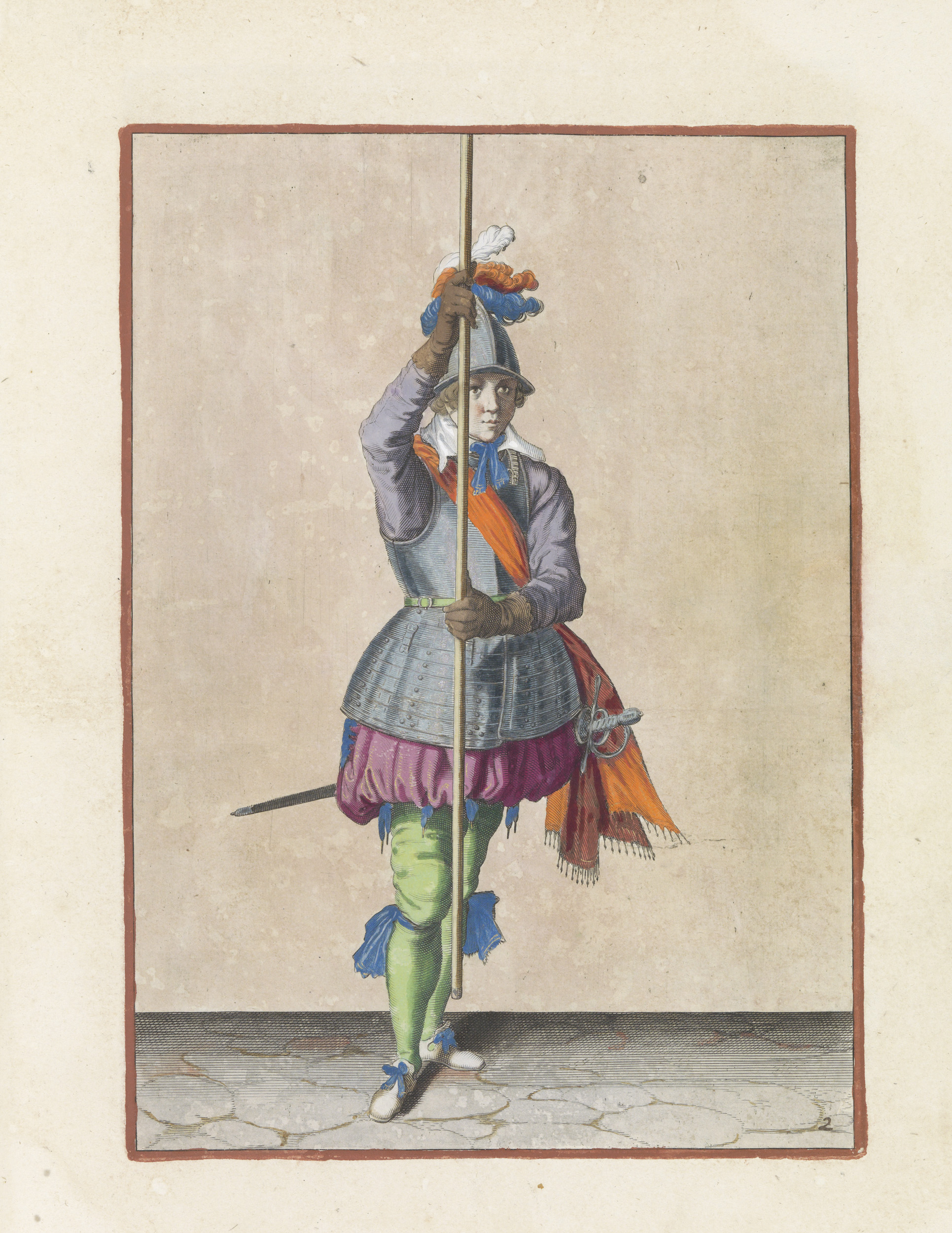 Soldaat, naar links gekeerd, die zijn spies met beid...