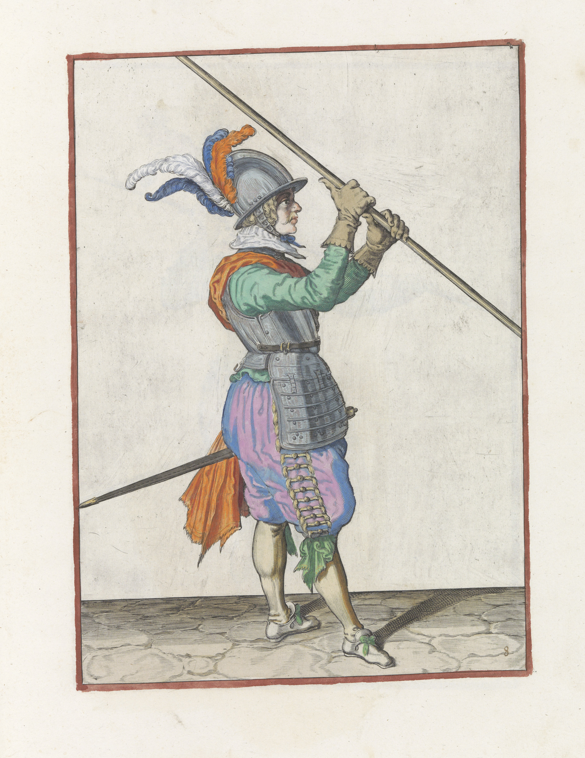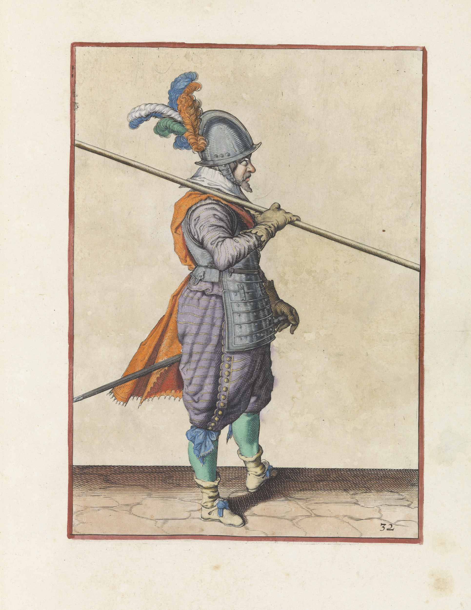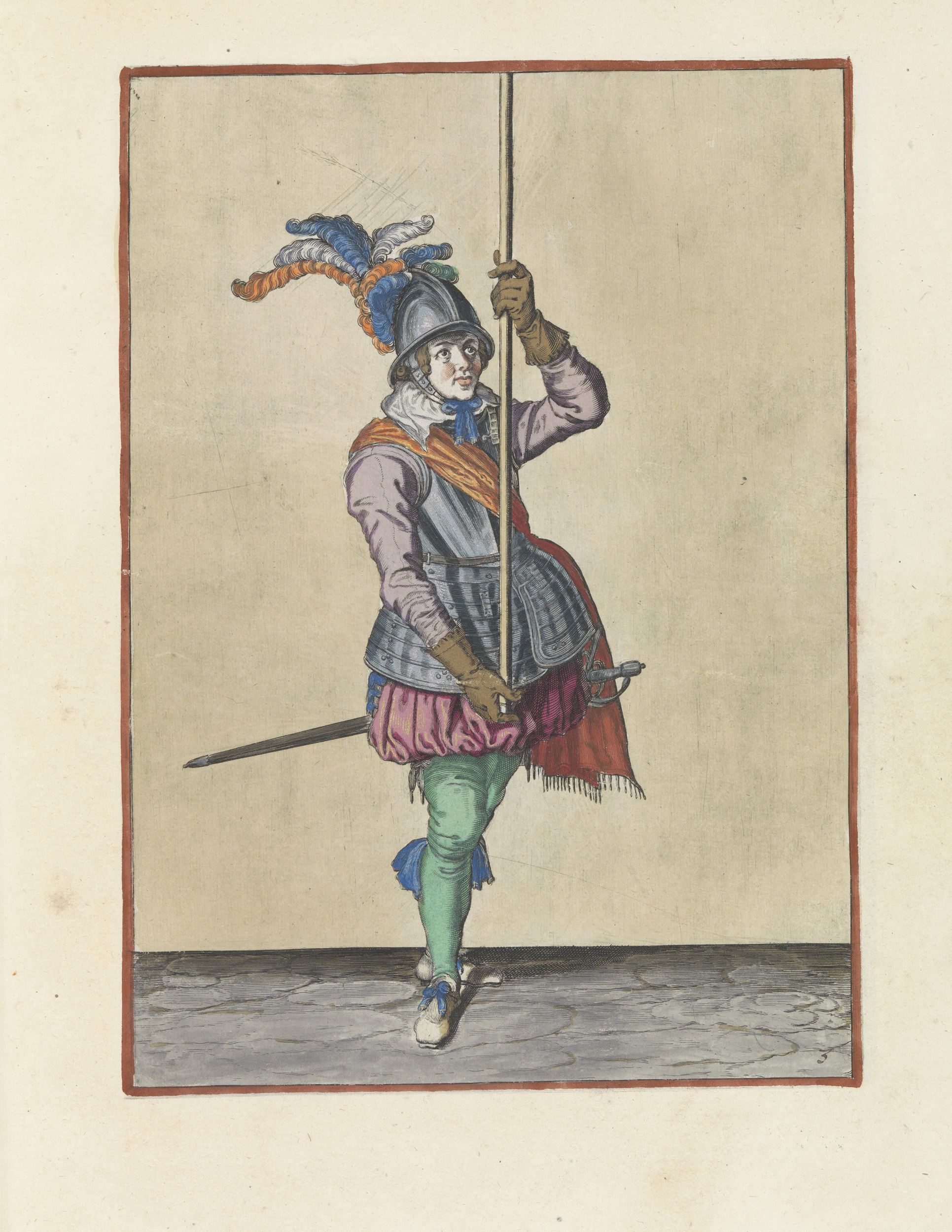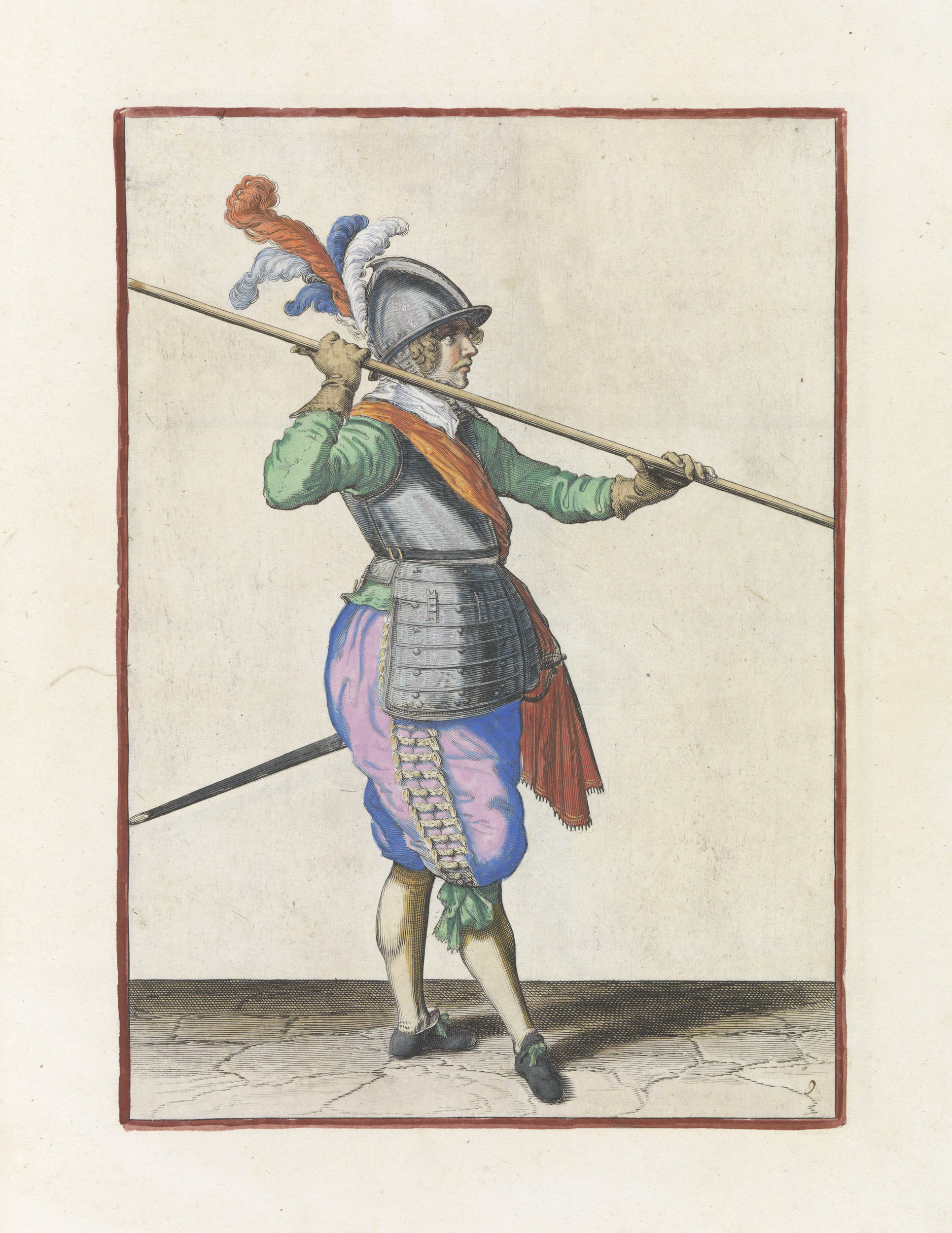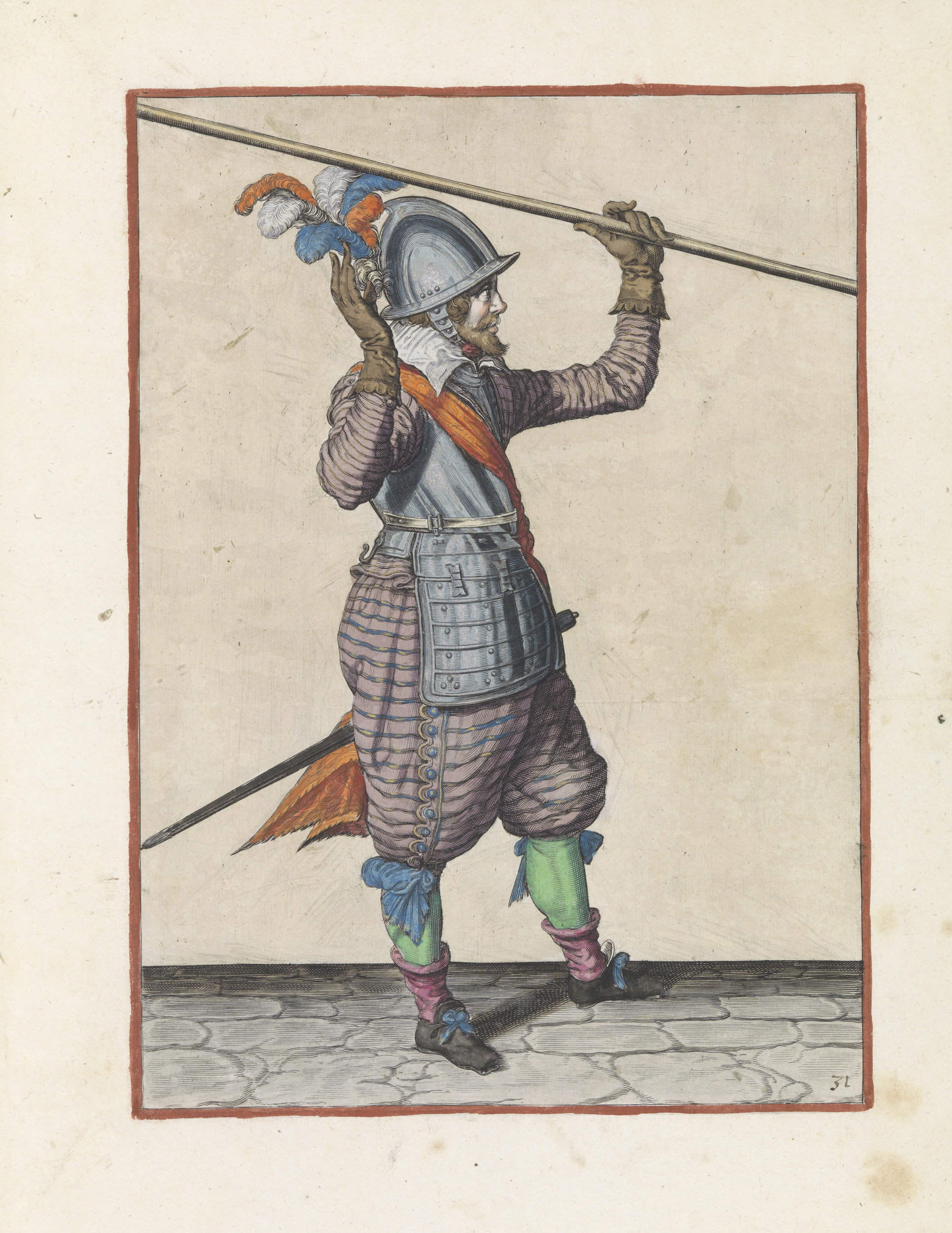 Soldaat, naar links gekeerd, die zijn spies met beid...