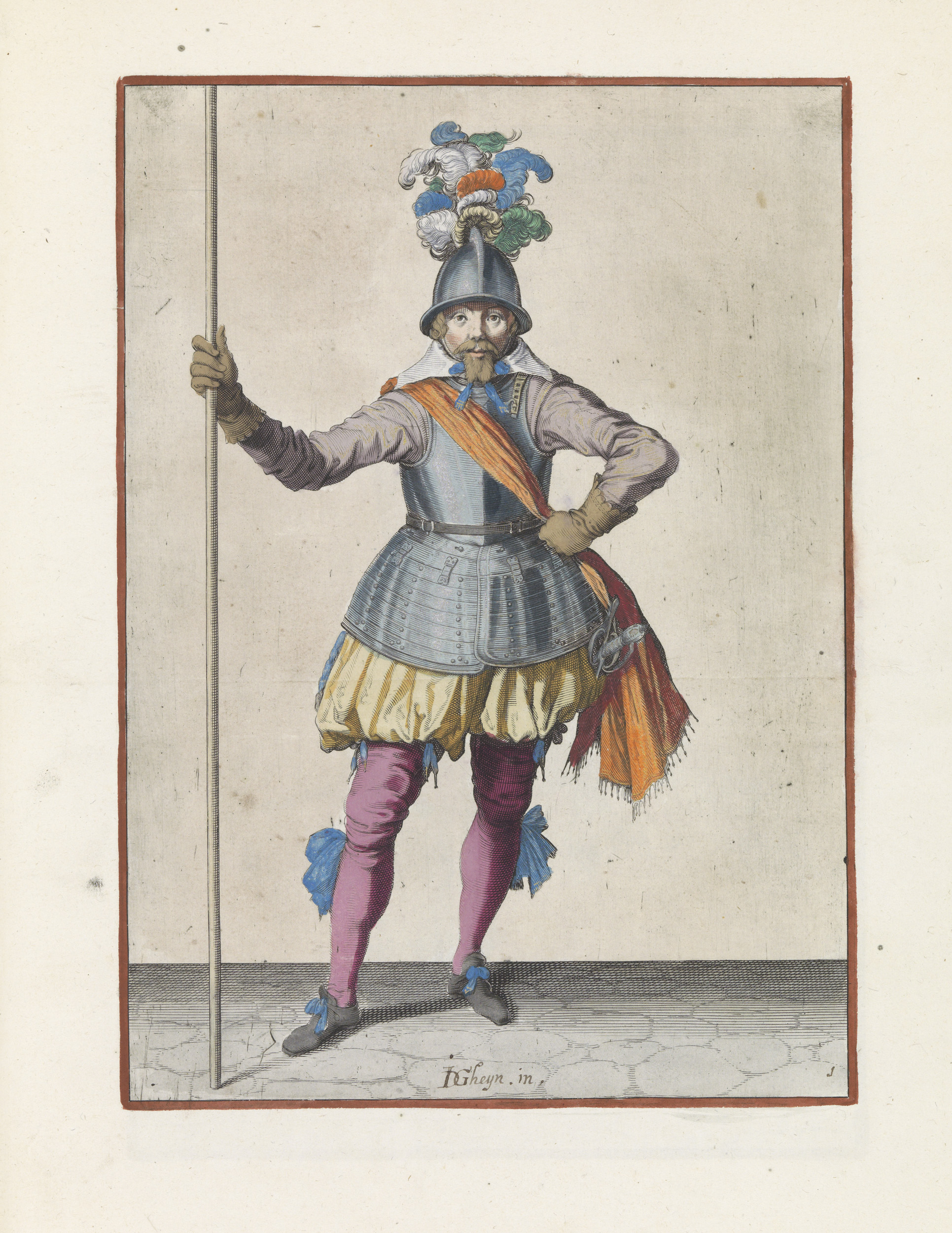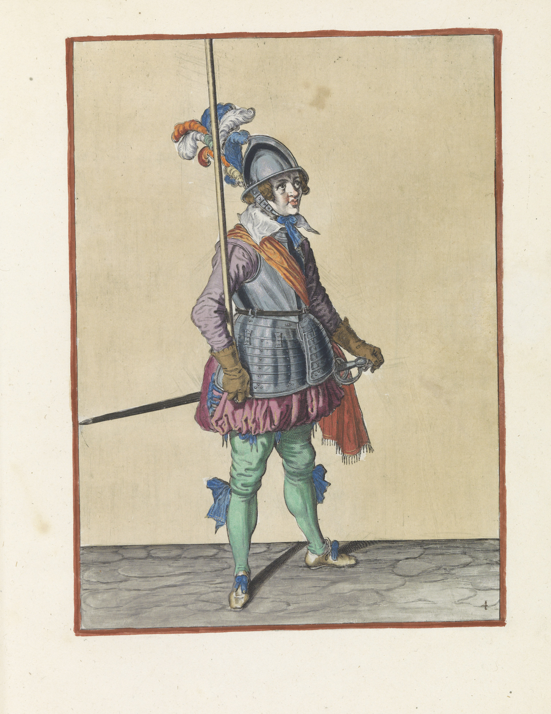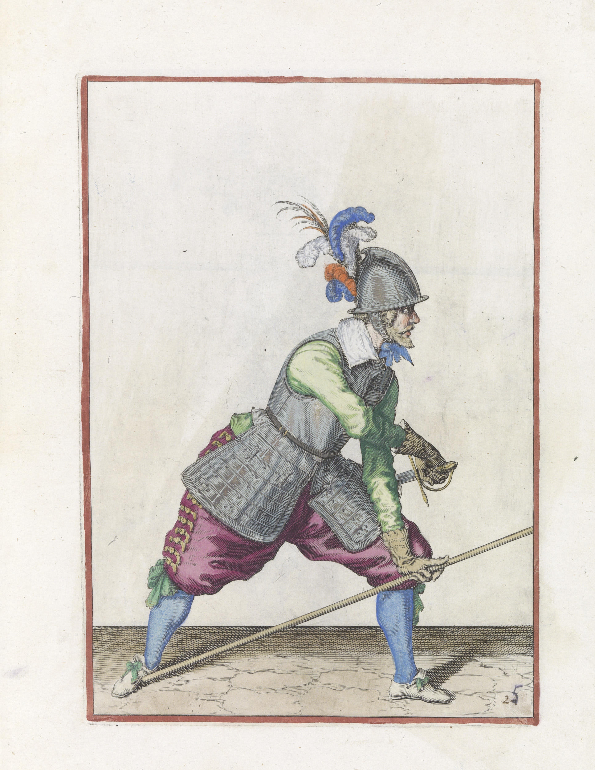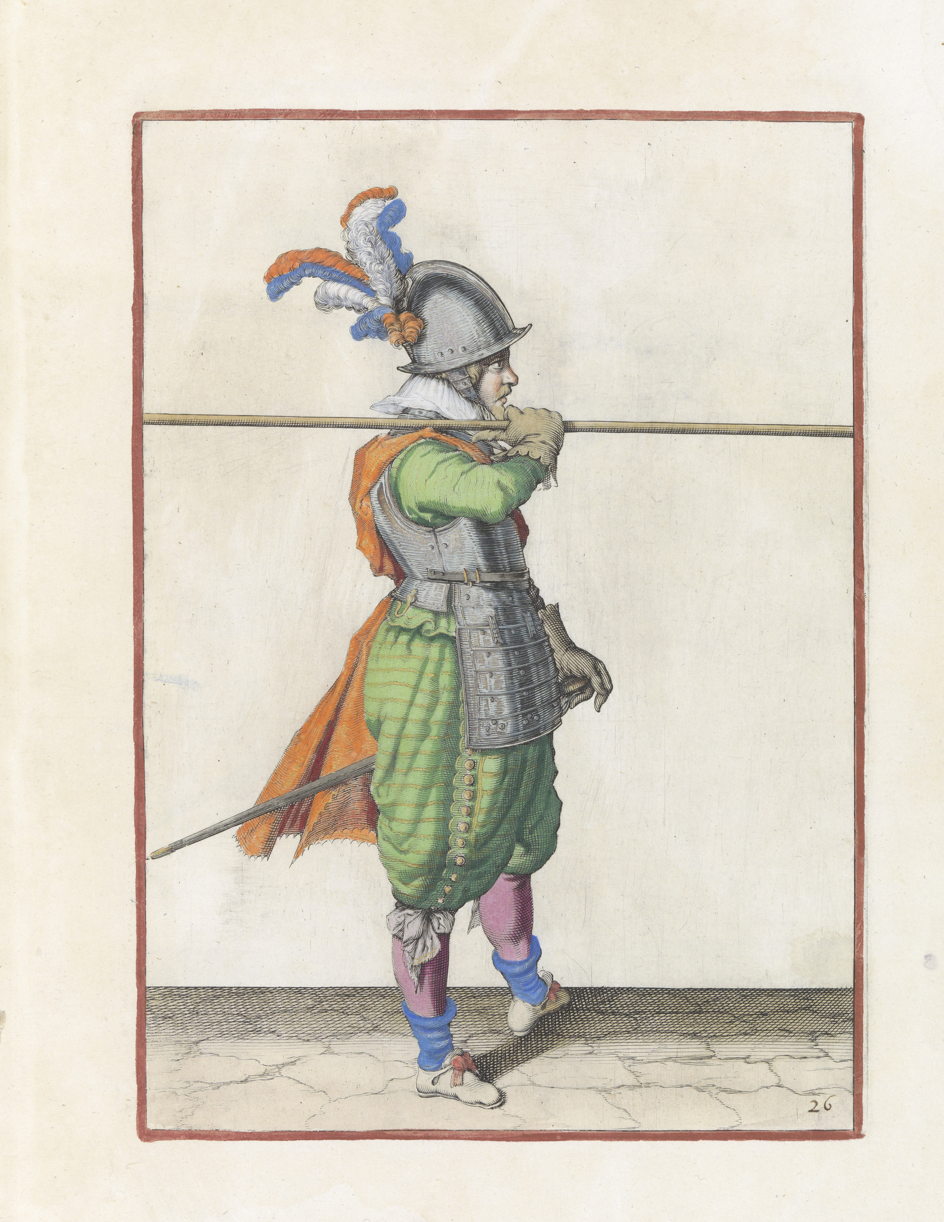 Soldaat, naar links gekeerd, die zijn spies met beid...