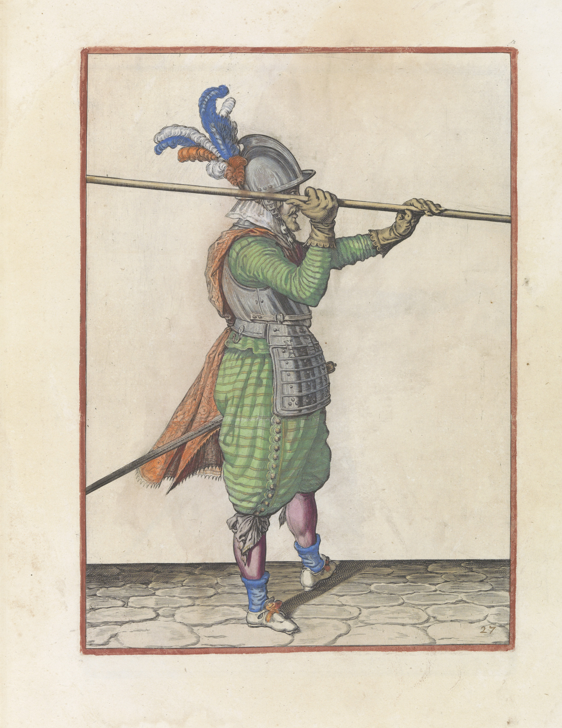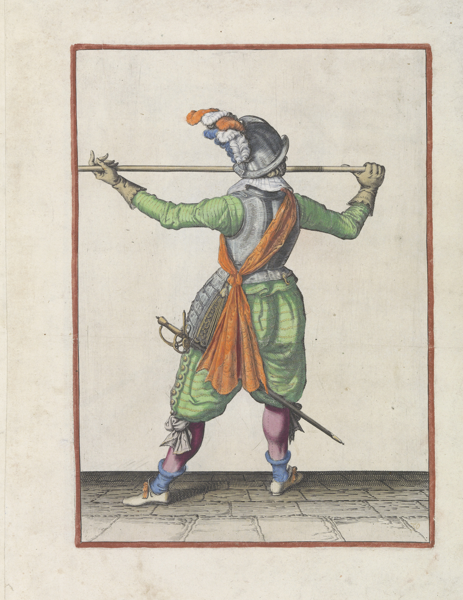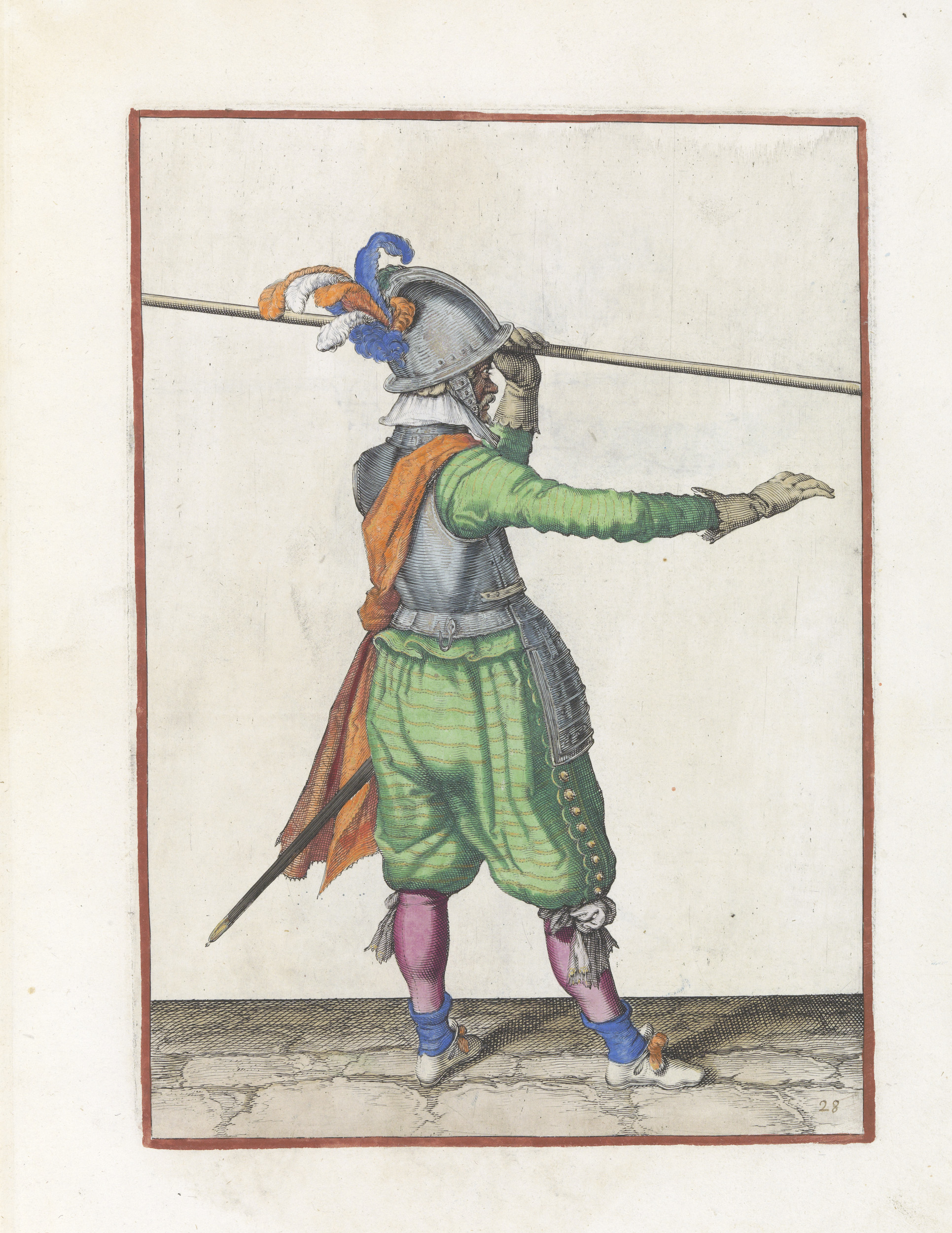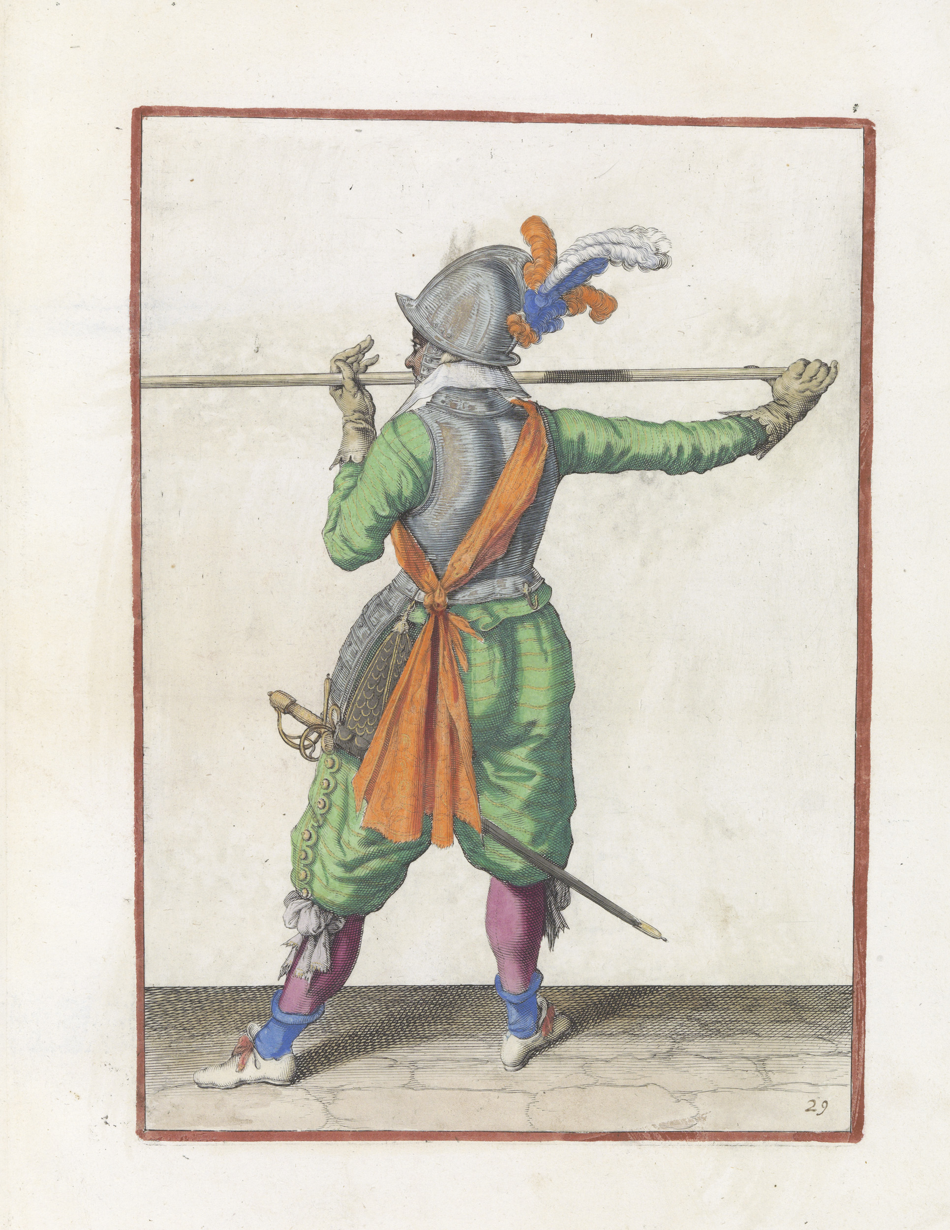 Soldaat, op de rug gezien, die zijn spies met beide ...