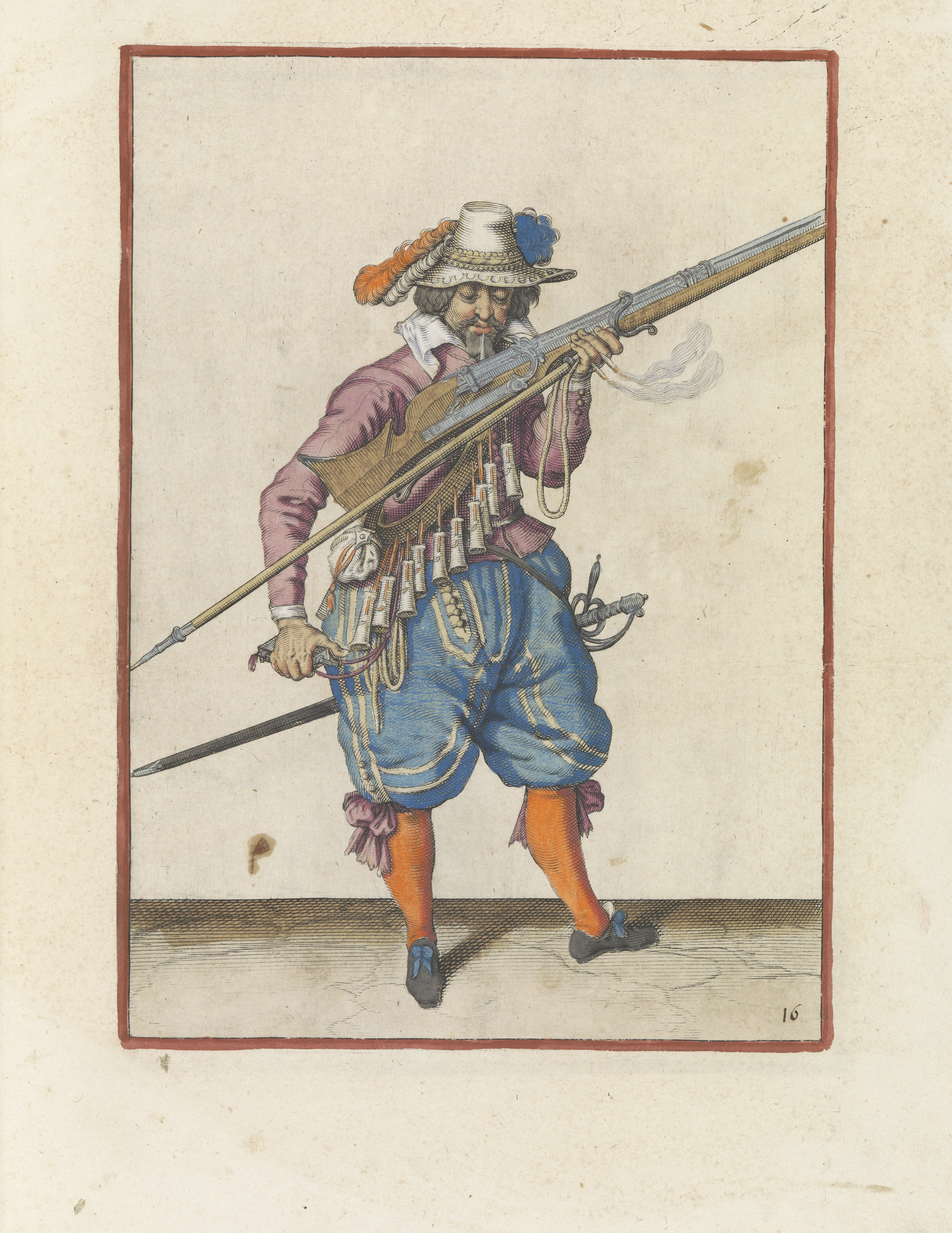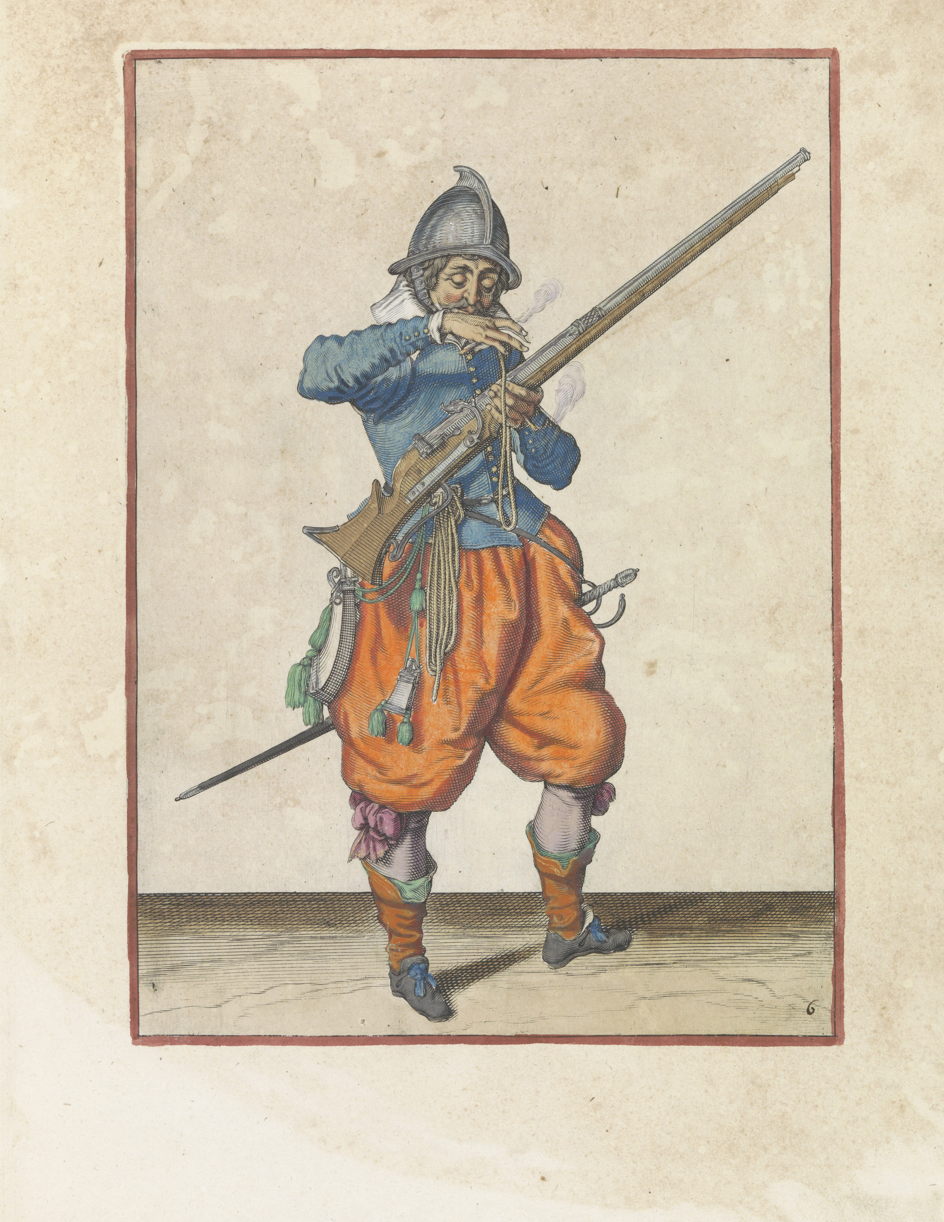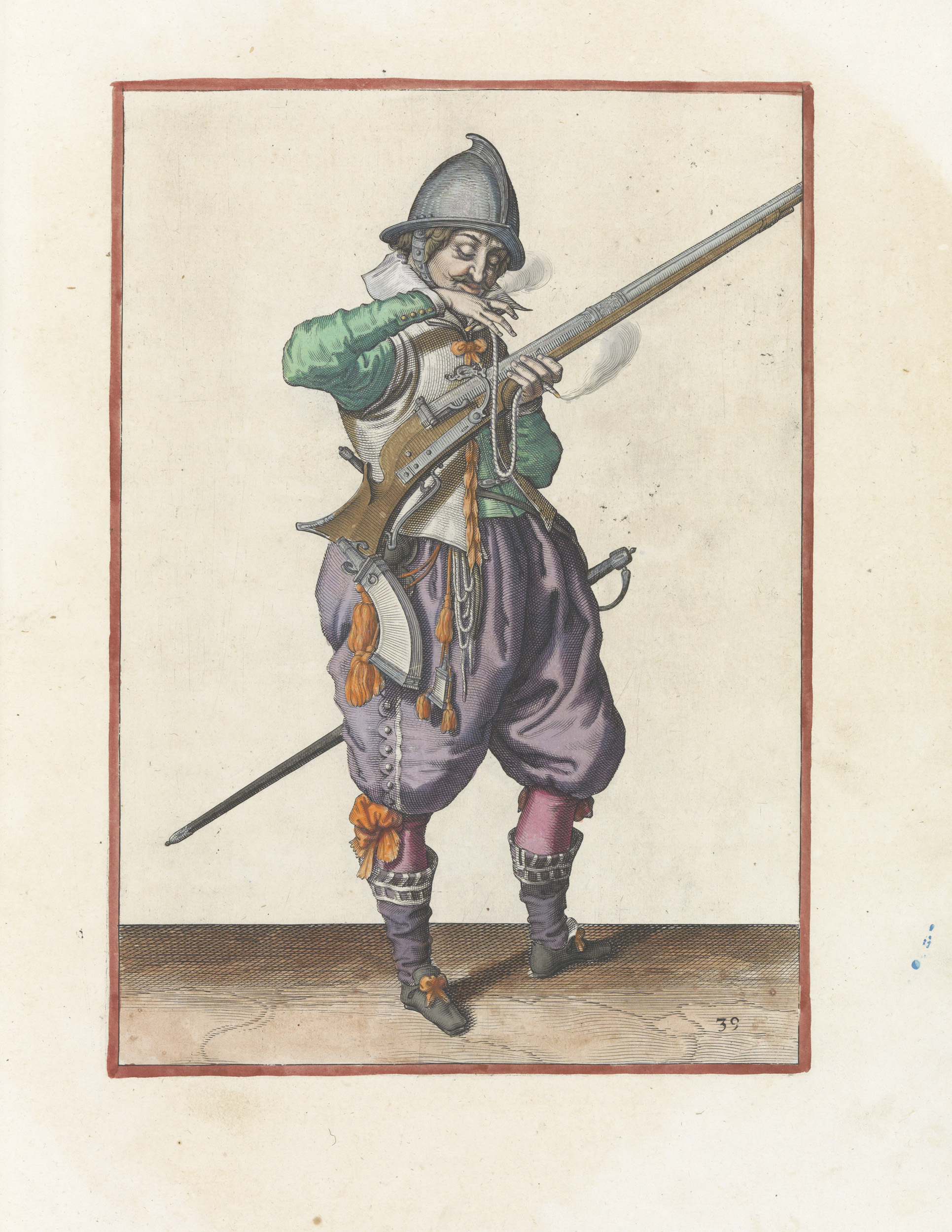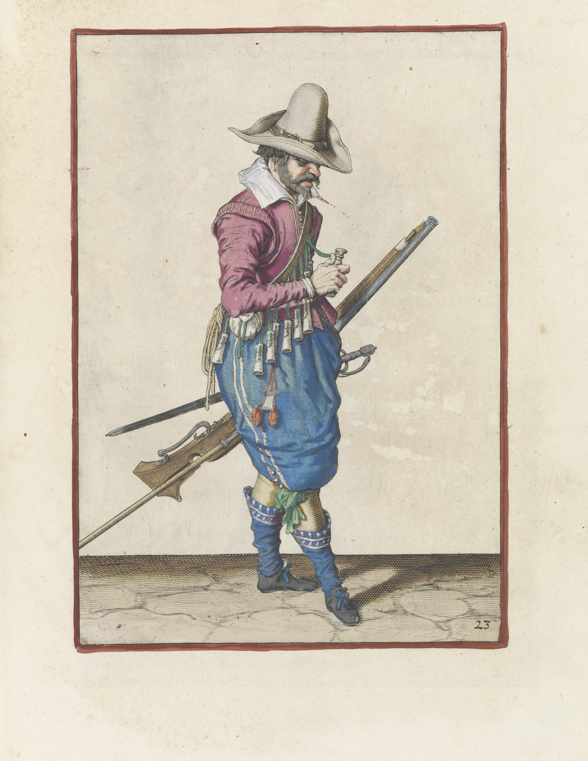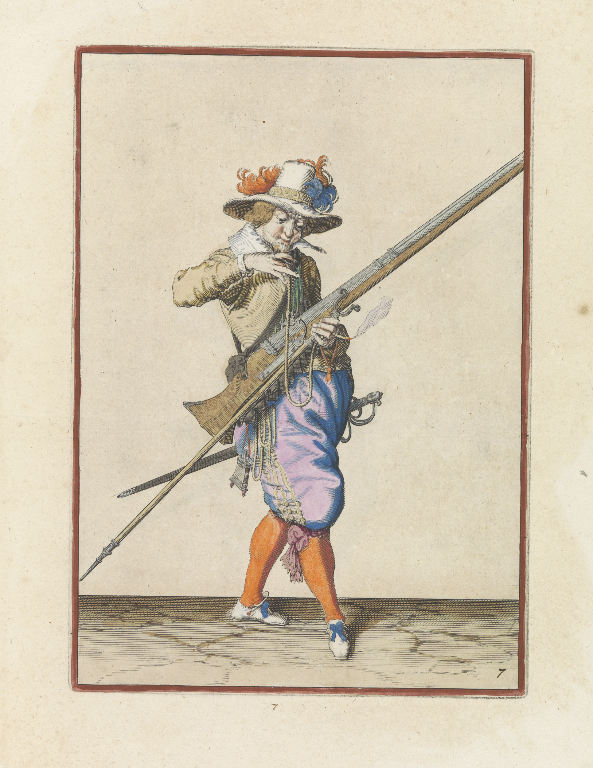 Soldaat met een musket die zijn lont naar zijn mond ...
