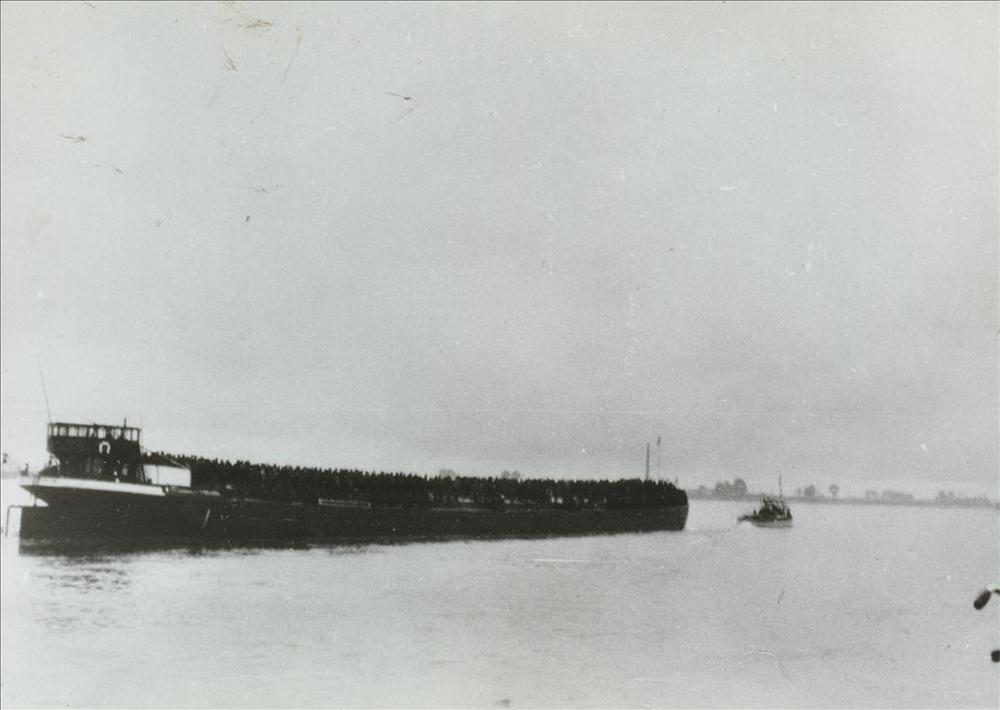 Rijnaak met Belgische krijgsgevangenen te Ooij